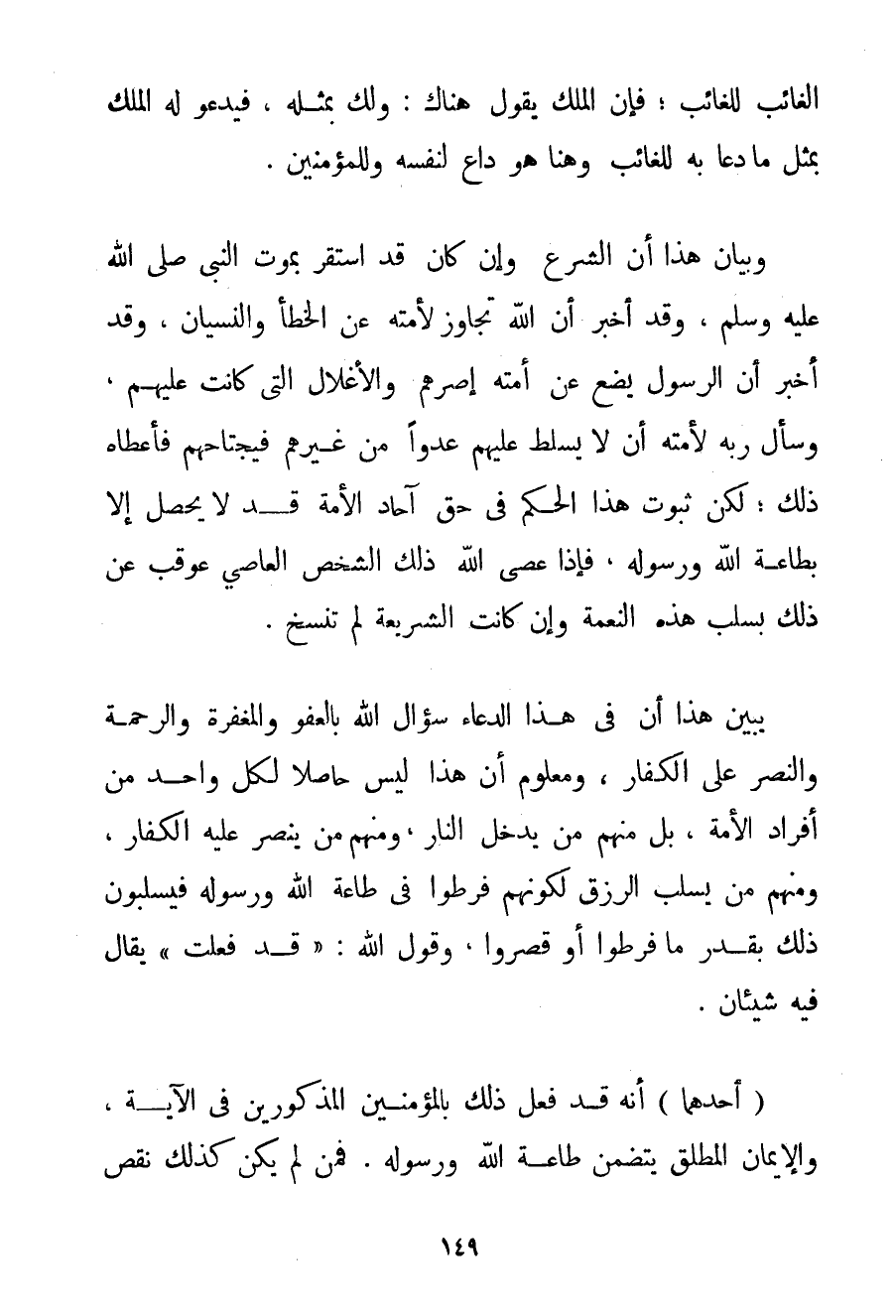 الْغَائِبِ لِلْغَائِبِ؛ فَإِنَّ الْمَلَكَ يَقُولُ هُنَاكَ: وَلَك بِمِثْلِهِ فَيَدْعُو لَهُ الْمَلَكُ بِمِثْلِ مَا دَعَا بِهِ لِلْغَائِبِ وَهُنَا هُوَ دَاعٍ لِنَفْسِهِ وَلِلْمُؤْمِنِينَ. وَبَيَانُ هَذَا أَنَّ الشَّرْعَ وَإِنْ كَانَ قَدْ اسْتَقَرَّ بِمَوْتِ النَّبِيِّ صَلَّى اللَّهُ عَلَيْهِ وَسَلَّمَ وَقَدْ أَخْبَرَ أَنَّ اللَّهَ تَجَاوَزَ لِأُمَّتِهِ عَنْ الْخَطَأِ وَالنِّسْيَانِ وَقَدْ أَخْبَرَ أَنَّ الرَّسُولَ يَضَعُ عَنْ أُمَّتِهِ إصْرَهُمْ وَالْأَغْلَالَ الَّتِي كَانَتْ عَلَيْهِمْ وَسَأَلَ رَبَّهُ لِأُمَّتِهِ أَنْ لَا يُسَلِّطَ عَلَيْهِمْ عَدُوًّا مِنْ غَيْرِهِمْ فَيَجْتَاحُهُمْ فَأَعْطَاهُ ذَلِكَ؛ لَكِنَّ ثُبُوتَ هَذَا الْحُكْمِ فِي حَقِّ آحَادِ الْأُمَّةِ قَدْ لَا يَحْصُلُ إلَّا بِطَاعَةِ اللَّهِ وَرَسُولِهِ فَإِذَا عَصَى اللَّهَ ذَلِكَ الشَّخْصُ الْعَاصِي عُوقِبَ عَنْ ذَلِكَ بِسَلْبِ هَذِهِ النِّعْمَةِ وَإِنْ كَانَتْ الشَّرِيعَةُ لَمْ تُنْسَخُ. يُبَيِّنُ هَذَا أَنَّ فِي هَذَا الدُّعَاءِ سُؤَالَ اللَّهِ بِالْعَفْوِ وَالْمَغْفِرَةِ وَالرَّحْمَةِ وَالنَّصْرِ عَلَى الْكُفَّارِ وَمَعْلُومٌ أَنَّ هَذَا لَيْسَ حَاصِلًا لِكُلِّ وَاحِدٍ مِنْ أَفْرَادِ الْأُمَّةِ بَلْ مِنْهُمْ مَنْ يَدْخُلُ النَّارَ وَمِنْهُمْ مَنْ يُنْصَرُ عَلَيْهِ الْكُفَّارُ وَمِنْهُمْ مَنْ يُسْلَبُ الرِّزْقَ لِكَوْنِهِمْ فَرَّطُوا فِي طَاعَةِ اللَّهِ وَرَسُولِهِ فَيُسْلَبُونَ ذَلِكَ بِقَدْرِ مَا فَرَّطُوا أَوْ قَصَّرُوا وَقَوْلُ اللَّهِ: " قَدْ فَعَلْت " يُقَالُ فِيهِ شَيْئَانِ.