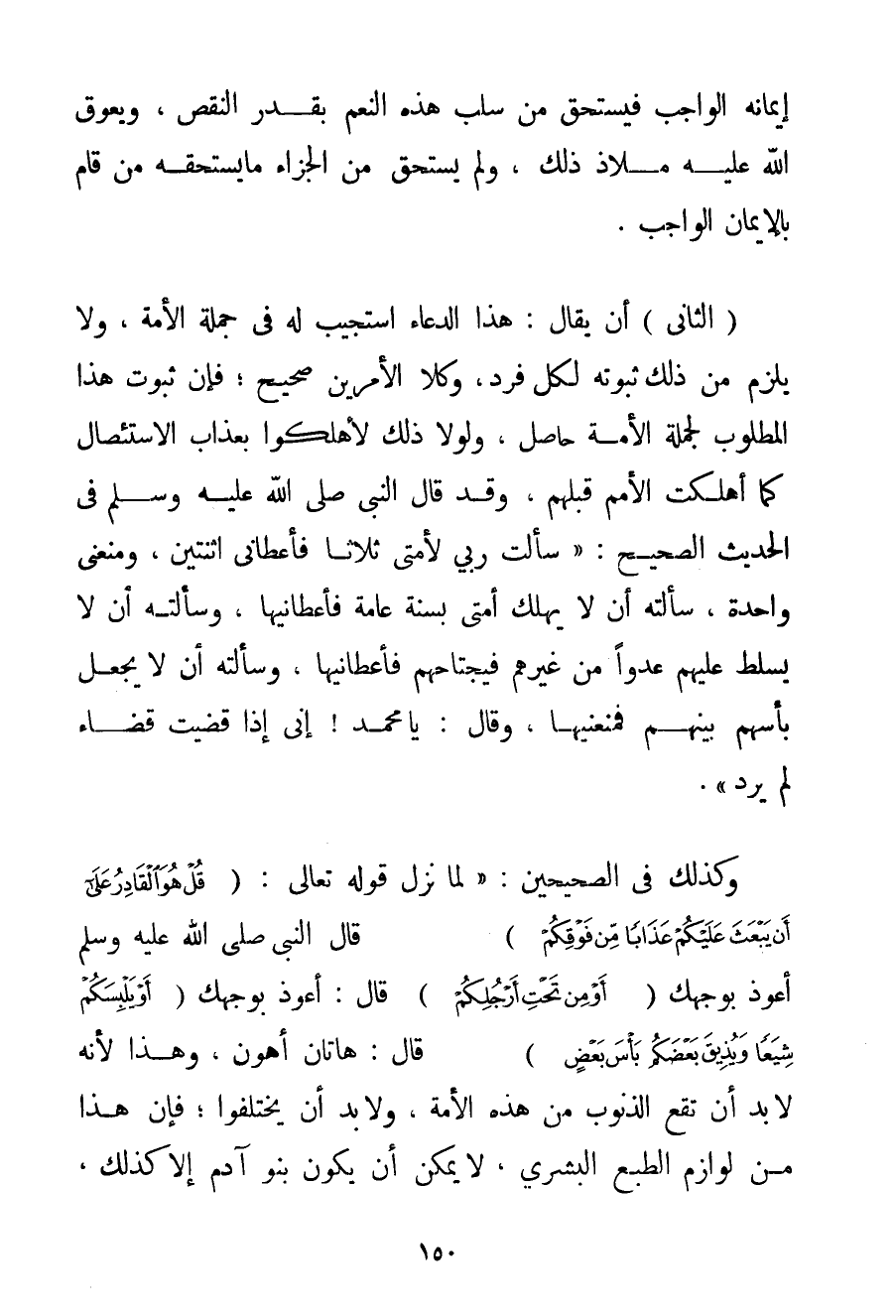 الثَّانِي: أَنْ يُقَالَ: هَذَا الدُّعَاءُ اُسْتُجِيبَ لَهُ فِي جُمْلَةِ الْأَمَةِ وَلَا يَلْزَمُ مِنْ ذَلِكَ ثُبُوتُهُ لِكُلِّ فَرْدٍ وَكِلَا الْأَمْرَيْنِ صَحِيحٌ؛ فَإِنَّ ثُبُوتَ هَذَا الْمَطْلُوبِ لِجُمْلَةِ الْأُمَّةِ حَاصِلٌ وَلَوْلَا ذَلِكَ لَأُهْلِكُوا بِعَذَابِ الِاسْتِئْصَالِ كَمَا أُهْلِكَتْ الْأُمَمُ قَبْلَهُمْ. وَقَدْ قَالَ النَّبِيُّ صَلَّى اللَّهُ عَلَيْهِ وَسَلَّمَ فِي الْحَدِيثِ الصَّحِيحِ: {سَأَلْت رَبِّي لِأُمَّتِي ثَلَاثًا فَأَعْطَانِي اثْنَتَيْنِ وَمَنَعَنِي وَاحِدَةً سَأَلْته أَنْ لَا يَهْلِكَ أُمَّتِي بِسَنَةِ عَامَّةٍ فَأَعْطَانِيهَا وَسَأَلْته أَنْ لَا يُسَلِّطَ عَلَيْهِمْ عَدُوًّا مِنْ غَيْرِهِمْ فَيَجْتَاحُهُمْ فَأَعْطَانِيهَا وَسَأَلْته أَنْ لَا يَجْعَلَ بَأْسَهُمْ بَيْنَهُمْ فَمَنَعَنِيهَا. وَقَالَ: يَا مُحَمَّدُ إنِّي إذَا قَضَيْت قَضَاءً لَمْ يُرَدَّ} . وَكَذَلِكَ فِي الصَّحِيحَيْنِ: {لَمَّا نَزَلَ قَوْله تَعَالَى {قُلْ هُوَ الْقَادِرُ عَلَى أَنْ يَبْعَثَ عَلَيْكُمْ عَذَابًا مِنْ فَوْقِكُمْ} قَالَ النَّبِيُّ صَلَّى اللَّهُ عَلَيْهِ وَسَلَّمَ أَعُوذُ بِوَجْهِك {أَوْ مِنْ تَحْتِ أَرْجُلِكُمْ} قَالَ: أَعُوذُ بِوَجْهِك {أَوْ يَلْبِسَكُمْ شِيَعًا وَيُذِيقَ بَعْضَكُمْ بَأْسَ بَعْضٍ} قَالَ: هَاتَانِ أَهْوَنُ} وَهَذَا لِأَنَّهُ لَا بُدَّ أَنْ تَقَعَ الذُّنُوبُ مِنْ هَذِهِ الْأُمَّةِ وَلَا بُدَّ أَنْ يَخْتَلِفُوا؛ فَإِنَّ هَذَا مِنْ لَوَازِمَ الطَّبْعِ الْبَشَرِيِّ لَا يُمْكِنُ أَنْ يَكُونَ بَنُو آدَمَ إلَّا كَذَلِكَ