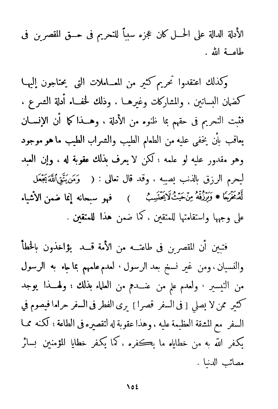 الْأَدِلَّةِ الدَّالَّةِ عَلَى الْحِلِّ كَانَ عَجْزُهُ سَبَبًا لِلتَّحْرِيمِ فِي حَقِّ الْمُقَصِّرِينَ فِي طَاعَةِ اللَّهِ. وَكَذَلِكَ اعْتَقَدُوا تَحْرِيمَ كَثِيرٍ مِنْ الْمُعَامَلَاتِ الَّتِي يَحْتَاجُونَ إلَيْهَا كَضَمَانِ الْبَسَاتِينِ وَالْمُشَارَكَاتِ وَغَيْرِهَا وَذَلِكَ لِخَفَاءِ أَدِلَّةِ الشَّرْعِ فَثَبَتَ التَّحْرِيمُ فِي حَقِّهِمْ بِمَا ظَنُّوهُ مِنْ الْأَدِلَّةِ وَهَذَا كَمَا أَنَّ الْإِنْسَانَ يُعَاقَبُ بِأَنْ يُخْفَى عَلَيْهِ مِنْ الطَّعَامِ الطَّيِّبِ وَالشَّرَابِ الطَّيِّبِ مَا هُوَ مَوْجُودٌ وَهُوَ مَقْدُورٌ عَلَيْهِ لَوْ عَلِمَهُ؛ لَكِنْ لَا يَعْرِفُ بِذَلِكَ عُقُوبَةً لَهُ وَإِنَّ الْعَبْدَ لَيُحْرَمُ الرِّزْقَ بِالذَّنْبِ يُصِيبُهُ وَقَدْ قَالَ تَعَالَى: {وَمَنْ يَتَّقِ اللَّهَ يَجْعَلْ لَهُ مَخْرَجًا} {وَيَرْزُقْهُ مِنْ حَيْثُ لَا يَحْتَسِبُ} فَهُوَ سُبْحَانَهُ إنَّمَا ضَمِنَ الْأَشْيَاءَ عَلَى وَجْهِهَا وَاسْتِقَامَتِهَا لِلْمُتَّقِينَ كَمَا ضَمِنَ هَذَا لِلْمُتَّقِينَ. فَتَبَيَّنَ أَنَّ الْمُقَصِّرِينَ فِي طَاعَتِهِ مِنْ الْأُمَّةِ قَدْ يُؤَاخَذُونَ بِالْخَطَأِ وَالنِّسْيَانِ وَمِنْ غَيْرِ نَسْخٍ بَعْدَ الرَّسُولِ لِعَدَمِ عِلْمِهِمْ بِمَا جَاءَ بِهِ الرَّسُولُ مِنْ التَّيْسِيرِ وَلِعَدَمِ عِلْمِ مَنْ عِنْدَهُمْ مِنْ الْعُلَمَاءِ بِذَلِكَ؛ وَلِهَذَا يُوجَدُ كَثِيرٌ مِمَّنْ لَا يُصَلِّي فِي السَّفَرِ قَصْرًا يَرَى الْفِطْرَ فِي السَّفَرِ حَرَامًا فَيَصُومُ فِي السَّفَرِ مَعَ الْمَشَقَّةِ الْعَظِيمَةِ عَلَيْهِ وَهَذَا عُقُوبَةٌ لَهُ لِتَقْصِيرِهِ فِي الطَّاعَةِ؛ لَكِنَّهُ مِمَّا يُكَفِّرُ اللَّهُ بِهِ مِنْ خَطَايَاهُ مَا يُكَفِّرُهُ كَمَا يُكَفِّرُ خَطَايَا الْمُؤْمِنِينَ بِسَائِرِ مَصَائِبِ الدُّنْيَا.