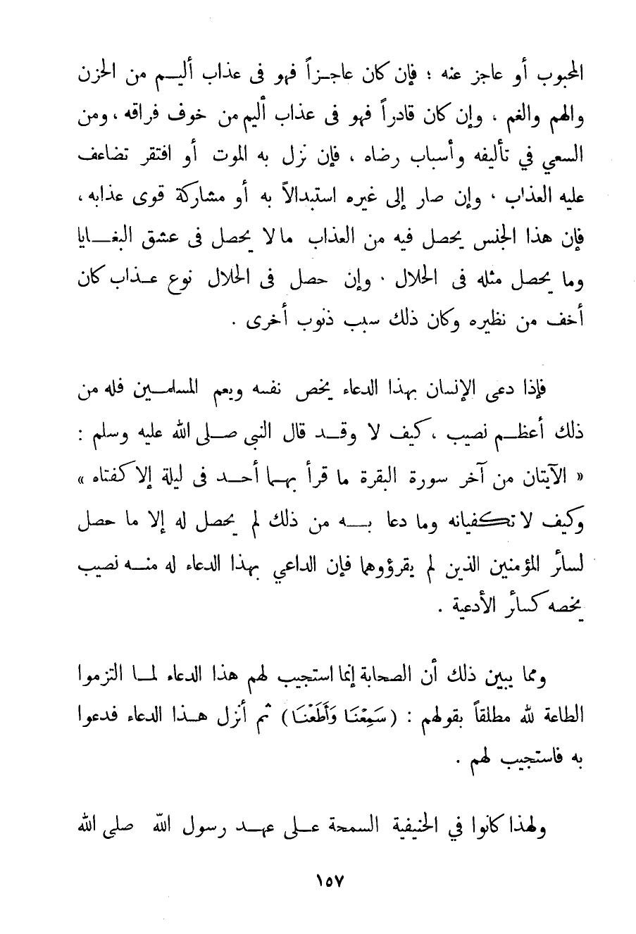 الْمَحْبُوبِ أَوْ عَاجِزٌ عَنْهُ؛ فَإِنْ كَانَ عَاجِزًا فَهُوَ فِي عَذَابٍ أَلِيمٍ مِنْ الْحُزْنِ وَالْهَمِّ وَالْغَمِّ وَإِنْ كَانَ قَادِرًا فَهُوَ فِي عَذَابٍ أَلِيمٍ مِنْ خَوْفِ فِرَاقِهِ وَمِنْ السَّعْيِ فِي تَأْلِيفِهِ وَأَسْبَابِ رِضَاهُ فَإِنْ نَزَلَ بِهِ الْمَوْتُ أَوْ افْتَقَرَ تَضَاعَفَ عَلَيْهِ الْعَذَابُ وَإِنْ صَارَ إلَى غَيْرِهِ اسْتِبْدَالًا بِهِ أَوْ مُشَارَكَةً قَوِيَ عَذَابُهُ فَإِنَّ هَذَا الْجِنْسَ يَحْصُلُ فِيهِ مِنْ الْعَذَابِ مَا لَا يَحْصُلُ فِي عِشْقِ الْبَغَايَا وَمَا يَحْصُلُ مِثْلُهُ فِي الْحَلَالِ وَإِنْ حَصَلَ فِي الْحَلَالِ نَوْعُ عَذَابٍ كَانَ أَخَفَّ مِنْ نَظِيرِهِ وَكَانَ ذَلِكَ سَبَبَ ذُنُوبٍ أُخْرَى. فَإِذَا دَعَا الْإِنْسَانُ بِهَذَا الدُّعَاءِ يَخُصُّ نَفْسَهُ وَيَعُمُّ الْمُسْلِمِينَ فَلَهُ مِنْ ذَلِكَ أَعْظَمُ نَصِيبٍ كَيْفَ لَا وَقَدْ قَالَ النَّبِيُّ صَلَّى اللَّهُ عَلَيْهِ وَسَلَّمَ {الْآيَتَانِ مِنْ آخِرِ سُورَةِ الْبَقَرَةِ مَا قَرَأَ بِهِمَا أَحَدٌ فِي لَيْلَةٍ إلَّا كَفَتَاهُ} وَكَيْفَ لَا تَكْفِيَانِهِ وَمَا دَعَا بِهِ مِنْ ذَلِكَ لَمْ يَحْصُلْ لَهُ إلَّا مَا حَصَلَ لِسَائِرِ الْمُؤْمِنِينَ الَّذِينَ لَمْ يَقْرَءُوهُمَا فَإِنَّ الدَّاعِيَ بِهَذَا الدُّعَاءِ لَهُ مِنْهُ نَصِيبٌ يَخُصُّهُ كَسَائِرِ الْأَدْعِيَةِ. وَمِمَّا يُبَيِّنُ ذَلِكَ أَنَّ الصَّحَابَةَ إنَّمَا اُسْتُجِيبَ لَهُمْ هَذَا الدُّعَاءُ لَمَّا الْتَزَمُوا الطَّاعَةَ لِلَّهِ مُطْلَقًا بِقَوْلِهِمْ: {سَمِعْنَا وَأَطَعْنَا} ثُمَّ أُنْزِلَ هَذَا الدُّعَاءُ فَدَعَوْا بِهِ فَاسْتُجِيبَ لَهُمْ. وَلِهَذَا كَانُوا فِي الْحَنِيفِيَّةِ السَّمْحَةِ عَلَى عَهْدِ رَسُولِ اللَّهِ صَلَّى اللَّهُ عَلَيْهِ وَسَلَّمَ
