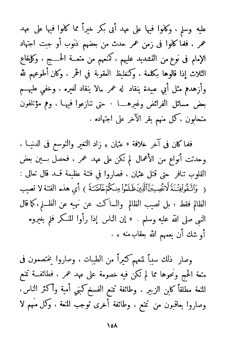 وَكَانُوا فِيهَا عَلَى عَهْدِ أَبِي بَكْرٍ خَيْرًا مِمَّا كَانُوا فِيهَا عَلَى عَهْدِ عُمَرَ فَلَمَّا كَانُوا فِي زَمَنِ عُمَرَ حَدَثَ مِنْ بَعْضِهِمْ ذُنُوبٌ أَوْجَبَتْ اجْتِهَادَ الْإِمَامِ فِي نَوْعٍ مِنْ التَّشْدِيدِ عَلَيْهِمْ كَمَنْعِهِمْ مِنْ مُتْعَةِ الْحَجِّ وَكَإِيقَاعِ الثَّلَاثِ إذَا قَالُوهَا بِكَلِمَةِ وَكَتَغْلِيظِ الْعُقُوبَةِ فِي الْخَمْرِ وَكَانَ أَطْوَعُهُمْ لِلَّهِ وَأَزْهَدُهُمْ مِثْلَ أَبِي عُبَيْدَةَ يَنْقَادُ لَهُ عُمَرُ مَا لَا يَنْقَادُ لِغَيْرِهِ وَخَفِيَ عَلَيْهِمْ بَعْضُ مَسَائِلِ الْفَرَائِضِ وَغَيْرِهَا حَتَّى تَنَازَعُوا فِيهَا وَهُمْ مُؤْتَلِفُونَ مُتَحَابُّونَ كُلٌّ مِنْهُمْ يُقِرُّ الْآخَرَ عَلَى اجْتِهَادِهِ. فَلَمَّا كَانَ فِي آخِرِ خِلَافَةِ " عُثْمَانَ " زَادَ التَّغَيُّرُ وَالتَّوَسُّعُ فِي الدُّنْيَا وَحَدَثَتْ أَنْوَاعٌ مِنْ الْأَعْمَالِ لَمْ تَكُنْ عَلَى عَهْدِ عُمَرَ فَحَصَلَ بَيْنَ بَعْضِ الْقُلُوبِ تَنَافُرٌ حَتَّى قُتِلَ عُثْمَانُ فَصَارُوا فِي فِتْنَةٍ عَظِيمَةٍ قَدْ قَالَ تَعَالَى: {وَاتَّقُوا فِتْنَةً لَا تُصِيبَنَّ الَّذِينَ ظَلَمُوا مِنْكُمْ خَاصَّةً} أَيْ هَذِهِ الْفِتْنَةُ لَا تُصِيبُ الظَّالِمَ فَقَطْ؛ بَلْ تُصِيبُ الظَّالِمَ وَالسَّاكِتَ عَنْ نَهْيِهِ عَنْ الظُّلْمِ كَمَا قَالَ النَّبِيُّ صَلَّى اللَّهُ عَلَيْهِ وَسَلَّمَ {إنَّ النَّاسَ إذَا رَأَوْا الْمُنْكَرَ فَلَمْ يُغَيِّرُوهُ أَوْشَكَ أَنْ يَعُمَّهُمْ اللَّهُ بِعِقَابِ مِنْهُ} . وَصَارَ ذَلِكَ سَبَبًا لِمَنْعِهِمْ كَثِيرًا مِنْ الطَّيِّبَاتِ وَصَارُوا يَخْتَصِمُونَ فِي مُتْعَةِ الْحَجِّ وَنَحْوِهَا مِمَّا لَمْ تَكُنْ فِيهِ خُصُومَةٌ عَلَى عَهْدِ عُمَرَ فَطَائِفَةٌ تَمْنَعُ الْمُتْعَةَ مُطْلَقًا كَابْنِ الزُّبَيْرِ وَطَائِفَةٌ تَمْنَعُ الْفَسْخَ كَبَنِي أُمِّيَّةَ وَأَكْثَرِ النَّاسِ وَصَارُوا يُعَاقِبُونَ مَنْ تَمَتَّعَ وَطَائِفَةٌ أُخْرَى تُوجِبُ الْمُتْعَةَ وَكُلٌّ مِنْهُمْ لَا