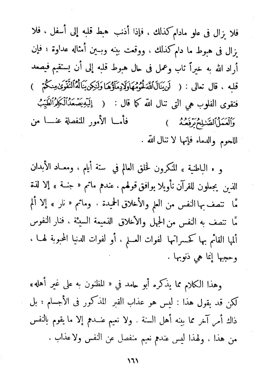 فَلَا يَزَالُ فِي عُلُوٍّ مَا دَامَ كَذَلِكَ فَإِذَا أَذْنَبَ هَبَطَ قَلْبُهُ إلَى أَسْفَلَ فَلَا يَزَالُ فِي هُبُوطٍ مَا دَامَ كَذَلِكَ وَوَقَعَتْ بَيْنَهُ وَبَيْنَ أَمْثَالِهِ عَدَاوَةٌ؛ فَإِنْ أَرَادَ اللَّهُ بِهِ خَيْرًا ثَابَ وَعَمِلَ فِي حَالِ هُبُوطِ قَلْبِهِ إلَى أَنْ يَسْتَقِيمَ فَيَصْعَدُ قَلْبُهُ قَالَ تَعَالَى: {لَنْ يَنَالَ اللَّهَ لُحُومُهَا وَلَا دِمَاؤُهَا وَلَكِنْ يَنَالُهُ التَّقْوَى مِنْكُمْ} فَتَقْوَى الْقُلُوبِ هِيَ الَّتِي تَنَالُ اللَّهَ كَمَا قَالَ: {إلَيْهِ يَصْعَدُ الْكَلِمُ الطَّيِّبُ وَالْعَمَلُ الصَّالِحُ يَرْفَعُهُ} فَأَمَّا الْأُمُورُ الْمُنْفَصِلَةُ عَنَّا مِنْ اللُّحُومِ وَالدِّمَاءِ فَإِنَّهَا لَا تَنَالُ اللَّهَ. و " الْبَاطِنِيَّةُ " الْمُنْكِرُونَ لِخَلْقِ الْعَالَمِ فِي سِتَّةِ أَيَّامٍ وَمُعَادِ الْأَبْدَانِ الَّذِينَ يَجْعَلُونَ لِلْقُرْآنِ تَأْوِيلًا يُوَافِقُ قَوْلَهُمْ عِنْدَهُمْ مَا ثَمَّ " جَنَّةٌ " إلَّا لَذَّةُ مَا تَتَّصِفُ بِهَا النَّفْسُ مِنْ الْعِلْمِ وَالْأَخْلَاقِ الْحَمِيدَةِ وَمَا ثَمَّ " نَارٌ " إلَّا أَلَمُ مَا تَتَّصِفُ بِهِ النَّفْسُ مِنْ الْجَهْلِ وَالْأَخْلَاقِ الذَّمِيمَةِ السَّيِّئَةِ فَنَارُ النُّفُوسِ أَلَمُهَا الْقَائِمُ بِهَا كَحَسَرَاتِهَا لِفَوَاتِ الْعِلْمِ أَوْ لِفَوَاتِ الدُّنْيَا الْمَحْبُوبَةِ لَهَا وَحَجْبُهَا إنَّمَا هِيَ ذُنُوبُهَا. وَهَذَا الْكَلَامُ مِمَّا يَذْكُرُهُ أَبُو حَامِدٍ فِي " الْمَضْنُونِ بِهِ عَلَى غَيْرِ أَهْلِهِ " لَكِنْ قَدْ يَقُولُ هَذَا: لَيْسَ هُوَ عَذَابُ الْقَبْرِ الْمَذْكُورِ فِي الْأَجْسَامِ؛ بَلْ ذَاكَ أَمْرٌ آخَرُ مِمَّا بَيَّنَهُ أَهْلُ السُّنَّةِ. وَلَا نَعِيمَ عِنْدِهِمْ إلَّا مَا يَقُومُ بِالنَّفْسِ مِنْ هَذَا وَلِهَذَا لَيْسَ عِنْدَهُمْ نَعِيمٌ مُنْفَصِلٌ عَنْ النَّفْسِ وَلَا عَذَابٌ.