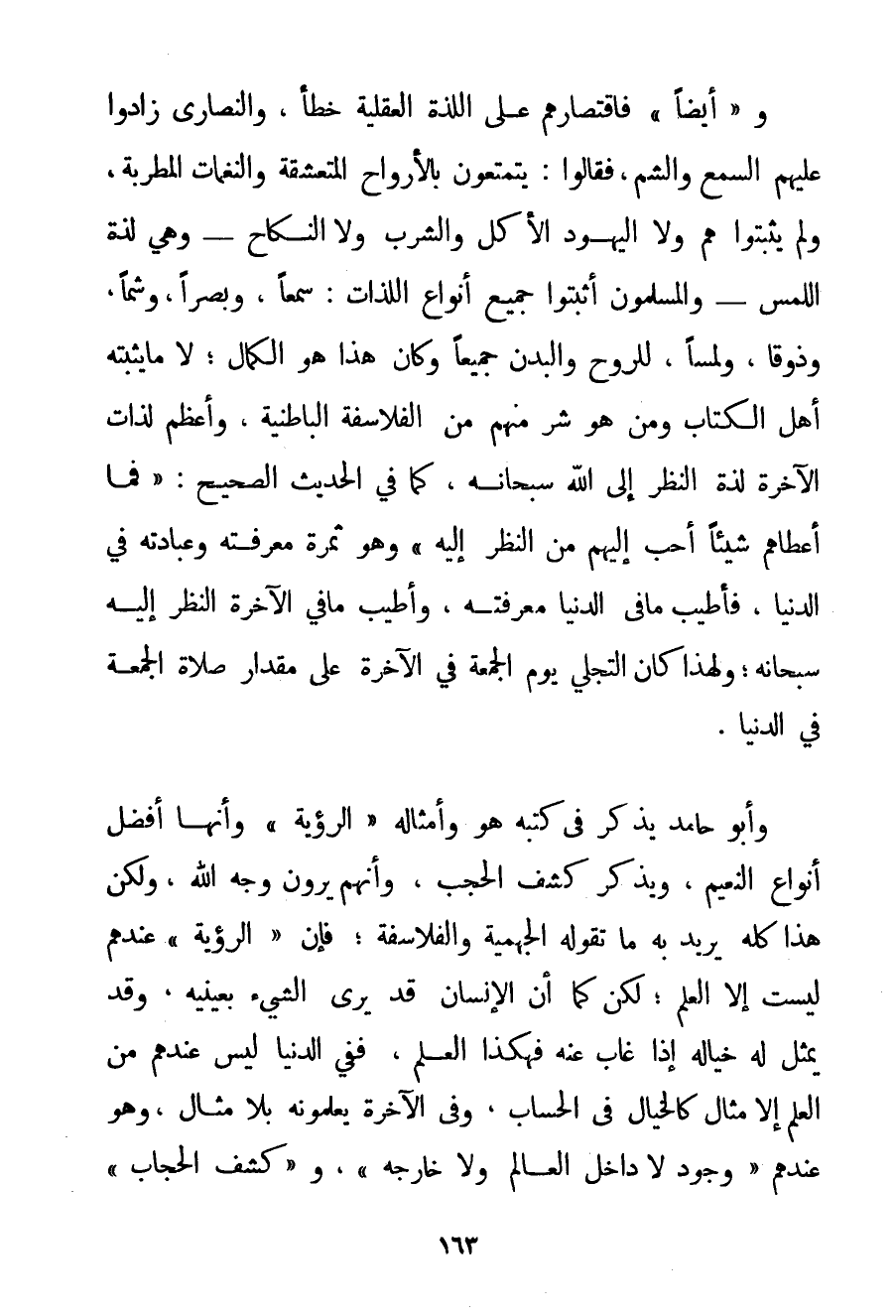 وَ" أَيْضًا " فَاقْتِصَارُهُمْ عَلَى اللَّذَّةِ الْعَقْلِيَّةِ خَطَأٌ وَالنَّصَارَى زَادُوا عَلَيْهِمْ السَّمْعَ وَالشَّمَّ فَقَالُوا: يَتَمَتَّعُونَ بِالْأَرْوَاحِ الْمُتَعَشَّقَةِ وَالنَّغَمَاتِ الْمُطْرِبَةِ وَلَمْ يُثْبِتُوا هُمْ وَلَا الْيَهُودُ الْأَكْلَ وَالشُّرْبَ وَلَا النِّكَاحَ - وَهِيَ لَذَّةُ اللَّمْسِ - وَالْمُسْلِمُونَ أَثْبَتُوا جَمِيعَ أَنْوَاعِ اللَّذَّاتِ: سَمْعًا وَبَصَرًا وَشَمًّا وَذَوْقًا وَلَمْسًا لِلرُّوحِ وَالْبَدَنِ جَمِيعًا وَكَانَ هَذَا هُوَ الْكَمَالُ؛ لَا مَا يُثْبِتُهُ أَهْلُ الْكِتَابِ وَمَنْ هُوَ شَرٌّ مِنْهُمْ مِنْ الْفَلَاسِفَةِ الْبَاطِنِيَّةِ وَأَعْظَمُ لَذَّاتِ الْآخِرَةِ لَذَّةُ النَّظَرِ إلَى اللَّهِ سُبْحَانَهُ كَمَا فِي الْحَدِيثِ الصَّحِيحِ: {فَمَا أَعْطَاهُمْ شَيْئًا أَحَبَّ إلَيْهِمْ مِنْ النَّظَرِ إلَيْهِ} وَهُوَ ثَمَرَةُ مَعْرِفَتِهِ وَعِبَادَتِهِ فِي الدُّنْيَا فَأَطْيَبُ مَا فِي الدُّنْيَا مَعْرِفَتُهُ وَأَطْيَبُ مَا فِي الْآخِرَةِ النَّظَرُ إلَيْهِ سُبْحَانَهُ؛ وَلِهَذَا كَانَ التَّجَلِّي يَوْمَ الْجُمُعَةِ فِي الْآخِرَةِ عَلَى مِقْدَارِ صَلَاةِ الْجُمُعَةِ فِي الدُّنْيَا. وَأَبُو حَامِدٍ يَذْكُرُ فِي كُتُبِهِ هُوَ وَأَمْثَالِهِ " الرُّؤْيَةَ " وَأَنَّهَا أَفْضَلُ أَنْوَاعِ النَّعِيمِ وَيَذْكُرُ كَشْفَ الْحُجُبِ وَأَنَّهُمْ يَرَوْنَ وَجْهَ اللَّهِ وَلَكِنَّ هَذَا كُلَّهُ يُرِيدُ بِهِ مَا تَقُولُهُ الْجَهْمِيَّة وَالْفَلَاسِفَةُ؛ فَإِنَّ " الرُّؤْيَةَ " عِنْدَهُمْ لَيْسَتْ إلَّا الْعِلْمَ؛ لَكِنْ كَمَا أَنَّ الْإِنْسَانَ قَدْ يَرَى الشَّيْءَ بِعَيْنَيْهِ وَقَدْ يُمَثِّلُ لَهُ خَيَالُهُ إذَا غَابَ عَنْهُ فَهَكَذَا الْعِلْمُ فَفِي الدُّنْيَا لَيْسَ عِنْدَهُمْ مِنْ الْعِلْمِ إلَّا مِثَالٌ كَالْخَيَالِ فِي الْحِسَابِ وَفِي الْآخِرَةِ يَعْلَمُونَهُ بِلَا مِثَالٍ وَهُوَ عِنْدُهُمْ " وُجُودٌ لَا دَاخِلَ الْعَالَمِ وَلَا خَارِجَهُ " و " كَشْفُ الْحِجَابِ "