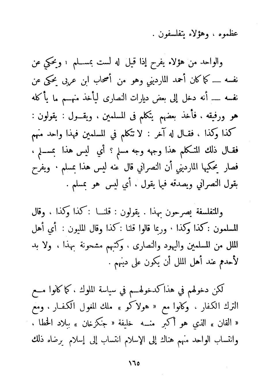 عَظَّمُوهُ وَهَؤُلَاءِ يَتَفَلْسَفُونَ. وَالْوَاحِدُ مِنْ هَؤُلَاءِ يَفْرَحُ إذَا قِيلَ لَهُ لَسْت بِمُسْلِمِ؛ وَيَحْكِي عَنْ نَفْسِهِ - كَمَا كَانَ أَحْمَد المارديني وَهُوَ مِنْ أَصْحَابِ ابْنِ عَرَبِيٍّ يَحْكِي عَنْ نَفْسِهِ - أَنَّهُ دَخَلَ إلَى بَعْضِ دِيَارَاتِ النَّصَارَى لِيَأْخُذَ مِنْهُمْ مَا يَأْكُلُهُ هُوَ وَرَفِيقُهُ فَأَخَذَ بَعْضُهُمْ يَتَكَلَّمُ فِي الْمُسْلِمِينَ وَيَقُولُ: يَقُولُونَ: كَذَا وَكَذَا فَقَالَ لَهُ آخَرُ: لَا تَتَكَلَّمْ فِي الْمُسْلِمِينَ فَهَذَا وَاحِدٌ مِنْهُمْ فَقَالَ ذَلِكَ الْمُتَكَلِّمُ هَذَا وَجْهُهُ وَجْهُ مُسْلِمٍ؟ أَيْ لَيْسَ هَذَا بِمُسْلِمِ فَصَارَ يَحْكِيهَا المارديني أَنَّ النَّصْرَانِيَّ قَالَ عَنْهُ لَيْسَ هَذَا بِمُسْلِمِ وَيَفْرَحُ بِقَوْلِ النَّصْرَانِيِّ وَيُصَدِّقُهُ فِيمَا يَقُولُ أَيْ لَيْسَ هُوَ بِمُسْلِمِ. والمتفلسفة يُصَرِّحُونَ بِهَذَا. يَقُولُونَ: قُلْنَا: كَذَا وَكَذَا وَقَالَ الْمُسْلِمُونَ: كَذَا وَكَذَا وَرُبَّمَا قَالُوا قُلْنَا: كَذَا وَقَالَ الْمِلِّيون: أَيْ أَهْلَ الْمِلَلِ مِنْ الْمُسْلِمِينَ وَالْيَهُودِ وَالنَّصَارَى وَكُتُبُهُمْ مَشْحُونَةٌ بِهَذَا وَلَا بُدَّ لِأَحَدِهِمْ عِنْدَ أَهْلِ الْمِلَلِ أَنْ يَكُونَ عَلَى دِينِهِمْ. لَكِنَّ دُخُولَهُمْ فِي هَذَا كَدُخُولِهِمْ فِي سِيَاسَةِ الْمُلُوكِ كَمَا كَانُوا مَعَ التُّرْكِ الْكُفَّارِ وَكَانُوا مَعَ هُولَاكُو " مَلِكِ الْمَغُولِ الْكُفَّارِ وَمَعَ الْقَانِّ " الَّذِي هُوَ أَكْبَرُ مِنْهُ خَلِيفَةُ جنكزخان " بِبِلَادِ الخطا وَانْتِسَابُ الْوَاحِدِ مِنْهُمْ هُنَاكَ إلَى الْإِسْلَامِ انْتِسَابٌ إلَى إسْلَامٍ يَرْضَاهُ ذَلِكَ