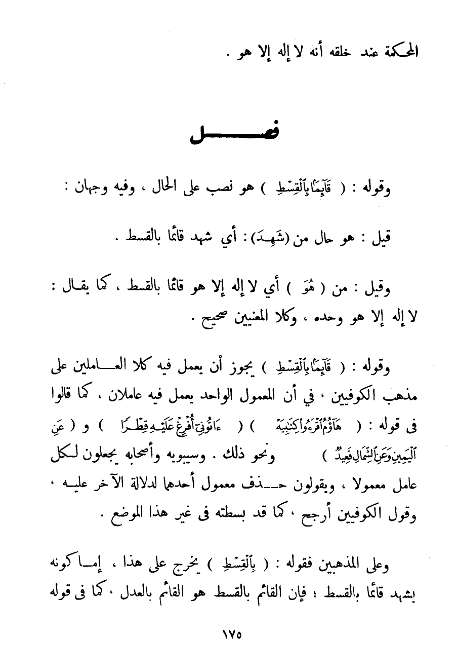 وَقَوْلُهُ: {قَائِمًا بِالْقِسْطِ} هُوَ نَصْبٌ عَلَى الْحَالِ وَفِيهِ وَجْهَانِ: قِيلَ: هُوَ حَالٌ مِنْ (شَهِدَ) : أَيْ شَهِدَ قَائِمًا بِالْقِسْطِ. وَقِيلَ: مَنْ (هُوَ أَيْ لَا إلَهَ إلَّا هُوَ قَائِمًا بِالْقِسْطِ كَمَا يُقَالُ: لَا إلَهَ إلَّا هُوَ وَحْدَهُ وَكِلَا الْمَعْنَيَيْنِ صَحِيحٌ. وَقَوْلُهُ: {قَائِمًا بِالْقِسْطِ} يَجُوزُ أَنْ يَعْمَلَ فِيهِ كِلَا الْعَامِلَيْنِ عَلَى مَذْهَبِ الْكُوفِيِّينَ فِي أَنَّ الْمَعْمُولَ الْوَاحِدَ يَعْمَلُ فِيهِ عَامِلَانِ كَمَا قَالُوا فِي قَوْلِهِ: {هَاؤُمُ اقْرَءُوا كِتَابِيَهْ} {آتُونِي أُفْرِغْ عَلَيْهِ قِطْرًا} و {عَنِ الْيَمِينِ وَعَنِ الشِّمَالِ قَعِيدٌ} وَنَحْوِ ذَلِكَ. وَسِيبَوَيْهِ وَأَصْحَابِهِ يَجْعَلُونَ لِكُلِّ عَامِلٍ مَعْمُولًا وَيَقُولُونَ حُذِفَ مَعْمُولُ أَحَدِهِمَا لِدَلَالَةِ الْآخَرِ عَلَيْهِ وَقَوْلُ الْكُوفِيِّينَ أَرْجَحُ كَمَا قَدْ بَسَطْته فِي غَيْرِ هَذَا الْمَوْضِعِ. وَعَلَى الْمَذْهَبَيْنِ فَقَوْلُهُ: {بِالْقِسْطِ} يَخْرُجُ عَلَى هَذَا إمَّا كَوْنُهُ يَشْهَدُ قَائِمًا بِالْقِسْطِ؛ فَإِنَّ الْقَائِمَ بِالْقِسْطِ هُوَ الْقَائِمُ بِالْعَدْلِ كَمَا فِي قَوْلِهِ