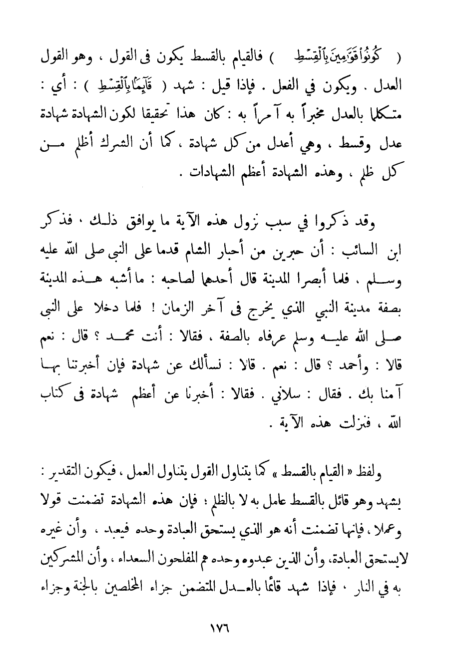 {كُونُوا قَوَّامِينَ بِالْقِسْطِ} فَالْقِيَامُ بِالْقِسْطِ يَكُونُ فِي الْقَوْلِ وَهُوَ الْقَوْلُ الْعَدْلُ وَيَكُونُ فِي الْفِعْلِ. فَإِذَا قِيلَ: شَهِدَ {قَائِمًا بِالْقِسْطِ} أَيْ: مُتَكَلِّمًا بِالْعَدْلِ مُخْبِرًا بِهِ آمِرًا بِهِ: كَانَ هَذَا تَحْقِيقًا لِكَوْنِ الشَّهَادَةِ شَهَادَةَ عَدْلٍ وَقِسْطٍ وَهِيَ أَعْدَلُ مِنْ كُلِّ شَهَادَةٍ كَمَا أَنَّ الشِّرْكَ أَظْلَمُ مِنْ كُلِّ ظُلْمٍ وَهَذِهِ الشَّهَادَةُ أَعْظَمُ الشَّهَادَاتِ. وَقَدْ ذَكَرُوا فِي سَبَبِ نُزُولِ هَذِهِ الْآيَةِ مَا يُوَافِقُ ذَلِكَ فَذَكَرَ ابْنُ السَّائِبِ: {أَنَّ حَبْرَيْنِ مِنْ أَحْبَارِ الشَّامِ قَدِمَا عَلَى النَّبِيِّ صَلَّى اللَّهُ عَلَيْهِ وَسَلَّمَ فَلَمَّا أَبْصَرَا الْمَدِينَةَ قَالَ أَحَدُهُمَا لِصَاحِبِهِ: مَا أَشْبَهَ هَذِهِ الْمَدِينَةِ بِصِفَةِ مَدِينَةِ النَّبِيِّ الَّذِي يَخْرُجُ فِي آخِرِ الزَّمَانِ فَلَمَّا دَخَلَا عَلَى النَّبِيِّ صَلَّى اللَّهُ عَلَيْهِ وَسَلَّمَ عَرَّفَاهُ بِالصِّفَةِ فَقَالَا: أَنْتَ مُحَمَّدٌ؟ قَالَ: نَعَمْ قَالَا: وَأَحْمَد؟ قَالَ: نَعَمْ. قَالَا: نَسْأَلُك عَنْ شَهَادَةٍ فَإِنْ أَخْبَرْتنَا بِهَا آمَنَّا بِك. فَقَالَ: سَلَانِي. فَقَالَا: أَخْبِرْنَا عَنْ أَعْظَمِ شَهَادَةٍ فِي كِتَابِ اللَّهِ فَنَزَلَتْ هَذِهِ الْآيَةُ} . وَلَفْظُ " الْقِيَامِ بِالْقِسْطِ " كَمَا يَتَنَاوَلُ الْقَوْلَ يَتَنَاوَلُ الْعَمَلَ فَيَكُونُ التَّقْدِيرُ: بشهد وَهُوَ قَائِلٌ بِالْقِسْطِ عَامِلٌ بِهِ لَا بِالظُّلْمِ؛ فَإِنَّ هَذِهِ الشَّهَادَةَ تَضَمَّنَتْ قَوْلًا وَعَمَلًا فَإِنَّهَا تَضَمَّنَتْ أَنَّهُ هُوَ الَّذِي يَسْتَحِقُّ الْعِبَادَةَ وَحْدَهُ فَيُعْبَدُ وَأَنَّ غَيْرَهُ لَا يَسْتَحِقُّ الْعِبَادَةَ وَأَنَّ الَّذِينَ عَبَدُوهُ وَحْدَهُ هُمْ الْمُفْلِحُونَ السُّعَدَاءُ وَأَنَّ الْمُشْرِكِينَ بِهِ فِي النَّارِ فَإِذَا شَهِدَ قَائِمًا بِالْعَدْلِ الْمُتَضَمِّنَ جَزَاءَ الْمُخْلَصِينَ بِالْجَنَّةِ وَجَزَاءَ