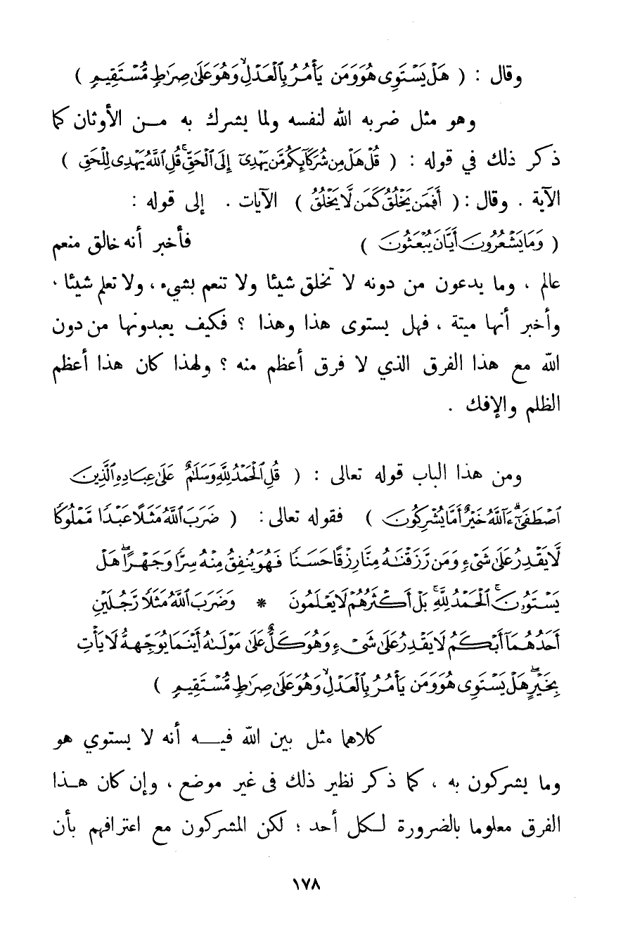 وَقَالَ: {هَلْ يَسْتَوِي هُوَ وَمَنْ يَأْمُرُ بِالْعَدْلِ وَهُوَ عَلَى صِرَاطٍ مُسْتَقِيمٍ} وَهُوَ مَثَلٌ ضَرَبَهُ اللَّهُ لِنَفْسِهِ وَلِمَا يُشْرَكُ بِهِ مِنْ الْأَوْثَانِ كَمَا ذُكِرَ ذَلِكَ فِي قَوْلِهِ: {قُلْ هَلْ مِنْ شُرَكَائِكُمْ مَنْ يَهْدِي إلَى الْحَقِّ قُلِ اللَّهُ يَهْدِي لِلْحَقِّ} الْآيَةَ. وَقَالَ: {أَفَمَنْ يَخْلُقُ كَمَنْ لَا يَخْلُقُ} الْآيَاتِ. إلَى قَوْلِهِ: {وَمَا يَشْعُرُونَ أَيَّانَ يُبْعَثُونَ} فَأَخْبَرَ أَنَّهُ خَالِقٌ مُنْعِمٌ عَالِمٌ وَمَا يَدْعُونَ مِنْ دُونِهِ لَا تَخْلُقُ شَيْئًا وَلَا تُنْعِمُ بِشَيْءِ وَلَا تَعْلَمُ شَيْئًا وَأَخْبَرَ أَنَّهَا مَيْتَةٌ فَهَلْ يَسْتَوِي هَذَا وَهَذَا؟ فَكَيْفَ يَعْبُدُونَهَا مِنْ دُونِ اللَّهِ مَعَ هَذَا الْفَرْقِ الَّذِي لَا فَرْقَ أَعْظَمَ مِنْهُ؟ وَلِهَذَا كَانَ هَذَا أَعْظَمُ الظُّلْمِ وَالْإِفْكِ. وَمِنْ هَذَا الْبَابِ قَوْله تَعَالَى {قُلِ الْحَمْدُ لِلَّهِ وَسَلَامٌ عَلَى عِبَادِهِ الَّذِينَ اصْطَفَى آللَّهُ خَيْرٌ أَمْ مَا يُشْرِكُونَ} فَقَوْلُهُ تَعَالَى: {ضَرَبَ اللَّهُ مَثَلًا عَبْدًا مَمْلُوكًا لَا يَقْدِرُ عَلَى شَيْءٍ وَمَنْ رَزَقْنَاهُ مِنَّا رِزْقًا حَسَنًا فَهُوَ يُنْفِقُ مِنْهُ سِرًّا وَجَهْرًا هَلْ يَسْتَوُونَ الْحَمْدُ لِلَّهِ بَلْ أَكْثَرُهُمْ لَا يَعْلَمُونَ} {وَضَرَبَ اللَّهُ مَثَلًا رَجُلَيْنِ أَحَدُهُمَا أَبْكَمُ لَا يَقْدِرُ عَلَى شَيْءٍ وَهُوَ كَلٌّ عَلَى مَوْلَاهُ أَيْنَمَا يُوَجِّهْهُ لَا يَأْتِ بِخَيْرٍ هَلْ يَسْتَوِي هُوَ وَمَنْ يَأْمُرُ بِالْعَدْلِ وَهُوَ عَلَى صِرَاطٍ مُسْتَقِيمٍ} كِلَاهُمَا مَثَلٌ بَيَّنَ اللَّهُ فِيهِ أَنَّهُ لَا يَسْتَوِي هُوَ وَمَا يُشْرِكُونَ بِهِ كَمَا ذُكِرَ نَظِيرُ ذَلِكَ فِي غَيْرِ مَوْضِعٍ وَإِنْ كَانَ هَذَا الْفَرْقُ مَعْلُومًا بِالضَّرُورَةِ لِكُلِّ أَحَدٍ؛ لَكِنْ الْمُشْرِكُونَ مَعَ اعْتِرَافِهِمْ بِأَنَّ