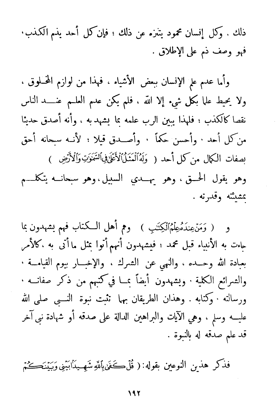 ذَلِكَ وَكُلُّ إنْسَانٍ مَحْمُودٌ يَتَنَزَّهُ عَنْ ذَلِكَ؛ فَإِنَّ كُلَّ أَحَدٍ يَذُمُّ الْكَذِبَ فَهُوَ وَصْفُ ذَمٍّ عَلَى الْإِطْلَاقِ. وَأَمَّا عَدَمُ عِلْمِ الْإِنْسَانِ بِبَعْضِ الْأَشْيَاءِ فَهَذَا مِنْ لَوَازِمِ الْمَخْلُوقِ وَلَا يُحِيطُ عِلْمًا بِكُلِّ شَيْءٍ إلَّا اللَّهُ فَلَمْ يَكُنْ عَدَمُ الْعِلْمِ عِنْدَ النَّاسِ نَقْصًا كَالْكَذِبِ؛ فَلِهَذَا يُبَيِّنُ الرَّبُّ عِلْمَهُ بِمَا يَشْهَدُ بِهِ وَأَنَّهُ أَصْدَقُ حَدِيثًا مِنْ كُلِّ أَحَدٍ وَأَحْسَنُ حُكْمًا وَأَصْدَقُ قِيلًا؛ لِأَنَّهُ سُبْحَانَهُ أَحَقُّ بِصِفَاتِ الْكَمَالِ مِنْ كُلِّ أَحَدٍ {وَلَهُ الْمَثَلُ الْأَعْلَى فِي السَّمَاوَاتِ وَالْأَرْضِ} وَهُوَ يَقُولُ الْحَقَّ وَهُوَ يَهْدِي السَّبِيلَ وَهُوَ سُبْحَانَهُ يَتَكَلَّمُ بِمَشِيئَتِهِ وَقُدْرَتِهِ. و {وَمَنْ عِنْدَهُ عِلْمُ الْكِتَابِ} وَهُمْ أَهْلُ الْكِتَابِ فَهُمْ يَشْهَدُونَ بِمَا جَاءَتْ بِهِ الْأَنْبِيَاءُ قَبْلَ مُحَمَّدٍ؛ فَيَشْهَدُونَ أَنَّهُمْ أَتَوْا بِمِثْلِ مَا أَتَى بِهِ كَالْأَمْرِ بِعِبَادَةِ اللَّهِ وَحْدَهُ وَالنَّهْيِ عَنْ الشِّرْكِ وَالْإِخْبَارِ بِيَوْمِ الْقِيَامَةِ وَالشَّرَائِعِ الْكُلِّيَّةِ وَيَشْهَدُونَ أَيْضًا بِمَا فِي كُتُبِهِمْ مِنْ ذِكْرِ صِفَاتِهِ وَرِسَالَتِهِ وَكِتَابِهِ. وَهَذَانِ الطَّرِيقَانِ بِهِمَا تَثْبُتُ نُبُوَّةُ النَّبِيِّ صَلَّى اللَّهُ عَلَيْهِ وَسَلَّمَ وَهِيَ الْآيَاتُ وَالْبَرَاهِينُ الدَّالَّةُ عَلَى صِدْقِهِ أَوْ شَهَادَةِ نَبِيٍّ آخَرَ قَدْ عَلِمَ صِدْقَهُ لَهُ بِالنُّبُوَّةِ. فَذَكَرَ هَذَيْنِ النَّوْعَيْنِ بِقَوْلِهِ: {قُلْ كَفَى بِاللَّهِ شَهِيدًا بَيْنِي وَبَيْنَكُمْ