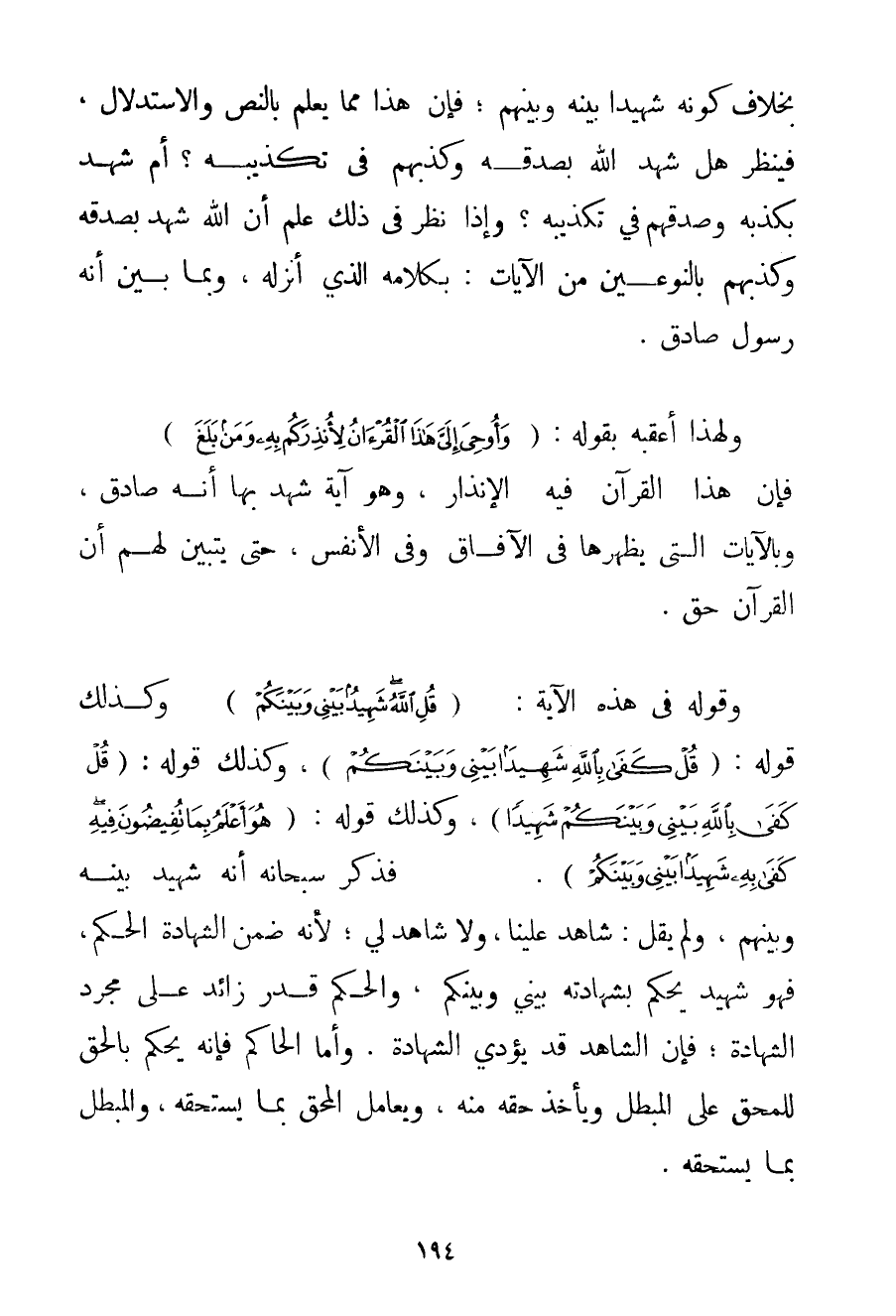 بِخِلَافِ كَوْنِهِ شَهِيدًا بَيْنَهُ وَبَيْنَهُمْ؛ فَإِنَّ هَذَا مِمَّا يُعْلَمُ بِالنَّصِّ وَالِاسْتِدْلَالِ فَيُنْظَرُ هَلْ شَهِدَ اللَّهُ بِصَدْقِهِ وَكَذِبِهِمْ فِي تَكْذِيبِهِ؟ أَمْ شَهِدَ بِكَذِبِهِ وَصِدْقِهِمْ فِي تَكْذِيبِهِ؟ وَإِذَا نَظَرَ فِي ذَلِكَ عَلِمَ أَنَّ اللَّهَ شَهِدَ بِصِدْقِهِ وَكَذِبِهِمْ بِالنَّوْعَيْنِ مِنْ الْآيَاتِ: بِكَلَامِهِ الَّذِي أَنْزَلَهُ وَبِمَا بَيَّنَ أَنَّهُ رَسُولٌ صَادِقٌ. وَلِهَذَا أَعْقَبَهُ بِقَوْلِهِ: {وَأُوحِيَ إلَيَّ هَذَا الْقُرْآنُ لِأُنْذِرَكُمْ بِهِ وَمَنْ بَلَغَ} فَإِنَّ هَذَا الْقُرْآنَ فِيهِ الْإِنْذَارُ وَهُوَ آيَةٌ شَهِدَ بِهَا أَنَّهُ صَادِقٌ وَبِالْآيَاتِ الَّتِي يُظْهِرُهَا فِي الْآفَاقِ وَفِي الْأَنْفُسِ حَتَّى يَتَبَيَّنَ لَهُمْ أَنَّ الْقُرْآنَ حَقٌّ. وَقَوْلُهُ فِي هَذِهِ الْآيَةِ: {قُلِ اللَّهُ شَهِيدٌ بَيْنِي وَبَيْنَكُمْ} وَكَذَلِكَ قَوْلُهُ: {قُلْ كَفَى بِاللَّهِ شَهِيدًا بَيْنِي وَبَيْنَكُمْ} وَكَذَلِكَ قَوْلُهُ: {قُلْ كَفَى بِاللَّهِ بَيْنِي وَبَيْنَكُمْ شَهِيدًا} وَكَذَلِكَ قَوْلُهُ: {هُوَ أَعْلَمُ بِمَا تُفِيضُونَ فِيهِ كَفَى بِهِ شَهِيدًا بَيْنِي وَبَيْنَكُمْ} . فَذَكَرَ سُبْحَانَهُ أَنَّهُ شَهِيدٌ بَيْنَهُ وَبَيْنَهُمْ وَلَمْ يَقُلْ: شَاهِدٌ عَلَيْنَا وَلَا شَاهِدٌ لِي؛ لِأَنَّهُ ضَمَّنَ الشَّهَادَةَ الْحُكْمَ فَهُوَ شَهِيدٌ يَحْكُمُ بِشَهَادَتِهِ بَيْنِي وَبَيْنَكُمْ وَالْحُكْمُ قَدْرٌ زَائِدٌ عَلَى مُجَرَّدِ الشَّهَادَةِ؛ فَإِنَّ الشَّاهِدَ قَدْ يُؤَدِّي الشَّهَادَةَ. وَأَمَّا الْحَاكِمُ فَإِنَّهُ يَحْكُمُ بِالْحَقِّ لِلْمُحِقِّ عَلَى الْمُبْطِلِ وَيَأْخُذُ حَقَّهُ مِنْهُ وَيُعَامِلُ الْمُحِقَّ بِمَا يَسْتَحِقُّهُ وَالْمُبْطِلَ بِمَا يَسْتَحِقُّهُ.