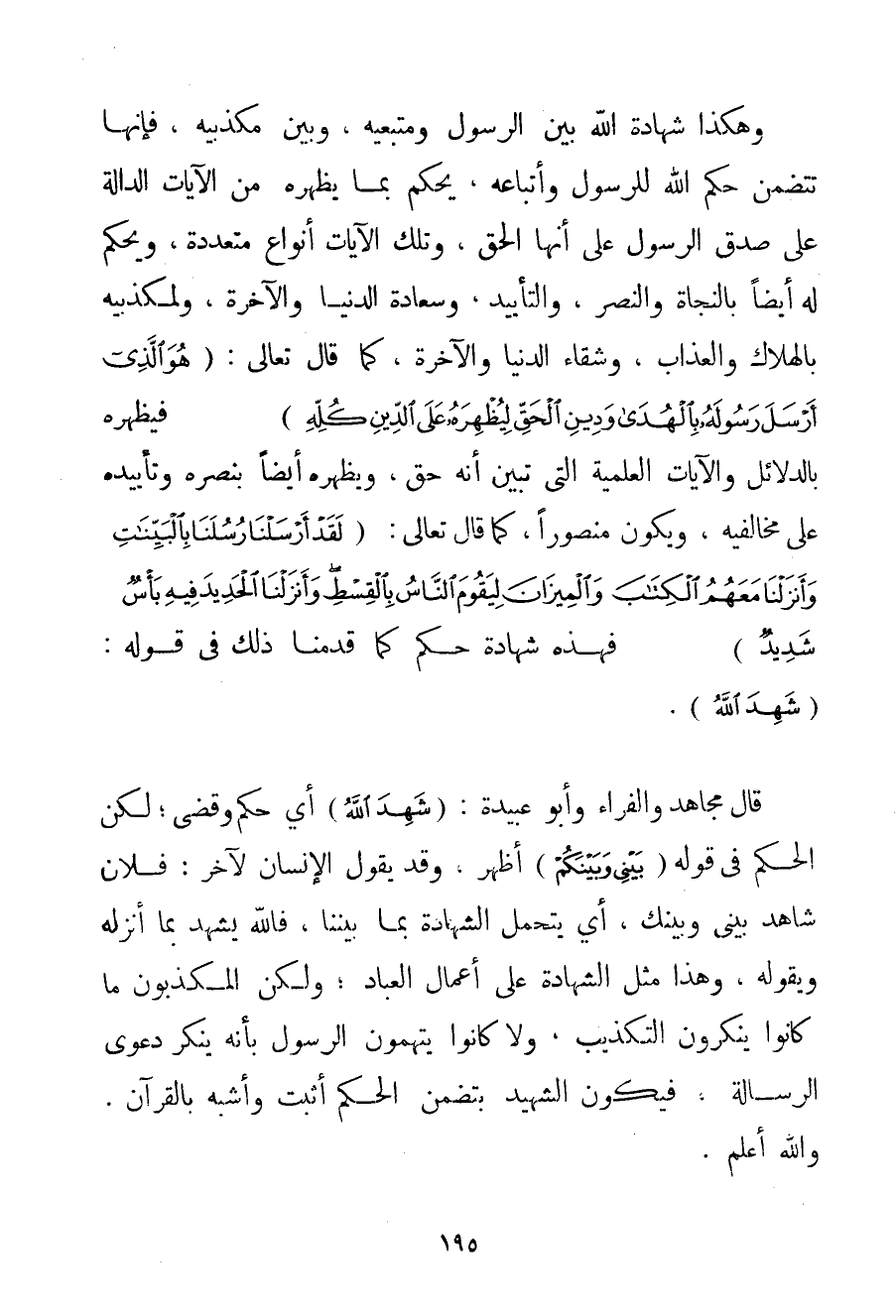 وَهَكَذَا شَهَادَةُ اللَّهِ بَيْنَ الرَّسُولِ وَمُتَّبِعِيهِ وَبَيْنَ مُكَذِّبِيهِ فَإِنَّهَا تَتَضَمَّنُ حُكْمَ اللَّهِ لِلرَّسُولِ وَأَتْبَاعِهِ يَحْكُمُ بِمَا يُظْهِرُهُ مِنْ الْآيَاتِ الدَّالَّةِ عَلَى صِدْقِ الرَّسُولِ عَلَى أَنَّهَا الْحَقُّ وَتِلْكَ الْآيَاتُ أَنْوَاعٌ مُتَعَدِّدَةٌ وَيَحْكُمُ لَهُ أَيْضًا بِالنَّجَاةِ وَالنَّصْرِ وَالتَّأْيِيدِ وَسَعَادَةِ الدُّنْيَا وَالْآخِرَةِ وَلِمُكَذِّبِيهِ بِالْهَلَاكِ وَالْعَذَابِ وَشَقَاءِ الدُّنْيَا وَالْآخِرَةِ كَمَا قَالَ تَعَالَى: {هُوَ الَّذِي أَرْسَلَ رَسُولَهُ بِالْهُدَى وَدِينِ الْحَقِّ لِيُظْهِرَهُ عَلَى الدِّينِ كُلِّهِ} فَيُظْهِرُهُ بِالدَّلَائِلِ وَالْآيَاتِ الْعِلْمِيَّةِ الَّتِي تُبَيِّنُ أَنَّهُ حَقٌّ وَيُظْهِرُهُ أَيْضًا بِنَصْرِهِ وَتَأْيِيدِهِ عَلَى مُخَالِفِيهِ وَيَكُونُ مَنْصُورًا كَمَا قَالَ تَعَالَى: {لَقَدْ أَرْسَلْنَا رُسُلَنَا بِالْبَيِّنَاتِ وَأَنْزَلْنَا مَعَهُمُ الْكِتَابَ وَالْمِيزَانَ لِيَقُومَ النَّاسُ بِالْقِسْطِ وَأَنْزَلْنَا الْحَدِيدَ فِيهِ بَأْسٌ شَدِيدٌ} فَهَذِهِ شَهَادَةُ حُكْمٍ كَمَا قَدَّمْنَا ذَلِكَ فِي قَوْلِهِ: {شَهِدَ اللَّهُ} . قَالَ مُجَاهِدٌ وَالْفِرَاءُ وَأَبُو عُبَيْدَةَ: {شَهِدَ اللَّهُ} أَيْ حَكَمَ وَقَضَى؛ لَكِنَّ الْحُكْمَ فِي قَوْلِهِ {بَيْنِي وَبَيْنَكُمْ} أَظْهَرُ وَقَدْ يَقُولُ الْإِنْسَانُ لِآخَرَ: فُلَانٌ شَاهِدٌ بَيْنِي وَبَيْنَك أَيْ يَتَحَمَّلُ الشَّهَادَةَ بِمَا بَيْنَنَا فَاَللَّهُ يَشْهَدُ بِمَا أَنْزَلَهُ وَيَقُولُهُ وَهَذَا مِثْلُ الشَّهَادَةِ عَلَى أَعْمَالِ الْعِبَادِ؛ وَلَكِنْ الْمُكَذِّبُونَ مَا كَانُوا يُنْكِرُونَ التَّكْذِيبَ وَلَا كَانُوا يَتَّهِمُونَ الرَّسُولَ بِأَنَّهُ يُنْكِرُ دَعْوَى الرِّسَالَةِ فَيَكُونُ الشَّهِيدُ بِتَضَمُّنِ الْحُكْمِ أَثْبَتَ وَأَشْبَهَ بِالْقُرْآنِ. وَاَللَّهُ أَعْلَمُ.