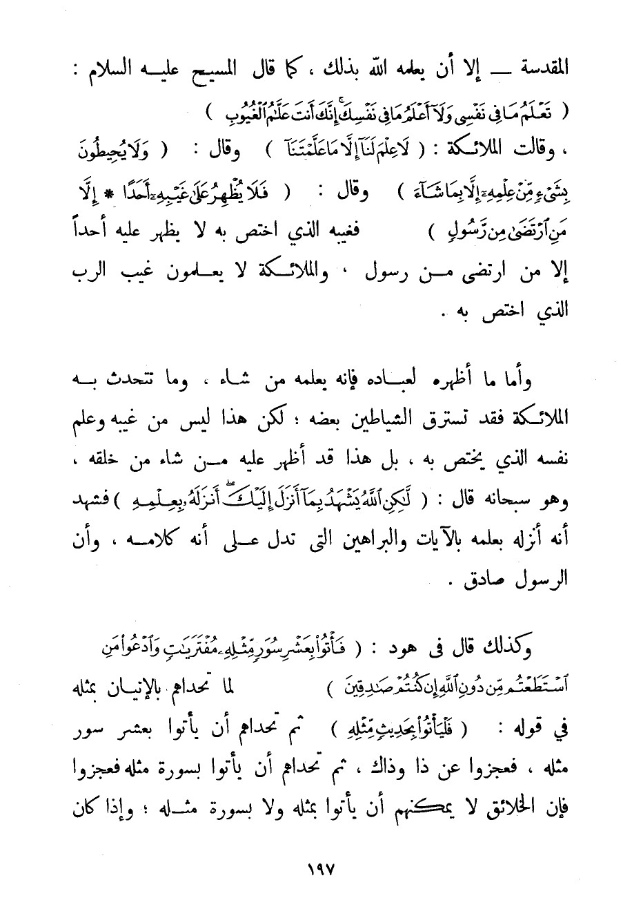 الْمُقَدَّسَةُ - إلَّا أَنْ يُعَلِّمَهُ اللَّهُ بِذَلِكَ كَمَا قَالَ الْمَسِيحُ عَلَيْهِ السَّلَامُ {تَعْلَمُ مَا فِي نَفْسِي وَلَا أَعْلَمُ مَا فِي نَفْسِكَ إنَّكَ أَنْتَ عَلَّامُ الْغُيُوبِ} وَقَالَتْ الْمَلَائِكَةُ: {لَا عِلْمَ لَنَا إلَّا مَا عَلَّمْتَنَا} وَقَالَ: {وَلَا يُحِيطُونَ بِشَيْءٍ مِنْ عِلْمِهِ إلَّا بِمَا شَاءَ} وَقَالَ: {فَلَا يُظْهِرُ عَلَى غَيْبِهِ أَحَدًا} {إلَّا مَنِ ارْتَضَى مِنْ رَسُولٍ} فَغَيْبُهُ الَّذِي اخْتَصَّ بِهِ لَا يُظْهِرُ عَلَيْهِ أَحَدًا إلَّا مَنْ ارْتَضَى مِنْ رَسُولٍ وَالْمَلَائِكَةُ لَا يَعْلَمُونَ غَيْبَ الرَّبِّ الَّذِي اخْتَصَّ بِهِ. وَأَمَّا مَا أَظْهَرَهُ لِعِبَادِهِ فَإِنَّهُ يُعَلِّمُهُ مَنْ شَاءَ وَمَا تَتَحَدَّثُ بِهِ الْمَلَائِكَةُ فَقَدْ تَسْتَرِقُ الشَّيَاطِينُ بَعْضَهُ؛ لَكِنَّ هَذَا لَيْسَ مِنْ غَيْبِهِ وَعِلْمِ نَفْسِهِ الَّذِي يَخْتَصُّ بِهِ بَلْ هَذَا قَدْ أَظْهَرَ عَلَيْهِ مَنْ شَاءَ مِنْ خَلْقِهِ وَهُوَ سُبْحَانَهُ قَالَ: {لَكِنِ اللَّهُ يَشْهَدُ بِمَا أَنْزَلَ إلَيْكَ أَنْزَلَهُ بِعِلْمِهِ} فَشَهِدَ أَنَّهُ أَنْزَلَهُ بِعِلْمِهِ بِالْآيَاتِ وَالْبَرَاهِينِ الَّتِي تَدُلُّ عَلَى أَنَّهُ كَلَامُهُ وَأَنَّ الرَّسُولَ صَادِقٌ. وَكَذَلِكَ قَالَ فِي هُودٍ: {فَأْتُوا بِعَشْرِ سُوَرٍ مِثْلِهِ مُفْتَرَيَاتٍ وَادْعُوا مَنِ اسْتَطَعْتُمْ مِنْ دُونِ اللَّهِ إنْ كُنْتُمْ صَادِقِينَ} لَمَّا تَحَدَّاهُمْ بِالْإِتْيَانِ بِمِثْلِهِ فِي قَوْلِهِ: {فَلْيَأْتُوا بِحَدِيثٍ مِثْلِهِ} ثُمَّ تَحَدَّاهُمْ أَنْ يَأْتُوا بِعَشْرِ سُوَرٍ مِثْلِهِ فَعَجَزُوا عَنْ ذَا وَذَاكَ ثُمَّ تَحَدَّاهُمْ أَنْ يَأْتُوا بِسُورَةِ مِثْلِهِ فَعَجَزُوا فَإِنَّ الْخَلَائِقَ لَا يُمْكِنُهُمْ أَنْ يَأْتُوا بِمِثْلِهِ وَلَا بِسُورَةِ مِثْلِهِ؛ وَإِذَا كَانَ