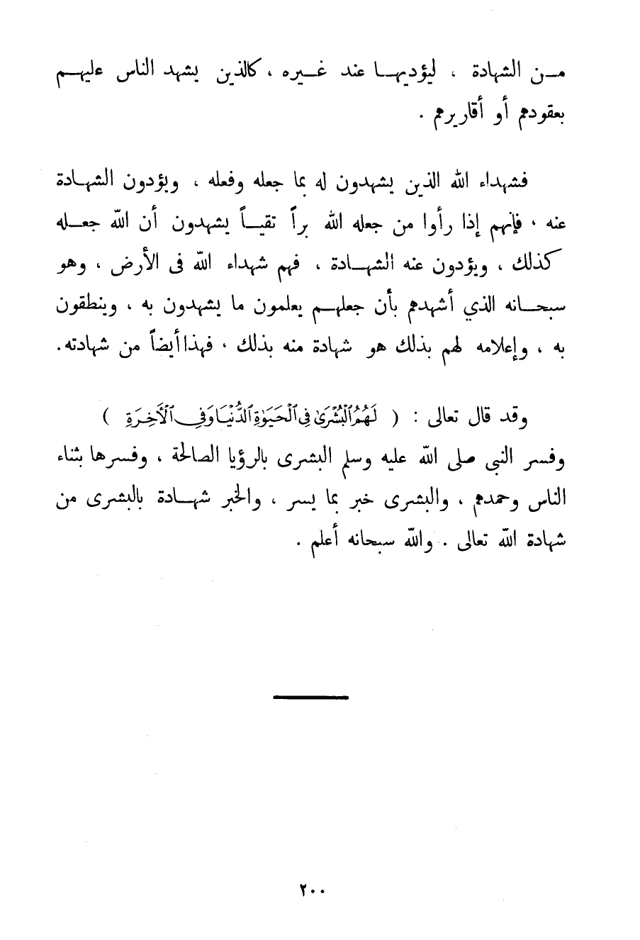 مِنْ الشَّهَادَةِ لِيُؤَدِّيَهَا عِنْدَ غَيْرِهِ كَاَلَّذِينَ يَشْهَدُ النَّاسُ عَلَيْهِمْ بِعُقُودِهِمْ أَوْ أقاريرهم. فَشُهَدَاءُ اللَّهِ الَّذِينَ يَشْهَدُونَ لَهُ بِمَا جَعَلَهُ وَفَعَلَهُ وَيُؤَدُّونَ الشَّهَادَةَ عَنْهُ فَإِنَّهُمْ إذَا رَأَوْا مَنْ جَعَلَهُ اللَّهُ بَرًّا تَقِيًّا يَشْهَدُونَ أَنَّ اللَّهَ جَعَلَهُ كَذَلِكَ وَيُؤَدُّونَ عَنْهُ الشَّهَادَةَ فَهُمْ شُهَدَاءُ اللَّهِ فِي الْأَرْضِ وَهُوَ سُبْحَانَهُ الَّذِي أَشْهَدَهُمْ بِأَنْ جَعَلَهُمْ يَعْلَمُونَ مَا يَشْهَدُونَ بِهِ وَيَنْطِقُونَ بِهِ وَإِعْلَامه لَهُمْ بِذَلِكَ هُوَ شَهَادَةٌ مِنْهُ بِذَلِكَ فَهَذَا أَيْضًا مِنْ شَهَادَتِهِ. وَقَدْ قَالَ تَعَالَى: {لَهُمُ الْبُشْرَى فِي الْحَيَاةِ الدُّنْيَا وَفِي الْآخِرَةِ} وَفَسَّرَ النَّبِيُّ صَلَّى اللَّهُ عَلَيْهِ وَسَلَّمَ الْبُشْرَى بِالرُّؤْيَا الصَّالِحَةِ وَفَسَّرَهَا بِثَنَاءِ النَّاسِ وَحَمْدِهِمْ وَالْبُشْرَى خَبَرٌ بِمَا يُسِرُّ وَالْخَبَرُ شَهَادَةٌ بِالْبُشْرَى مِنْ شَهَادَةِ اللَّهِ تَعَالَى. وَاَللَّهُ سُبْحَانَهُ أَعْلَمُ.