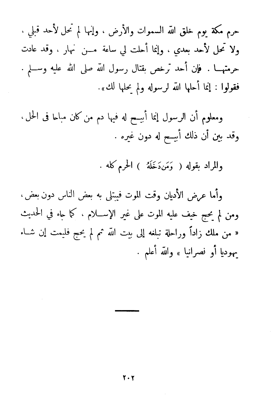 حَرَّمَ مَكَّةَ يَوْمَ خَلَقَ اللَّهُ السَّمَوَاتِ وَالْأَرْضَ وَإِنَّهَا لَمْ تَحِلَّ لِأَحَدِ قَبْلِي وَلَا تَحِلُّ لِأَحَدِ بَعْدِي وَإِنَّمَا أُحِلَّتْ لِي سَاعَةٌ مِنْ نَهَارٍ وَقَدْ عَادَتْ حُرْمَتُهَا} . فَإِنْ أَحَدٌ تَرَخَّصَ بِقِتَالِ رَسُولِ اللَّهِ صَلَّى اللَّهُ عَلَيْهِ وَسَلَّمَ. فَقُولُوا: إنَّمَا أَحَلَّهَا اللَّهُ لِرَسُولِهِ وَلَمْ يُحِلَّهَا لَك. وَمَعْلُومٌ أَنَّ الرَّسُولَ إنَّمَا أُبِيحَ لَهُ فِيهَا دَمُ مَنْ كَانَ مُبَاحًا فِي الْحِلِّ وَقَدْ بَيَّنَ أَنَّ ذَلِكَ أُبِيحَ لَهُ دُونَ غَيْرِهِ. وَالْمُرَادُ بِقَوْلِهِ {وَمَنْ دَخَلَهُ} الْحَرَمُ كُلُّهُ. وَأَمَّا عَرْضُ الْأَدْيَانِ وَقْتَ الْمَوْتِ فَيُبْتَلَى بِهِ بَعْضُ النَّاسِ دُونَ بَعْضٍ وَمَنْ لَمْ يَحُجَّ خِيفَ عَلَيْهِ الْمَوْتُ عَلَى غَيْرِ الْإِسْلَامِ كَمَا جَاءَ فِي الْحَدِيثِ {مَنْ مَلَكَ زَادًا وَرَاحِلَةً تُبَلِّغُهُ إلَى بَيْتِ اللَّهِ ثُمَّ لَمْ يَحُجَّ فَلْيَمُتْ إنْ شَاءَ يَهُودِيًّا أَوْ نَصْرَانِيًّا} وَاَللَّهُ أَعْلَمُ.