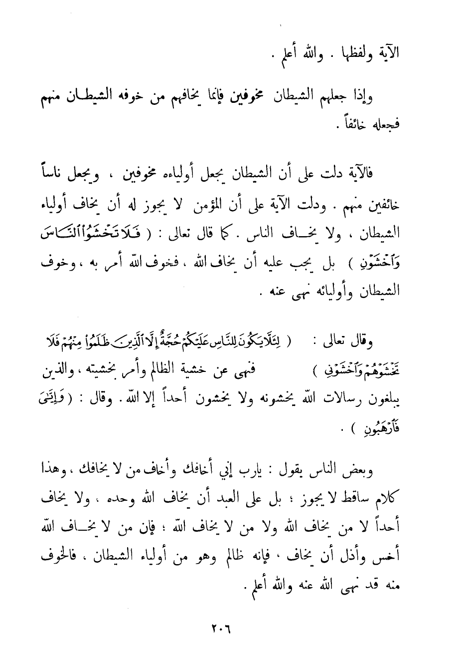 وَإِذَا جَعَلَهُمْ الشَّيْطَانُ مُخَوَّفِينَ فَإِنَّمَا يَخَافُهُمْ مَنْ خَوَّفَهُ الشَّيْطَانُ مِنْهُمْ فَجَعَلَهُ خَائِفًا. فَالْآيَةُ دَلَّتْ عَلَى أَنَّ الشَّيْطَانَ يَجْعَلُ أَوْلِيَاءَهُ مُخَوَّفِينَ وَيَجْعَلُ نَاسًا خَائِفِينَ مِنْهُمْ. وَدَلَّتْ الْآيَةُ عَلَى أَنَّ الْمُؤْمِنَ لَا يَجُوزُ لَهُ أَنْ يَخَافَ أَوْلِيَاءَ الشَّيْطَانِ وَلَا يَخَافُ النَّاسَ. كَمَا قَالَ تَعَالَى: {فَلَا تَخْشَوُا النَّاسَ وَاخْشَوْنِ} بَلْ يَجِبُ عَلَيْهِ أَنْ يَخَافَ اللَّهَ فَخَوْفُ اللَّهِ أَمَرَ بِهِ وَخَوْفُ الشَّيْطَانِ وَأَوْلِيَائِهِ نَهَى عَنْهُ. وَقَالَ تَعَالَى: {لِئَلَّا يَكُونَ لِلنَّاسِ عَلَيْكُمْ حُجَّةٌ إلَّا الَّذِينَ ظَلَمُوا مِنْهُمْ فَلَا تَخْشَوْهُمْ وَاخْشَوْنِي} فَنَهَى عَنْ خَشْيَةِ الظَّالِمِ وَأَمَرَ بِخَشْيَتِهِ وَاَلَّذِينَ يُبَلِّغُونَ رِسَالَاتِ اللَّهِ وَيَخْشَوْنَهُ وَلَا يَخْشَوْنَ أَحَدًا إلَّا اللَّهَ. وَقَالَ: {وَإِيَّايَ فَارْهَبُونِ} . وَبَعْضُ النَّاسِ يَقُولُ: يَا رَبِّ إنِّي أَخَافُك وَأَخَافُ مَنْ لَا يَخَافُك وَهَذَا كَلَامٌ سَاقِطٌ لَا يَجُوزُ؛ بَلْ عَلَى الْعَبْدِ أَنْ يَخَافَ اللَّهَ وَحْدَهُ وَلَا يَخَافُ أَحَدًا لَا مَنْ يَخَافُ اللَّهَ وَلَا مَنْ لَا يَخَافُ اللَّهَ؛ فَإِنَّ مَنْ لَا يَخَافُ اللَّهَ أَخَسُّ وَأَذَلُّ أَنْ يُخَافَ فَإِنَّهُ ظَالِمٌ وَهُوَ مِنْ أَوْلِيَاءِ الشَّيْطَانِ فَالْخَوْفُ مِنْهُ قَدْ نَهَى اللَّهُ عَنْهُ وَاَللَّهُ أَعْلَمُ.