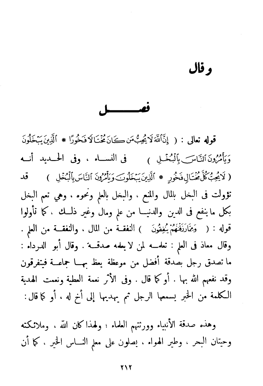 قَوْله تَعَالَى {إنَّ اللَّهَ لَا يُحِبُّ مَنْ كَانَ مُخْتَالًا فَخُورًا} {الَّذِينَ يَبْخَلُونَ وَيَأْمُرُونَ النَّاسَ بِالْبُخْلِ} فِي النِّسَاءِ وَفِي الْحَدِيدِ أَنَّهُ {لَا يُحِبُّ كُلَّ مُخْتَالٍ فَخُورٍ} {الَّذِينَ يَبْخَلُونَ وَيَأْمُرُونَ النَّاسَ بِالْبُخْلِ} قَدْ تُؤُوِّلَتْ فِي الْبُخْلِ بِالْمَالِ وَالْمَنْعِ وَالْبُخْلِ بِالْعِلْمِ وَنَحْوِهِ وَهِيَ تَعُمُّ الْبُخْلَ بِكُلِّ مَا يَنْفَعُ فِي الدِّينِ وَالدُّنْيَا مِنْ عِلْمٍ وَمَالٍ وَغَيْرِ ذَلِكَ كَمَا تَأَوَّلُوا قَوْلَهُ: {وَمِمَّا رَزَقْنَاهُمْ يُنْفِقُونَ} النَّفَقَةُ مِنْ الْمَالِ وَالنَّفَقَةُ مِنْ الْعِلْمِ. وَقَالَ مُعَاذٌ فِي الْعِلْمِ: تَعَلُّمُهُ لِمَنْ لَا يَعْلَمُهُ صَدَقَةٌ. وَقَالَ أَبُو الدَّرْدَاءِ: مَا تَصَدَّقَ رَجُلٌ بِصَدَقَةِ أَفْضَلَ مِنْ مَوْعِظَةٍ يَعِظُ بِهَا جَمَاعَةً فَيَتَفَرَّقُونَ وَقَدْ نَفَعَهُمْ اللَّهُ بِهَا. أَوْ كَمَا قَالَ. وَفِي الْأَثَرِ نِعْمَةُ الْعَطِيَّةِ وَنِعْمَت الْهَدِيَّةُ الْكَلِمَةُ مِنْ الْخَبَرِ يَسْمَعُهَا الرَّجُلُ ثُمَّ يُهْدِيهَا إلَى أَخ لَهُ أَوْ كَمَا قَالَ: وَهَذِهِ صَدَقَةُ الْأَنْبِيَاءِ وَوَرَثَتُهُمْ الْعُلَمَاءُ؛ وَلِهَذَا كَانَ اللَّهُ وَمَلَائِكَتُهُ وَحِيتَانُ الْبَحْرِ وَطَيْرُ الْهَوَاءِ يُصَلُّونَ عَلَى مُعَلِّمِ النَّاسِ الْخَيْرَ كَمَا أَنَّ