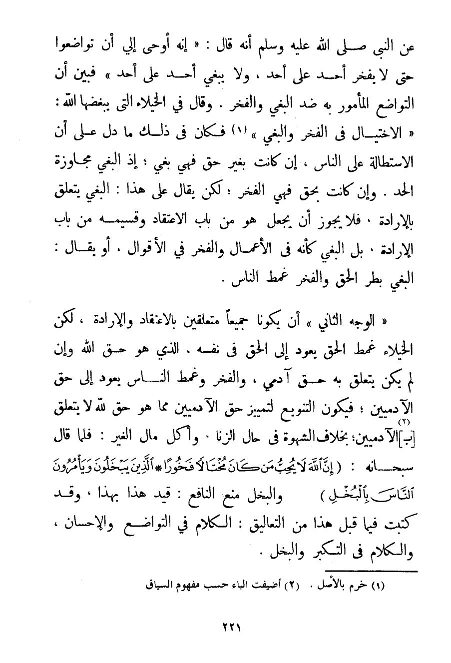 عَنْ النَّبِيِّ صَلَّى اللَّهُ عَلَيْهِ وَسَلَّمَ أَنَّهُ قَالَ: {إنَّهُ أُوحِيَ إلَيَّ أَنْ تَوَاضَعُوا حَتَّى لَا يَفْخَرَ أَحَدٌ عَلَى أَحَدٍ وَلَا يَبْغِيَ أَحَدٌ عَلَى أَحَدٍ} فَبَيَّنَ أَنَّ التَّوَاضُعَ الْمَأْمُورَ بِهِ ضِدَّ الْبَغْيِ وَالْفَخْرِ. {وَقَالَ فِي الْخُيَلَاءِ الَّتِي يُبْغِضُهَا اللَّهُ: الِاخْتِيَالُ فِي الْفَخْرِ وَالْبَغْيِ} . . . (1) فَكَانَ فِي ذَلِكَ مَا دَلَّ عَلَى أَنَّ الِاسْتِطَالَةَ عَلَى النَّاسِ إنْ كَانَتْ بِغَيْرِ حَقٍّ فَهِيَ بَغِيٌّ؛ إذْ الْبَغْيُ مُجَاوَزَةُ الْحَدِّ. وَإِنْ كَانَتْ بِحَقِّ فَهِيَ الْفَخْرُ؛ لَكِنْ يُقَالُ عَلَى هَذَا: الْبَغْيُ يَتَعَلَّقُ بِالْإِرَادَةِ فَلَا يَجُوزُ أَنْ يُجْعَلَ هُوَ مِنْ بَابِ الِاعْتِقَادِ وَقَسِيمُهُ مِنْ بَابِ الْإِرَادَةِ بَلْ الْبَغْيُ كَأَنَّهُ فِي الْأَعْمَالِ وَالْفَخْرُ فِي الْأَقْوَالِ أَوْ يُقَالُ: الْبَغْيُ بَطَرُ الْحَقِّ وَالْفَخْرُ غَمْطُ النَّاسِ. " الْوَجْهُ الثَّانِي " أَنْ يَكُونَا جَمِيعًا مُتَعَلِّقَيْنِ بِالِاعْتِقَادِ وَالْإِرَادَةِ لَكِنَّ الْخُيَلَاءَ غَمْطُ الْحَقِّ يَعُودُ إلَى الْحَقِّ فِي نَفْسِهِ الَّذِي هُوَ حَقُّ اللَّهِ وَإِنْ لَمْ يَكُنْ يَتَعَلَّقُ بِهِ حَقُّ آدَمِيٍّ وَالْفَخْرُ وَغَمْطُ النَّاسِ يَعُودُ إلَى حَقِّ الْآدَمِيِّينَ؛ فَيَكُونُ التَّنْوِيعُ لِتَمْيِيزِ حَقِّ الْآدَمِيِّينَ مِمَّا هُوَ حَقٌّ لِلَّهِ لَا يَتَعَلَّقُ [بـ] (2) الْآدَمِيِّينَ؛ بِخِلَافِ الشَّهْوَةِ فِي حَالِ الزِّنَا وَأَكْلِ مَالِ الْغَيْرِ: فَلَمَّا قَالَ سُبْحَانَهُ: {إنَّ اللَّهَ لَا يُحِبُّ مَنْ كَانَ مُخْتَالًا فَخُورًا} {الَّذِينَ يَبْخَلُونَ وَيَأْمُرُونَ النَّاسَ بِالْبُخْلِ} وَالْبُخْلُ مَنْعُ النَّافِعِ: قَيَّدَ هَذَا بِهَذَا وَقَدْ كَتَبْت فِيمَا قَبْلَ هَذَا مِنْ التَّعَالِيقِ: الْكَلَامُ فِي التَّوَاضُعِ وَالْإِحْسَانِ وَالْكَلَامُ فِي التَّكَبُّرِ وَالْبُخْلِ.