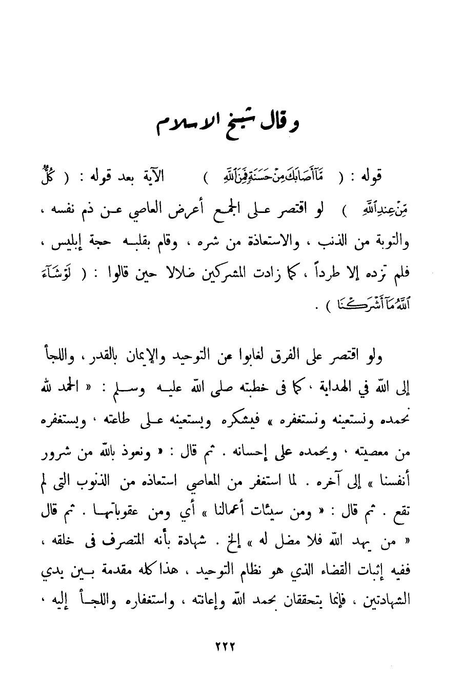 قَوْلُهُ: {مَا أَصَابَكَ مِنْ حَسَنَةٍ فَمِنَ اللَّهِ} الْآيَةَ بَعْدَ قَوْلِهِ: {كُلٌّ مِنْ عِنْدِ اللَّهِ} لَوْ اقْتَصَرَ عَلَى الْجَمْعِ أَعْرَضَ الْعَاصِي عَنْ ذَمِّ نَفْسِهِ وَالتَّوْبَةِ مِنْ الذَّنْبِ وَالِاسْتِعَاذَةِ مِنْ شَرِّهِ وَقَامَ بِقَلْبِهِ حُجَّةُ إبْلِيسَ فَلَمْ تَزِدْهُ إلَّا طَرْدًا كَمَا زَادَتْ الْمُشْرِكِينَ ضَلَالًا حِينَ قَالُوا: {لَوْ شَاءَ اللَّهُ مَا أَشْرَكْنَا} . وَلَوْ اقْتَصَرَ عَلَى الْفَرْقِ لَغَابُوا عَنْ التَّوْحِيدِ وَالْإِيمَانِ بِالْقَدَرِ وَاللَّجَأِ إلَى اللَّهِ فِي الْهِدَايَةِ كَمَا فِي خُطْبَتِهِ صَلَّى اللَّهُ عَلَيْهِ وَسَلَّمَ {الْحَمْدُ لِلَّهِ نَحْمَدُهُ وَنَسْتَعِينُهُ وَنَسْتَغْفِرُهُ} فَيَشْكُرُهُ وَيَسْتَعِينُهُ عَلَى طَاعَتِهِ وَيَسْتَغْفِرُهُ مِنْ مَعْصِيَتِهِ وَيَحْمَدُهُ عَلَى إحْسَانِهِ. ثُمَّ قَالَ: {وَنَعُوذُ بِاَللَّهِ مِنْ شُرُورِ أَنْفُسِنَا} إلَى آخِرِهِ. لَمَّا اسْتَغْفَرَ مِنْ الْمَعَاصِي اسْتَعَاذَهُ مِنْ الذُّنُوبِ الَّتِي لَمْ تَقَعُ. ثُمَّ قَالَ: {وَمِنْ سَيِّئَاتِ أَعْمَالِنَا} أَيْ وَمِنْ عُقُوبَاتِهَا. ثُمَّ قَالَ {مَنْ يَهْدِ اللَّهُ فَلَا مُضِلَّ لَهُ} إلَخْ. شَهَادَةٌ بِأَنَّهُ الْمُتَصَرِّفُ فِي خَلْقِهِ فَفِيهِ إثْبَاتُ الْقَضَاءِ الَّذِي هُوَ نِظَامُ التَّوْحِيدِ هَذَا كُلُّهُ مُقَدِّمَةٌ بَيْنَ يَدَيْ الشَّهَادَتَيْنِ فَإِنَّمَا يَتَحَقَّقَانِ بِحَمْدِ اللَّهِ وَإِعَانَتِهِ وَاسْتِغْفَارِهِ وَاللَّجَأِ إلَيْهِ،