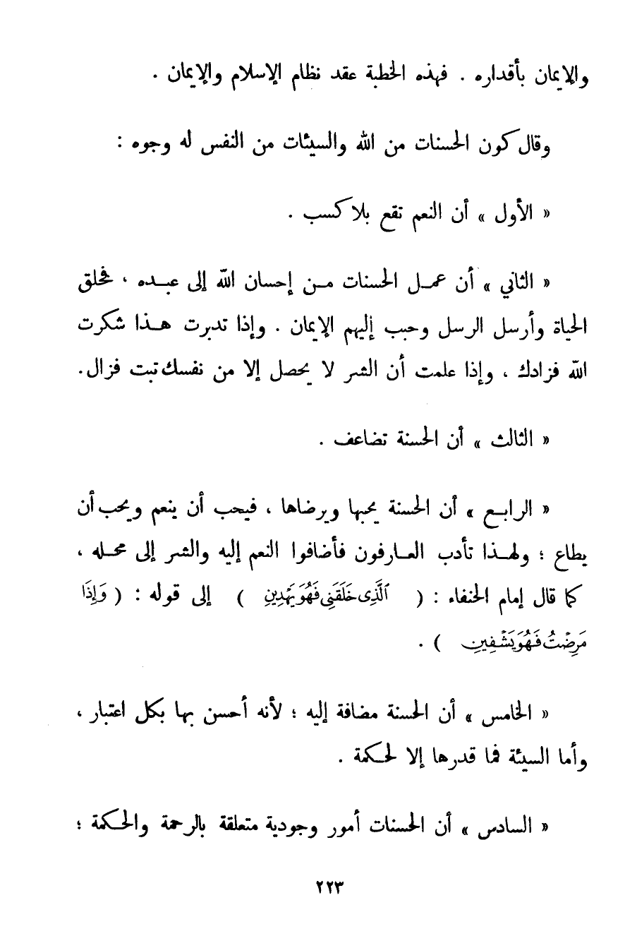 وَالْإِيمَانِ بِأَقْدَارِهِ. فَهَذِهِ الْخُطْبَةُ عِقْدُ نِظَامِ الْإِسْلَامِ وَالْإِيمَانِ. وَقَالَ كَوْنُ الْحَسَنَاتِ مِنْ اللَّهِ وَالسَّيِّئَاتِ مِنْ النَّفْسِ لَهُ وُجُوهٌ: " الْأَوَّلُ " أَنَّ النِّعَمَ تَقَعُ بِلَا كَسْبٍ. " الثَّانِي " أَنَّ عَمَلَ الْحَسَنَاتِ مِنْ إحْسَانِ اللَّهِ إلَى عَبْدِهِ فَخَلَقَ الْحَيَاةَ وَأَرْسَلَ الرُّسُلَ وَحَبَّبَ إلَيْهِمْ الْإِيمَانَ. وَإِذَا تَدَبَّرْت هَذَا شَكَرْت اللَّهَ فَزَادَك وَإِذَا عَلِمْت أَنَّ الشَّرَّ لَا يَحْصُلُ إلَّا مِنْ نَفْسِك تُبْت فَزَالَ. " الثَّالِثُ " أَنَّ الْحَسَنَةَ تُضَاعَفُ. " الرَّابِعُ " أَنَّ الْحَسَنَةَ يُحِبُّهَا وَيَرْضَاهَا فَيُحِبُّ أَنْ يُنْعِمَ وَيُحِبَّ أَنْ يُطَاعَ؛ وَلِهَذَا تَأَدَّبَ الْعَارِفُونَ فَأَضَافُوا النِّعَمَ إلَيْهِ وَالشَّرَّ إلَى مَحَلِّهِ كَمَا قَالَ إمَامُ الْحُنَفَاءِ: {الَّذِي خَلَقَنِي فَهُوَ يَهْدِينِ} إلَى قَوْلِهِ: {وَإِذَا مَرِضْتُ فَهُوَ يَشْفِينِ} . " الْخَامِسُ " أَنَّ الْحَسَنَةَ مُضَافَةٌ إلَيْهِ؛ لِأَنَّهُ أَحْسَنَ بِهَا بِكُلِّ اعْتِبَارٍ وَأَمَّا السَّيِّئَةُ فَمَا قَدَّرَهَا إلَّا لِحِكْمَةِ. " السَّادِسُ " أَنَّ الْحَسَنَاتِ أُمُورٌ وُجُودِيَّةٌ مُتَعَلِّقَةٌ بِالرَّحْمَةِ وَالْحِكْمَةِ؛