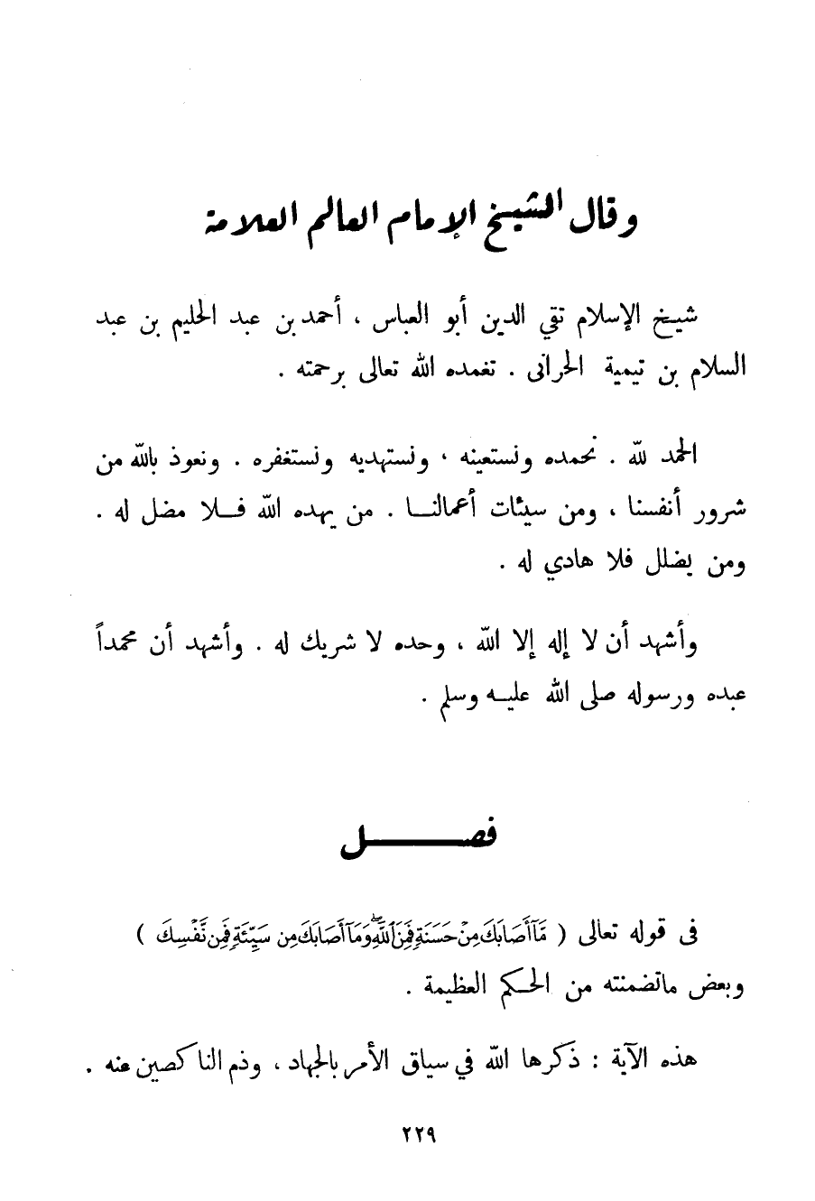 وَقَالَ الشَّيْخُ الْإِمَامُ الْعَالِمُ الْعَلَّامَةُ شَيْخُ الْإِسْلَامِ تَقِيُّ الدِّينِ أَبُو الْعَبَّاسِ أَحْمَد بْنُ عَبْدِ الْحَلِيمِ بْنِ عَبْدِ السَّلَامِ بْنِ تَيْمِيَّة الْحَرَّانِي - تَغَمَّدَهُ اللَّهُ تَعَالَى بِرَحْمَتِهِ -: