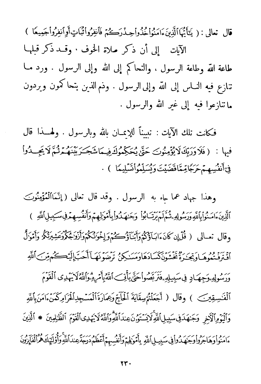 قَالَ تَعَالَى: {يَا أَيُّهَا الَّذِينَ آمَنُوا خُذُوا حِذْرَكُمْ فَانْفِرُوا ثُبَاتٍ أَوِ انْفِرُوا جَمِيعًا} الْآيَاتِ إلَى أَنَّ ذَكَرَ صَلَاةَ الْخَوْفِ وَقَدْ ذَكَرَ قَبْلَهَا طَاعَةَ اللَّهِ وَطَاعَةَ الرَّسُولِ وَالتَّحَاكُمَ إلَى اللَّهِ وَإِلَى الرَّسُولِ. وَرَدَّ مَا تَنَازَعَ فِيهِ النَّاسُ إلَى اللَّهِ وَإِلَى الرَّسُولِ. وَذَمَّ الَّذِينَ يَتَحَاكَمُونَ وَيَرُدُّونَ مَا تَنَازَعُوا فِيهِ إلَى غَيْرِ اللَّهِ وَالرَّسُولِ. فَكَانَتْ تِلْكَ الْآيَاتُ: تَبْيِينًا لِلْإِيمَانِ بِاَللَّهِ وَبِالرَّسُولِ. وَلِهَذَا قَالَ فِيهَا: {فَلَا وَرَبِّكَ لَا يُؤْمِنُونَ حَتَّى يُحَكِّمُوكَ فِيمَا شَجَرَ بَيْنَهُمْ ثُمَّ لَا يَجِدُوا فِي أَنْفُسِهِمْ حَرَجًا مِمَّا قَضَيْتَ وَيُسَلِّمُوا تَسْلِيمًا} . وَهَذَا جِهَادٌ عَمَّا جَاءَ بِهِ الرَّسُولُ. وَقَدْ قَالَ تَعَالَى {إنَّمَا الْمُؤْمِنُونَ الَّذِينَ آمَنُوا بِاللَّهِ وَرَسُولِهِ ثُمَّ لَمْ يَرْتَابُوا وَجَاهَدُوا بِأَمْوَالِهِمْ وَأَنْفُسِهِمْ فِي سَبِيلِ اللَّهِ} وَقَالَ تَعَالَى {قُلْ إنْ كَانَ آبَاؤُكُمْ وَأَبْنَاؤُكُمْ وَإِخْوَانُكُمْ وَأَزْوَاجُكُمْ وَعَشِيرَتُكُمْ وَأَمْوَالٌ اقْتَرَفْتُمُوهَا وَتِجَارَةٌ تَخْشَوْنَ كَسَادَهَا وَمَسَاكِنُ تَرْضَوْنَهَا أَحَبَّ إلَيْكُمْ مِنَ اللَّهِ وَرَسُولِهِ وَجِهَادٍ فِي سَبِيلِهِ فَتَرَبَّصُوا حَتَّى يَأْتِيَ اللَّهُ بِأَمْرِهِ وَاللَّهُ لَا يَهْدِي الْقَوْمَ الْفَاسِقِينَ} وَقَالَ {أَجَعَلْتُمْ سِقَايَةَ الْحَاجِّ وَعِمَارَةَ الْمَسْجِدِ الْحَرَامِ كَمَنْ آمَنَ بِاللَّهِ وَالْيَوْمِ الْآخِرِ وَجَاهَدَ فِي سَبِيلِ اللَّهِ لَا يَسْتَوُونَ عِنْدَ اللَّهِ وَاللَّهُ لَا يَهْدِي الْقَوْمَ الظَّالِمِينَ} {الَّذِينَ آمَنُوا وَهَاجَرُوا وَجَاهَدُوا فِي سَبِيلِ اللَّهِ بِأَمْوَالِهِمْ وَأَنْفُسِهِمْ