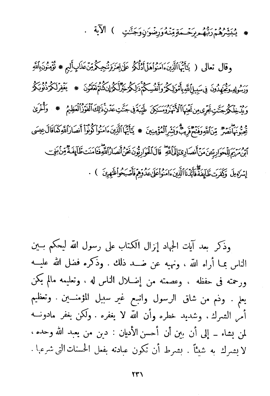 أَعْظَمُ دَرَجَةً عِنْدَ اللَّهِ وَأُولَئِكَ هُمُ الْفَائِزُونَ} {يُبَشِّرُهُمْ رَبُّهُمْ بِرَحْمَةٍ مِنْهُ وَرِضْوَانٍ وَجَنَّاتٍ} الْآيَةَ. وَقَالَ تَعَالَى {يَا أَيُّهَا الَّذِينَ آمَنُوا هَلْ أَدُلُّكُمْ عَلَى تِجَارَةٍ تُنْجِيكُمْ مِنْ عَذَابٍ أَلِيمٍ} {تُؤْمِنُونَ بِاللَّهِ وَرَسُولِهِ وَتُجَاهِدُونَ فِي سَبِيلِ اللَّهِ بِأَمْوَالِكُمْ وَأَنْفُسِكُمْ ذَلِكُمْ خَيْرٌ لَكُمْ إنْ كُنْتُمْ تَعْلَمُونَ} {يَغْفِرْ لَكُمْ ذُنُوبَكُمْ وَيُدْخِلْكُمْ جَنَّاتٍ تَجْرِي مِنْ تَحْتِهَا الْأَنْهَارُ وَمَسَاكِنَ طَيِّبَةً فِي جَنَّاتِ عَدْنٍ ذَلِكَ الْفَوْزُ الْعَظِيمُ} {وَأُخْرَى تُحِبُّونَهَا نَصْرٌ مِنَ اللَّهِ وَفَتْحٌ قَرِيبٌ وَبَشِّرِ الْمُؤْمِنِينَ} {يَا أَيُّهَا الَّذِينَ آمَنُوا كُونُوا أَنْصَارَ اللَّهِ كَمَا قَالَ عِيسَى ابْنُ مَرْيَمَ لِلْحَوَارِيِّينَ مَنْ أَنْصَارِي إلَى اللَّهِ قَالَ الْحَوَارِيُّونَ نَحْنُ أَنْصَارُ اللَّهِ فَآمَنَتْ طَائِفَةٌ مِنْ بَنِي إسْرَائِيلَ وَكَفَرَتْ طَائِفَةٌ فَأَيَّدْنَا الَّذِينَ آمَنُوا عَلَى عَدُوِّهِمْ فَأَصْبَحُوا ظَاهِرِينَ} . وَذَكَرَ بَعْدَ آيَاتِ الْجِهَادِ إنْزَالَ الْكِتَابِ عَلَى رَسُولِ اللَّهِ لِيَحْكُمَ بَيْنَ النَّاسِ بِمَا أَرَاهُ اللَّهُ وَنَهْيَهُ عَنْ ضِدِّ ذَلِكَ. وَذَكَّرَهُ فَضْلَ اللَّهِ عَلَيْهِ وَرَحْمَتَهُ فِي حِفْظِهِ وَعِصْمَتِهِ مِنْ إضْلَالِ النَّاسِ لَهُ وَتَعْلِيمِهِ مَا لَمْ يَكُنْ يَعْلَمُ. وَذَمَّ مَنْ شَاقَّ الرَّسُولَ وَاتَّبَعَ غَيْرَ سَبِيلِ الْمُؤْمِنِينَ. وَتَعْظِيمَ أَمْرِ الشِّرْكِ وَشَدِيدَ خَطَرِهِ وَأَنَّ اللَّهَ لَا يَغْفِرُهُ. وَلَكِنْ يَغْفِرُ مَا دُونَهُ لِمَنْ يَشَاءُ - إلَى أَنْ بَيَّنَ أَنَّ أَحْسَنَ الْأَدْيَانِ: دِينُ مَنْ يَعْبُدُ اللَّهَ وَحْدَهُ لَا يُشْرِكُ بِهِ شَيْئًا. بِشَرْطِ أَنْ تَكُونَ عِبَادَتُهُ بِفِعْلِ الْحَسَنَاتِ الَّتِي شَرَعَهَا