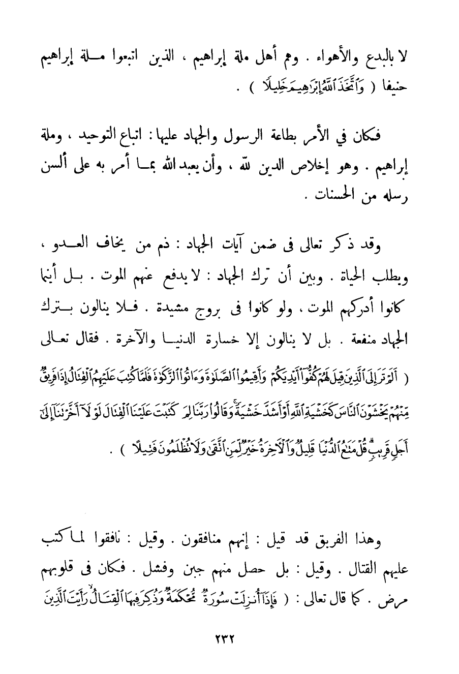 لَا بِالْبِدَعِ وَالْأَهْوَاءِ. وَهُمْ أَهْلُ مِلَّةِ إبْرَاهِيمَ الَّذِينَ اتَّبَعُوا مِلَّةَ إبْرَاهِيمَ حَنِيفًا {وَاتَّخَذَ اللَّهُ إبْرَاهِيمَ خَلِيلًا} . فَكَانَ فِي الْأَمْرِ بِطَاعَةِ الرَّسُولِ وَالْجِهَادِ عَلَيْهَا: اتِّبَاعُ التَّوْحِيدِ وَمِلَّةِ إبْرَاهِيمَ. وَهُوَ إخْلَاصُ الدِّينِ لِلَّهِ وَأَنْ يَعْبُدَ اللَّهَ بِمَا أَمَرَ بِهِ عَلَى أَلْسُنِ رُسُلِهِ مِنْ الْحَسَنَاتِ. وَقَدْ ذَكَرَ تَعَالَى فِي ضِمْنِ آيَاتِ الْجِهَادِ: ذَمَّ مَنْ يَخَافُ الْعَدُوَّ وَيَطْلُبُ الْحَيَاةَ. وَبَيَّنَ أَنَّ تَرْكَ الْجِهَادِ: لَا يَدْفَعُ عَنْهُمْ الْمَوْتَ. بَلْ أَيْنَمَا كَانُوا أَدْرَكَهُمْ الْمَوْتُ وَلَوْ كَانُوا فِي بُرُوجٍ مُشَيَّدَةٍ. فَلَا يَنَالُونَ بِتَرْكِ الْجِهَادِ مَنْفَعَةً. بَلْ لَا يَنَالُونَ إلَّا خَسَارَةَ الدُّنْيَا وَالْآخِرَةِ. فَقَالَ تَعَالَى {أَلَمْ تَرَ إلَى الَّذِينَ قِيلَ لَهُمْ كُفُّوا أَيْدِيَكُمْ وَأَقِيمُوا الصَّلَاةَ وَآتُوا الزَّكَاةَ فَلَمَّا كُتِبَ عَلَيْهِمُ الْقِتَالُ إذَا فَرِيقٌ مِنْهُمْ يَخْشَوْنَ النَّاسَ كَخَشْيَةِ اللَّهِ أَوْ أَشَدَّ خَشْيَةً وَقَالُوا رَبَّنَا لِمَ كَتَبْتَ عَلَيْنَا الْقِتَالَ لَوْلَا أَخَّرْتَنَا إلَى أَجَلٍ قَرِيبٍ قُلْ مَتَاعُ الدُّنْيَا قَلِيلٌ وَالْآخِرَةُ خَيْرٌ لِمَنِ اتَّقَى وَلَا تُظْلَمُونَ فَتِيلًا} . وَهَذَا الْفَرِيقُ قَدْ قِيلَ: إنَّهُمْ مُنَافِقُونَ. وَقِيلَ: نَافَقُوا لَمَّا كُتِبَ عَلَيْهِمْ الْقِتَالُ. وَقِيلَ: بَلْ حَصَلَ مِنْهُمْ جُبْنٌ وَفَشَلٌ. فَكَانَ فِي قُلُوبِهِمْ مَرَضٌ. كَمَا قَالَ تَعَالَى: {فَإِذَا أُنْزِلَتْ سُورَةٌ مُحْكَمَةٌ وَذُكِرَ فِيهَا الْقِتَالُ