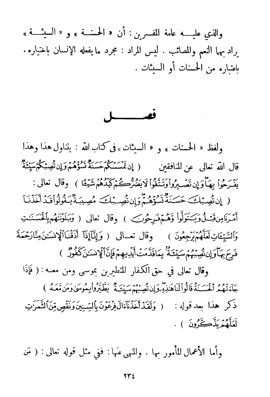 وَأَحْرَى. وَاَلَّذِي عَلَيْهِ عَامَّةُ الْمُفَسِّرِينَ: أَنَّ " الْحَسَنَةَ " و " السَّيِّئَةَ " يُرَادُ بِهِمَا النِّعَمَ وَالْمَصَائِبَ. لَيْسَ الْمُرَادُ: مُجَرَّدُ مَا يَفْعَلُهُ الْإِنْسَانُ بِاخْتِيَارِهِ بِاعْتِبَارِهِ مِنْ الْحَسَنَاتِ أَوْ السَّيِّئَاتِ.
