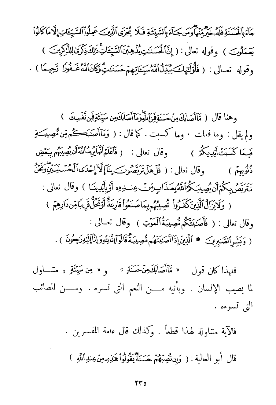 جَاءَ بِالْحَسَنَةِ فَلَهُ خَيْرٌ مِنْهَا وَمَنْ جَاءَ بِالسَّيِّئَةِ فَلَا يُجْزَى الَّذِينَ عَمِلُوا السَّيِّئَاتِ إلَّا مَا كَانُوا يَعْمَلُونَ} وقَوْله تَعَالَى {إنَّ الْحَسَنَاتِ يُذْهِبْنَ السَّيِّئَاتِ ذَلِكَ ذِكْرَى لِلذَّاكِرِينَ} وقَوْله تَعَالَى {فَأُولَئِكَ يُبَدِّلُ اللَّهُ سَيِّئَاتِهِمْ حَسَنَاتٍ وَكَانَ اللَّهُ غَفُورًا رَحِيمًا} . وَهُنَا قَالَ {مَا أَصَابَكَ مِنْ حَسَنَةٍ فَمِنَ اللَّهِ وَمَا أَصَابَكَ مِنْ سَيِّئَةٍ فَمِنْ نَفْسِكَ} وَلَمْ يَقُلْ: وَمَا فَعَلْت وَمَا كَسَبْت. كَمَا قَالَ: {وَمَا أَصَابَكُمْ مِنْ مُصِيبَةٍ فَبِمَا كَسَبَتْ أَيْدِيكُمْ} وَقَالَ تَعَالَى: {فَاعْلَمْ أَنَّمَا يُرِيدُ اللَّهُ أَنْ يُصِيبَهُمْ بِبَعْضِ ذُنُوبِهِمْ} وَقَالَ تَعَالَى: {قُلْ هَلْ تَرَبَّصُونَ بِنَا إلَّا إحْدَى الْحُسْنَيَيْنِ وَنَحْنُ نَتَرَبَّصُ بِكُمْ أَنْ يُصِيبَكُمُ اللَّهُ بِعَذَابٍ مِنْ عِنْدِهِ أَوْ بِأَيْدِينَا} وَقَالَ تَعَالَى: {وَلَا يَزَالُ الَّذِينَ كَفَرُوا تُصِيبُهُمْ بِمَا صَنَعُوا قَارِعَةٌ أَوْ تَحُلُّ قَرِيبًا مِنْ دَارِهِمْ} وَقَالَ تَعَالَى: {فَأَصَابَتْكُمْ مُصِيبَةُ الْمَوْتِ} وَقَالَ تَعَالَى: {وَبَشِّرِ الصَّابِرِينَ} {الَّذِينَ إذَا أَصَابَتْهُمْ مُصِيبَةٌ قَالُوا إنَّا لِلَّهِ وَإِنَّا إلَيْهِ رَاجِعُونَ} . فَلِهَذَا كَانَ قَوْلُ {مَا أَصَابَكَ مِنْ حَسَنَةٍ} و {مِنْ سَيِّئَةٍ} مُتَنَاوِلٌ لِمَا يُصِيبُ الْإِنْسَانَ وَيَأْتِيهِ مِنْ النِّعَمِ الَّتِي تَسُرُّهُ وَمِنْ الْمَصَائِبِ الَّتِي تَسُوءُهُ. فَالْآيَةُ مُتَنَاوِلَةٌ لِهَذَا قَطْعًا. وَكَذَلِكَ قَالَ عَامَّةُ الْمُفَسِّرِينَ. قَالَ أَبُو الْعَالِيَةِ: {وَإِنْ تُصِبْهُمْ حَسَنَةٌ يَقُولُوا هَذِهِ مِنْ عِنْدِ اللَّهِ}