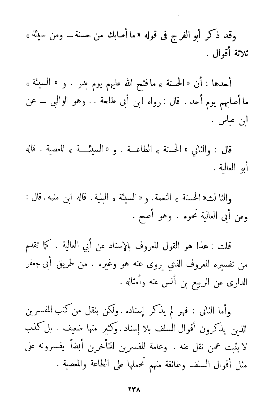 وَقَدْ ذَكَرَ أَبُو الْفَرَجِ فِي قَوْلِهِ " {مَا أَصَابَكَ مِنْ حَسَنَةٍ} - وَمِنْ سَيِّئَةٍ " ثَلَاثَةَ أَقْوَالٍ. أَحَدُهَا: أَنَّ " الْحَسَنَةَ " مَا فَتَحَ اللَّهُ عَلَيْهِمْ يَوْم بَدْرٍ. و " السَّيِّئَةَ " مَا أَصَابَهُمْ يَوْمَ أُحُدٍ. قَالَ: رَوَاهُ ابْنُ أَبِي طَلْحَةَ - وَهُوَ الوالبي - عَنْ ابْنِ عَبَّاسٍ. قَالَ: وَالثَّانِي " الْحَسَنَةُ " الطَّاعَةُ. و " السَّيِّئَةُ " الْمَعْصِيَةُ. قَالَهُ أَبُو الْعَالِيَةِ. وَالثَّالِثُ " الْحَسَنَةُ " النِّعْمَةُ. و " السَّيِّئَةُ " الْبَلِيَّةُ. قَالَهُ ابْنُ مُنَبِّهٍ. قَالَ: وَعَنْ أَبِي الْعَالِيَةِ نَحْوُهُ. وَهُوَ أَصَحُّ. قُلْت: هَذَا هُوَ الْقَوْلُ الْمَعْرُوفُ بِالْإِسْنَادِ عَنْ أَبِي الْعَالِيَةِ كَمَا تَقَدَّمَ مِنْ تَفْسِيرِهِ الْمَعْرُوفِ الَّذِي يُرْوَى عَنْهُ هُوَ وَغَيْرُهُ مِنْ طَرِيق أَبِي جَعْفَرٍ الداري عَنْ الرَّبِيعِ بْنِ أَنَسٍ عَنْهُ وَأَمْثَالِهِ. وَأَمَّا الثَّانِي: فَهُوَ لَمْ يَذْكُرْ إسْنَادَهُ. وَلَكِنْ يَنْقُلُ مِنْ كُتِبَ الْمُفَسِّرِينَ الَّذِينَ يَذْكُرُونَ أَقْوَالَ السَّلَفِ بِلَا إسْنَادٍ. وَكَثِيرٌ مِنْهَا ضَعِيفٌ. بَلْ كَذِبٌ لَا يَثْبُتُ عَمَّنْ نُقِلَ عَنْهُ. وَعَامَّةُ الْمُفَسِّرِينَ الْمُتَأَخِّرِينَ أَيْضًا يُفَسِّرُونَهُ عَلَى مِثْلِ أَقْوَالِ السَّلَفِ وَطَائِفَةٌ مِنْهُمْ تَحْمِلُهَا عَلَى الطَّاعَةِ وَالْمَعْصِيَةِ.