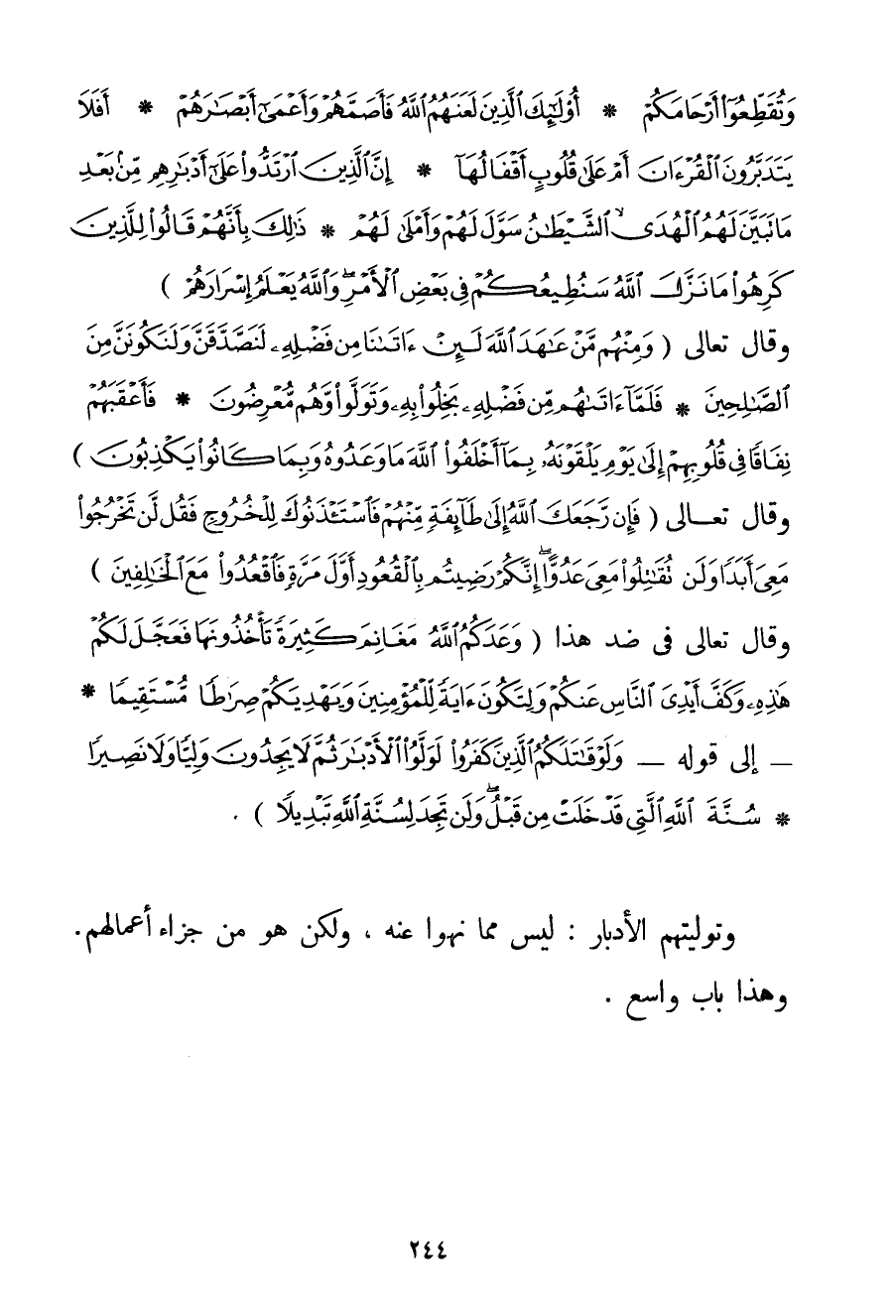 فِي الْأَرْضِ وَتُقَطِّعُوا أَرْحَامَكُمْ} {أُولَئِكَ الَّذِينَ لَعَنَهُمُ اللَّهُ فَأَصَمَّهُمْ وَأَعْمَى أَبْصَارَهُمْ} {أَفَلَا يَتَدَبَّرُونَ الْقُرْآنَ أَمْ عَلَى قُلُوبٍ أَقْفَالُهَا} {إنَّ الَّذِينَ ارْتَدُّوا عَلَى أَدْبَارِهِمْ مِنْ بَعْدِ مَا تَبَيَّنَ لَهُمُ الْهُدَى الشَّيْطَانُ سَوَّلَ لَهُمْ وَأَمْلَى لَهُمْ} {ذَلِكَ بِأَنَّهُمْ قَالُوا لِلَّذِينَ كَرِهُوا مَا نَزَّلَ اللَّهُ سَنُطِيعُكُمْ فِي بَعْضِ الْأَمْرِ وَاللَّهُ يَعْلَمُ إسْرَارَهُمْ} . وقال تَعَالَى {وَمِنْهُمْ مَنْ عَاهَدَ اللَّهَ لَئِنْ آتَانَا مِنْ فَضْلِهِ لَنَصَّدَّقَنَّ وَلَنَكُونَنَّ مِنَ الصَّالِحِينَ} {فَلَمَّا آتَاهُمْ مِنْ فَضْلِهِ بَخِلُوا بِهِ وَتَوَلَّوْا وَهُمْ مُعْرِضُونَ} {فَأَعْقَبَهُمْ نِفَاقًا فِي قُلُوبِهِمْ إلَى يَوْمِ يَلْقَوْنَهُ بِمَا أَخْلَفُوا اللَّهَ مَا وَعَدُوهُ وَبِمَا كَانُوا يَكْذِبُونَ} وَقَالَ تَعَالَى {فَإِنْ رَجَعَكَ اللَّهُ إلَى طَائِفَةٍ مِنْهُمْ فَاسْتَأْذَنُوكَ لِلْخُرُوجِ فَقُلْ لَنْ تَخْرُجُوا مَعِيَ أَبَدًا وَلَنْ تُقَاتِلُوا مَعِيَ عَدُوًّا إنَّكُمْ رَضِيتُمْ بِالْقُعُودِ أَوَّلَ مَرَّةٍ فَاقْعُدُوا مَعَ الْخَالِفِينَ} وَقَالَ تَعَالَى فِي ضِدِّ هَذَا {وَعَدَكُمُ اللَّهُ مَغَانِمَ كَثِيرَةً تَأْخُذُونَهَا فَعَجَّلَ لَكُمْ هَذِهِ وَكَفَّ أَيْدِيَ النَّاسِ عَنْكُمْ وَلِتَكُونَ آيَةً لِلْمُؤْمِنِينَ وَيَهْدِيَكُمْ صِرَاطًا مُسْتَقِيمًا} - إلَى قَوْلِهِ - {وَلَوْ قَاتَلَكُمُ الَّذِينَ كَفَرُوا لَوَلَّوُا الْأَدْبَارَ ثُمَّ لَا يَجِدُونَ وَلِيًّا وَلَا نَصِيرًا} {سُنَّةَ اللَّهِ الَّتِي قَدْ خَلَتْ مِنْ قَبْلُ وَلَنْ تَجِدَ لِسُنَّةِ اللَّهِ تَبْدِيلًا} . وَتَوْلِيَتُهُمْ الْأَدْبَارَ: لَيْسَ مِمَّا نُهُوا عَنْهُ وَلَكِنْ هُوَ مِنْ جَزَاءِ أَعْمَالِهِمْ. وَهَذَا بَابٌ وَاسِعٌ.