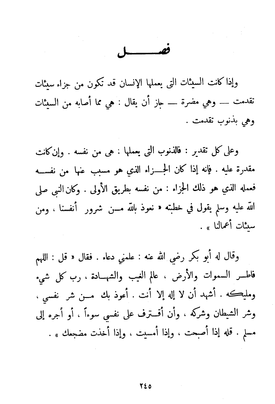 وَإِذَا كَانَتْ السَّيِّئَاتُ الَّتِي يَعْمَلُهَا الْإِنْسَانُ قَدْ تَكُونُ مِنْ جَزَاءِ سَيِّئَاتٍ تَقَدَّمَتْ - وَهِيَ مُضِرَّةٌ - جَازَ أَنْ يُقَالَ: هِيَ مِمَّا أَصَابَهُ مِنْ السَّيِّئَاتِ وَهِيَ بِذُنُوبِ تَقَدَّمَتْ. وَعَلَى كُلِّ تَقْدِيرٍ: فَالذُّنُوبُ الَّتِي يَعْمَلُهَا؛ هِيَ مِنْ نَفْسِهِ. وَإِنْ كَانَتْ مُقَدَّرَةً عَلَيْهِ. فَإِنَّهُ إذَا كَانَ الْجَزَاءُ الَّذِي هُوَ مُسَبَّبٌ عَنْهَا مِنْ نَفْسِهِ فَعَمَلُهُ الَّذِي هُوَ ذَلِكَ الْجَزَاءُ: مِنْ نَفْسِهِ بِطَرِيقِ الْأَوْلَى. وَكَانَ النَّبِيُّ صَلَّى اللَّهُ عَلَيْهِ وَسَلَّمَ يَقُولُ فِي خُطْبَتِهِ {نَعُوذُ بِاَللَّهِ مِنْ شُرُورِ أَنْفُسِنَا وَمِنْ سَيِّئَاتِ أَعْمَالِنَا} . {وَقَالَ لَهُ أَبُو بَكْرٍ رَضِيَ اللَّهُ عَنْهُ عَلِّمْنِي دُعَاءً. فَقَالَ قُلْ: اللَّهُمَّ فَاطِرَ السَّمَوَاتِ وَالْأَرْضِ عَالِمَ الْغَيْبِ وَالشَّهَادَةِ رَبَّ كُلِّ شَيْءٍ وَمَلِيكَهُ. أَشْهَدُ أَنْ لَا إلَهَ إلَّا أَنْتَ. أَعُوذُ بِك مِنْ شَرِّ نَفْسِي وَشَرِّ الشَّيْطَانِ وَشِرْكِهِ وَأَنْ أَقْتَرِفَ عَلَى نَفْسِي سُوءًا أَوْ أَجُرَّهُ إلَى مُسْلِمٍ. قُلْهُ إذَا أَصْبَحْت وَإِذَا أَمْسَيْت وَإِذَا أَخَذْت مَضْجَعَك} .