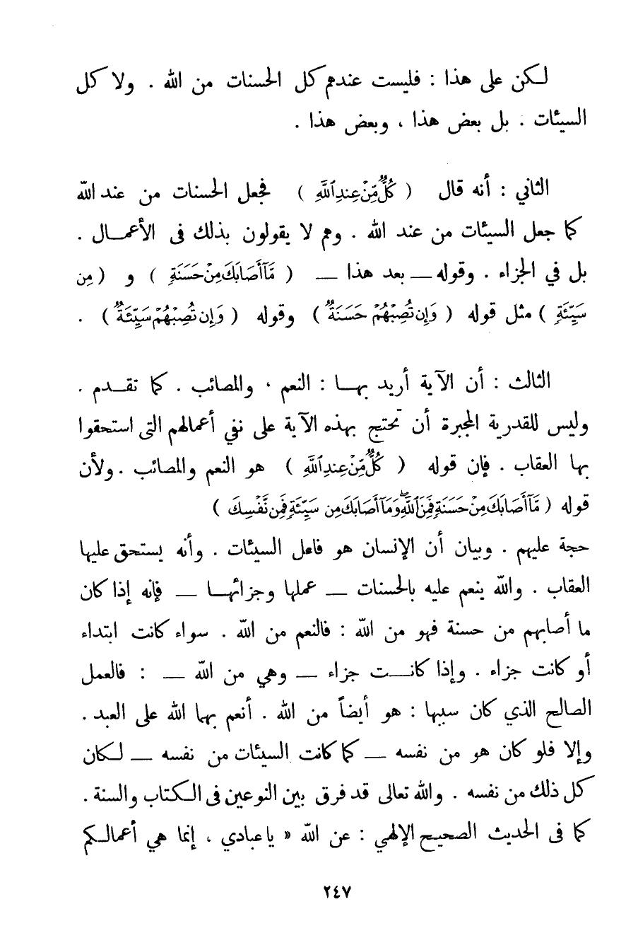 لَكِنْ عَلَى هَذَا: فَلَيْسَتْ عِنْدَهُمْ كُلُّ الْحَسَنَاتِ مِنْ اللَّهِ. وَلَا كُلُّ السَّيِّئَاتِ. بَلْ بَعْضُ هَذَا وَبَعْضُ هَذَا. الثَّانِي: أَنَّهُ قَالَ {كُلٌّ مِنْ عِنْدِ اللَّهِ} فَجَعَلَ الْحَسَنَاتِ مِنْ عِنْدِ اللَّهِ كَمَا جَعَلَ السَّيِّئَاتِ مِنْ عِنْدِ اللَّهِ. وَهُمْ لَا يَقُولُونَ بِذَلِكَ فِي الْأَعْمَالِ. بَلْ فِي الْجَزَاءِ. وَقَوْلُهُ - بَعْدَ هَذَا - {مَا أَصَابَكَ مِنْ حَسَنَةٍ} و {مِنْ سَيِّئَةٍ} مِثْلُ قَوْلِهِ {وَإِنْ تُصِبْهُمْ حَسَنَةٌ} وَقَوْلُهُ {وَإِنْ تُصِبْهُمْ سَيِّئَةٌ} . الثَّالِثُ: أَنَّ الْآيَةَ أُرِيدَ بِهَا: النِّعَمُ وَالْمَصَائِبُ. كَمَا تَقَدَّمَ. وَلَيْسَ لِلْقَدَرِيَّةِ الْمُجْبِرَةِ أَنْ تَحْتَجَّ بِهَذِهِ الْآيَةِ عَلَى نَفْيِ أَعْمَالِهِمْ الَّتِي اسْتَحَقُّوا بِهَا الْعِقَابَ. فَإِنَّ قَوْلَهُ {كُلٌّ مِنْ عِنْدِ اللَّهِ} هُوَ النِّعَمُ وَالْمَصَائِبُ. وَلِأَنَّ قَوْلَهُ {مَا أَصَابَكَ مِنْ حَسَنَةٍ فَمِنَ اللَّهِ وَمَا أَصَابَكَ مِنْ سَيِّئَةٍ فَمِنْ نَفْسِكَ} حُجَّةٌ عَلَيْهِمْ. وَبَيَانُ أَنَّ الْإِنْسَانَ هُوَ فَاعِلُ السَّيِّئَاتِ. وَأَنَّهُ يَسْتَحِقُّ عَلَيْهَا الْعِقَابَ. وَاَللَّهُ يُنْعِمُ عَلَيْهِ بِالْحَسَنَاتِ - عَمَلِهَا وَجَزَائِهَا - فَإِنَّهُ إذَا كَانَ مَا أَصَابَهُمْ مِنْ حَسَنَةٍ فَهُوَ مِنْ اللَّهِ: فَالنِّعَمُ مِنْ اللَّهِ. سَوَاءٌ كَانَتْ ابْتِدَاءً أَوْ كَانَتْ جَزَاءً. وَإِذَا كَانَتْ جَزَاءً - وَهِيَ مِنْ اللَّهِ -: فَالْعَمَلُ الصَّالِحُ الَّذِي كَانَ سَبَبَهَا: هُوَ أَيْضًا مِنْ اللَّهِ. أَنْعَمَ بِهِمَا اللَّهُ عَلَى الْعَبْدِ. وَإِلَّا فَلَوْ كَانَ هُوَ مِنْ نَفْسِهِ - كَمَا كَانَتْ السَّيِّئَاتُ مِنْ نَفْسِهِ - لَكَانَ كُلُّ ذَلِكَ مِنْ نَفْسِهِ. وَاَللَّهُ تَعَالَى قَدْ فَرَّقَ بَيْنَ النَّوْعَيْنِ فِي الْكِتَابِ وَالسُّنَّةِ. كَمَا فِي الْحَدِيثِ الصَّحِيحِ الْإِلَهِيِّ: {عَنْ اللَّهِ يَا عِبَادِي إنَّمَا هِيَ أَعْمَالُكُمْ