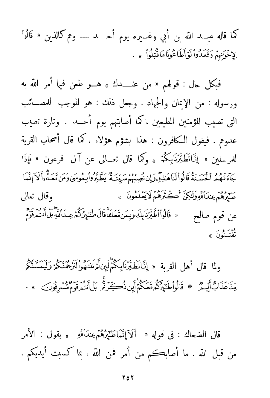 كَمَا قَالَهُ عَبْدُ اللَّهِ بْنُ أبي وَغَيْرُهُ يَوْمَ أُحُدٍ - وَهُمْ كَاَلَّذِينَ {قَالُوا لِإِخْوَانِهِمْ وَقَعَدُوا لَوْ أَطَاعُونَا مَا قُتِلُوا} . فَبِكُلِّ حَالٍ: قَوْلُهُمْ " مِنْ عِنْدك " هُوَ طَعْنٌ فِيمَا أَمَرَ اللَّهُ بِهِ وَرَسُولُهُ: مِنْ الْإِيمَانِ وَالْجِهَادِ. وَجَعَلَ ذَلِك: هُوَ الْمُوجِبُ لِلْمَصَائِبِ الَّتِي تُصِيبُ الْمُؤْمِنِينَ الْمُطِيعِينَ، كَمَا أَصَابَتْهُمْ يَوْمَ أُحُدٍ. وَتَارَةً تُصِيبُ عَدُوَّهُمْ. فَيَقُولُ الْكَافِرُونَ: هَذَا بِشُؤْمِ هَؤُلَاءِ، كَمَا قَالَ أَصْحَابُ الْقَرْيَةِ لِلْمُرْسَلِينَ {إنَّا تَطَيَّرْنَا بِكُمْ} وَكَمَا قَالَ تَعَالَى عَنْ آلِ فِرْعَوْنَ {فَإِذَا جَاءَتْهُمُ الْحَسَنَةُ قَالُوا لَنَا هَذِهِ وَإِنْ تُصِبْهُمْ سَيِّئَةٌ يَطَّيَّرُوا بِمُوسَى وَمَنْ مَعَهُ أَلَا إنَّمَا طَائِرُهُمْ عِنْدَ اللَّهِ وَلَكِنَّ أَكْثَرَهُمْ لَا يَعْلَمُونَ} وَقَالَ تَعَالَى عَنْ قَوْمِ صَالِحٍ {قَالُوا اطَّيَّرْنَا بِكَ وَبِمَنْ مَعَكَ قَالَ طَائِرُكُمْ عِنْدَ اللَّهِ بَلْ أَنْتُمْ قَوْمٌ تُفْتَنُونَ} وَلَمَّا قَالَ أَهْلُ الْقَرْيَةِ {إنَّا تَطَيَّرْنَا بِكُمْ لَئِنْ لَمْ تَنْتَهُوا لَنَرْجُمَنَّكُمْ وَلَيَمَسَّنَّكُمْ مِنَّا عَذَابٌ أَلِيمٌ} {قَالُوا طَائِرُكُمْ مَعَكُمْ أَئِنْ ذُكِّرْتُمْ بَلْ أَنْتُمْ قَوْمٌ مُسْرِفُونَ} . قَالَ الضَّحَّاكُ: فِي قَوْلِهِ {أَلَا إنَّمَا طَائِرُهُمْ عِنْدَ اللَّهِ} يَقُول: الْأَمْرُ مِنْ قِبَلِ اللَّهِ مَا أَصَابَكُمْ مِنْ أَمْرٍ فَمِنْ اللَّهِ، بِمَا كَسَبَتْ أَيْدِيكُمْ.