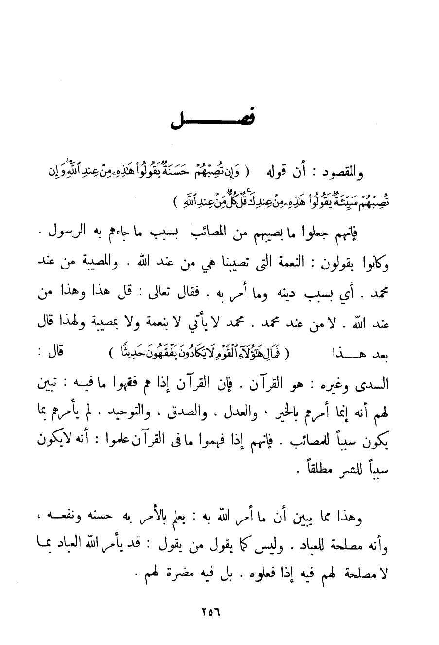 وَالْمَقْصُودُ: أَنَّ قَوْلَهُ {وَإِنْ تُصِبْهُمْ حَسَنَةٌ يَقُولُوا هَذِهِ مِنْ عِنْدِ اللَّهِ وَإِنْ تُصِبْهُمْ سَيِّئَةٌ يَقُولُوا هَذِهِ مِنْ عِنْدِكَ قُلْ كُلٌّ مِنْ عِنْدِ اللَّهِ} فَإِنَّهُمْ جَعَلُوا مَا يُصِيبهُمْ مِنْ الْمَصَائِبِ بِسَبَبِ مَا جَاءَهُمْ بِهِ الرَّسُولُ. وَكَانُوا يَقُولُونَ: النِّعْمَةُ الَّتِي تُصِيبُنَا هِيَ مِنْ عِنْدِ اللَّهِ. وَالْمُصِيبَةُ مِنْ عِنْدِ مُحَمَّدٍ. أَيْ بِسَبَبِ دِينِهِ وَمَا أَمَرَ بِهِ. فَقَالَ تَعَالَى: قُلْ هَذَا وَهَذَا مِنْ عِنْدِ اللَّهِ. لَا مِنْ عِنْدِ مُحَمَّدٍ. مُحَمَّدٌ لَا يَأْتِي لَا بِنِعْمَةِ وَلَا بِمُصِيبَةِ وَلِهَذَا قَالَ بَعْدَ هَذَا {فَمَالِ هَؤُلَاءِ الْقَوْمِ لَا يَكَادُونَ يَفْقَهُونَ حَدِيثًا} قَالَ: السدي وَغَيْرُهُ: هُوَ الْقُرْآنُ. فَإِنَّ الْقُرْآنَ إذَا هُمْ فَقُهُوا مَا فِيهِ: تَبَيَّنَ لَهُمْ أَنَّهُ إنَّمَا أَمَرَهُمْ بِالْخَيْرِ، وَالْعَدْلِ، وَالصَّدْقِ، وَالتَّوْحِيدِ. لَمْ يَأْمُرْهُمْ بِمَا يَكُونُ سَبَبًا لِلْمَصَائِبِ. فَإِنَّهُمْ إذَا فَهِمُوا مَا فِي الْقُرْآنِ عَلِمُوا: أَنَّهُ لَا يَكُونُ سَبَبًا لِلشَّرِّ مُطْلَقًا. وَهَذَا مِمَّا يُبَيِّنُ أَنَّ مَا أَمَرَ اللَّهُ بِهِ: يَعْلَمُ بِالْأَمْرِ بِهِ حَسَنِهِ وَنَفْعِهِ، وَأَنَّهُ مَصْلَحَةٌ لِلْعِبَادِ. وَلَيْسَ كَمَا يَقُولُ مَنْ يَقُولُ: قَدْ يَأْمُرُ اللَّهُ الْعِبَادَ بِمَا لَا مَصْلَحَةَ لَهُمْ فِيهِ إذَا فَعَلُوهُ. بَلْ فِيهِ مَضَرَّةٌ لَهُمْ.