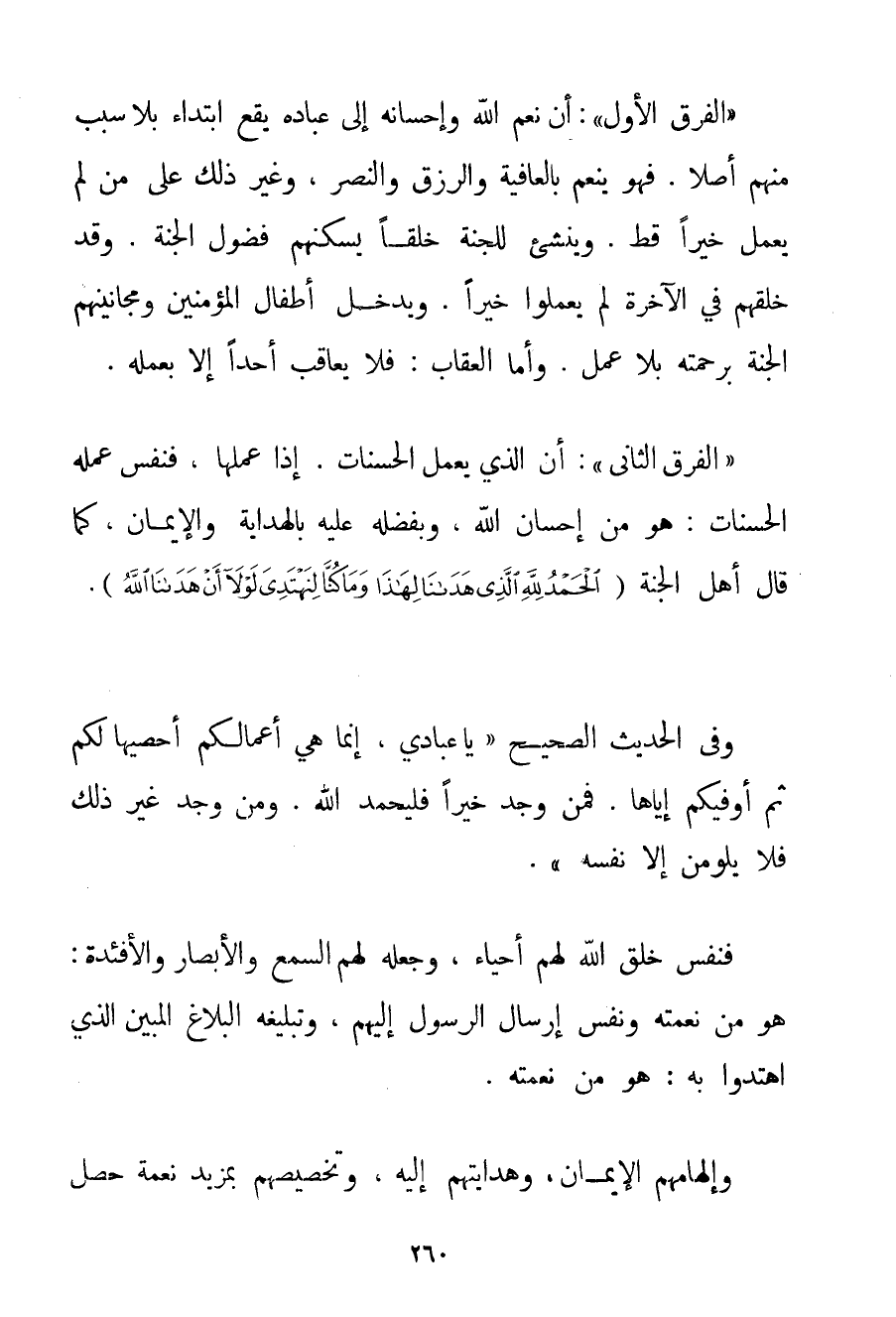 " الْفَرْقُ الْأَوَّلُ ": أَنَّ نِعَمَ اللَّهِ وَإِحْسَانَهُ إلَى عِبَادِهِ يَقَعُ ابْتِدَاءً بِلَا سَبَبٍ مِنْهُمْ أَصْلًا. فَهُوَ يُنْعِمُ بِالْعَافِيَةِ وَالرِّزْقِ وَالنَّصْرِ، وَغَيْرِ ذَلِك عَلَى مَنْ لَمْ يَعْمَلْ خَيْرًا قَطُّ. وَيُنْشِئُ لِلْجَنَّةِ خَلْقًا يُسْكِنُهُمْ فُضُولَ الْجَنَّةِ. وَقَدْ خَلَقَهُمْ فِي الْآخِرَةِ لَمْ يَعْمَلُوا خَيْرًا. وَيُدْخِلُ أَطْفَالَ الْمُؤْمِنِينَ وَمَجَانِينَهُمْ الْجَنَّةَ بِرَحْمَتِهِ بِلَا عَمَلٍ. وَأَمَّا الْعِقَابُ: فَلَا يُعَاقِبُ أَحَدًا إلَّا بِعَمَلِهِ. " الْفَرْقُ الثَّانِي ": أَنَّ الَّذِي يَعْمَلُ الْحَسَنَاتِ. إذَا عَمِلَهَا، فَنَفْسُ عَمَلِهِ الْحَسَنَاتِ: هو من إحْسَانِ اللَّهِ، وَبِفَضْلِهِ عَلَيْهِ بِالْهِدَايَةِ وَالْإِيمَانِ، كَمَا قَالَ أَهْلُ الْجَنَّةِ {الْحَمْدُ لِلَّهِ الَّذِي هَدَانَا لِهَذَا وَمَا كُنَّا لِنَهْتَدِيَ لَوْلَا أَنْ هَدَانَا اللَّهُ} . وَفِي الْحَدِيثِ الصَّحِيحِ {يَا عِبَادِي، إنَّمَا هِيَ أَعْمَالُكُمْ أُحْصِيهَا لَكُمْ ثُمَّ أُوَفِّيكُمْ إيَّاهَا. فَمَنْ وَجَدَ خَيْرًا فَلْيَحْمَدْ اللَّهَ. وَمَنْ وَجَدَ غَيْرَ ذَلِك فَلَا يَلُومَنَّ إلَّا نَفْسَهُ} . فَنَفْسُ خَلْقِ اللَّهِ لَهُمْ أَحِيَاءً، وَجَعْلِهِ لهم السَّمْعَ وَالْأَبْصَارَ وَالْأَفْئِدَةَ: هو من نِعْمَتِهِ وَنَفْسُ إرْسَالِ الرَّسُولِ إلَيْهِمْ، وَتَبْلِيغِهِ الْبَلَاغَ الْمُبِينَ الذي اهْتَدَوْا به: هو من نِعْمَتِهِ. وَإِلْهَامُهُمْ الْإِيمَانَ، وَهِدَايَتُهُمْ إلَيْهِ، وَتَخْصِيصُهُمْ بِمَزِيدِ نِعْمَةٍ حَصَلَ