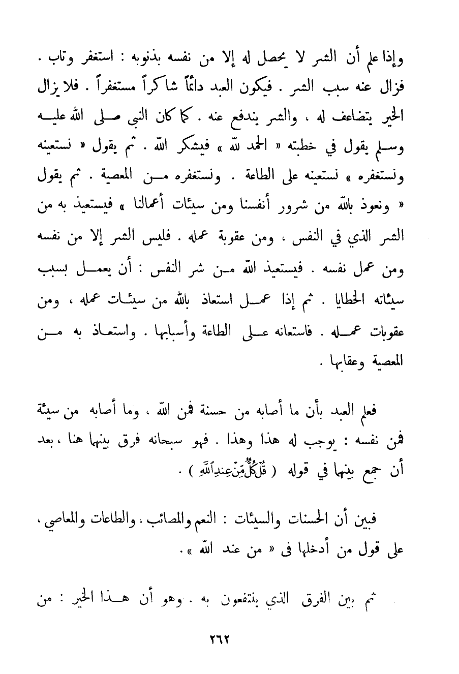 وَإِذَا عَلِمَ أَنَّ الشَّرَّ لَا يَحْصُلُ لَهُ إلَّا مِنْ نَفْسِهِ بِذُنُوبِهِ: اسْتَغْفَرَ وَتَابَ. فَزَالَ عَنْهُ سَبَبُ الشَّرِّ. فَيَكُونُ الْعَبْدُ دَائِمًا شَاكِرًا مُسْتَغْفِرًا. فَلَا يَزَالُ الْخَيْرُ يَتَضَاعَفُ لَهُ، وَالشَّرُّ يَنْدَفِعُ عَنْهُ. كَمَا {كَانَ النَّبِيُّ صَلَّى اللَّهُ عَلَيْهِ وَسَلَّمَ يَقُولُ فِي خُطْبَتِهِ الْحَمْدُ لِلَّهِ فَيَشْكُرُ اللَّهَ. ثُمَّ يَقُولُ نَسْتَعِينُهُ وَنَسْتَغْفِرُهُ نَسْتَعِينُهُ عَلَى الطَّاعَةِ. وَنَسْتَغْفِرُهُ مِنْ الْمَعْصِيَةِ. ثُمَّ يَقُولُ وَنَعُوذُ بِاَللَّهِ مِنْ شُرُورِ أَنْفُسِنَا وَمِنْ سَيِّئَاتِ أَعْمَالِنَا} فَيَسْتَعِيذُ بِهِ مِنْ الشَّرِّ الَّذِي فِي النَّفْسِ، وَمِنْ عُقُوبَةِ عَمَلِهِ. فَلَيْسَ الشَّرُّ إلَّا مِنْ نَفْسِهِ وَمِنْ عَمَلِ نَفْسِهِ. فَيَسْتَعِيذُ اللَّهَ مِنْ شَرِّ النَّفْسِ: أَنْ يَعْمَلَ بِسَبَبِ سَيِّئَاتِهِ الْخَطَايَا. ثُمَّ إذَا عَمِلَ اسْتَعَاذَ بِاَللَّهِ مِنْ سَيِّئَاتِ عَمَلِهِ، وَمِنْ عُقُوبَاتِ عَمَلِهِ. فَاسْتَعَانَهُ عَلَى الطَّاعَةِ وَأَسْبَابِهَا. وَاسْتَعَاذَ بِهِ مِنْ الْمَعْصِيَةِ وَعِقَابِهَا. فَعَلِمَ الْعَبْدُ بِأَنَّ مَا أَصَابَهُ مِنْ حَسَنَةٍ فَمِنْ اللَّهِ، وَمَا أَصَابَهُ مِنْ سَيِّئَةٍ فَمِنْ نَفْسِهِ: يُوجِبُ لَهُ هَذَا وَهَذَا. فَهُوَ سُبْحَانَهُ فَرَّقَ بَيْنَهُمَا هُنَا، بَعْدَ أَنْ جَمَعَ بَيْنَهُمَا فِي قَوْلِهِ {قُلْ كُلٌّ مِنْ عِنْدِ اللَّهِ} . فَبَيَّنَ أَنَّ الْحَسَنَاتِ وَالسَّيِّئَاتِ: النِّعَمَ وَالْمَصَائِبَ، وَالطَّاعَاتِ وَالْمَعَاصِي، عَلَى قَوْلِ مَنْ أَدْخَلَهَا فِي " مِنْ عِنْدِ اللَّهِ ". ثُمَّ بَيَّنَ الْفَرْقَ الَّذِي يَنْتَفِعُونَ بِهِ. وَهُوَ أَنَّ هَذَا الْخَيْرَ: مِنْ