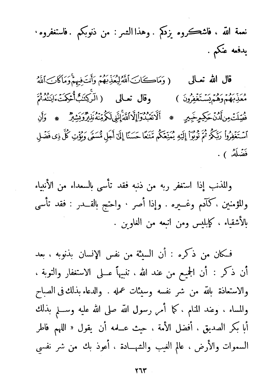 نِعْمَةِ اللَّهِ، فَاشْكُرُوهُ يَزِدْكُمْ. وَهَذَا الشَّرُّ: مِنْ ذُنُوبِكُمْ. فَاسْتَغْفِرُوهُ، يَدْفَعُهُ عَنْكُمْ. قَالَ اللَّهُ تَعَالَى {وَمَا كَانَ اللَّهُ لِيُعَذِّبَهُمْ وَأَنْتَ فِيهِمْ وَمَا كَانَ اللَّهُ مُعَذِّبَهُمْ وَهُمْ يَسْتَغْفِرُونَ} وَقَالَ تَعَالَى {الر كِتَابٌ أُحْكِمَتْ آيَاتُهُ ثُمَّ فُصِّلَتْ مِنْ لَدُنْ حَكِيمٍ خَبِيرٍ} {أَلَّا تَعْبُدُوا إلَّا اللَّهَ إنَّنِي لَكُمْ مِنْهُ نَذِيرٌ وَبَشِيرٌ} {وَأَنِ اسْتَغْفِرُوا رَبَّكُمْ ثُمَّ تُوبُوا إلَيْهِ يُمَتِّعْكُمْ مَتَاعًا حَسَنًا إلَى أَجَلٍ مُسَمًّى وَيُؤْتِ كُلَّ ذِي فَضْلٍ فَضْلَهُ} . وَالْمُذْنِبُ إذَا اسْتَغْفَرَ رَبَّهُ مِنْ ذَنْبِهِ فَقَدْ تَأَسَّى بِالسُّعَدَاءِ مِنْ الْأَنْبِيَاءِ وَالْمُؤْمِنِينَ، كَآدَمَ وَغَيْرِهِ. وَإِذَا أَصَرَّ، وَاحْتَجَّ بِالْقَدَرِ: فَقَدْ تَأَسَّى بِالْأَشْقِيَاءِ، كإبليس وَمَنْ اتَّبَعَهُ مِنْ الْغَاوِينَ. فَكَانَ مِنْ ذِكْرِهِ: أن السَّيِّئَةَ من نَفْسِ الْإِنْسَانِ بِذُنُوبِهِ، بَعْدَ أَنْ ذَكَرَ: أن الْجَمِيعَ من عِنْدِ اللَّهِ، تَنْبِيهًا عَلَى الِاسْتِغْفَارِ وَالتَّوْبَةِ، وَالِاسْتِعَاذَةِ بِاَللَّهِ مِنْ شَرِّ نَفْسِهِ وَسَيِّئَاتِ عَمَلِهِ. وَالدُّعَاءُ بِذَلِك فِي الصَّبَاحِ وَالْمُسَاءِ، وَعِنْدَ الْمَنَامِ، كَمَا {أَمَرَ رَسُولُ اللَّه صَلَّى اللَّهُ عَلَيْهِ وَسَلَّمَ بِذَلِك أَبَا بَكْرٍ الصِّدِّيقَ، أَفْضَلَ الْأُمَّةِ، حَيْثُ عَلَّمَهُ أَنْ يَقُولَ اللَّهُمَّ فَاطِرَ السَّمَوَاتِ وَالْأَرْضِ، عَالِمَ الْغَيْبِ وَالشَّهَادَةِ، أَعُوذُ بِك مِنْ شَرِّ نَفْسِي