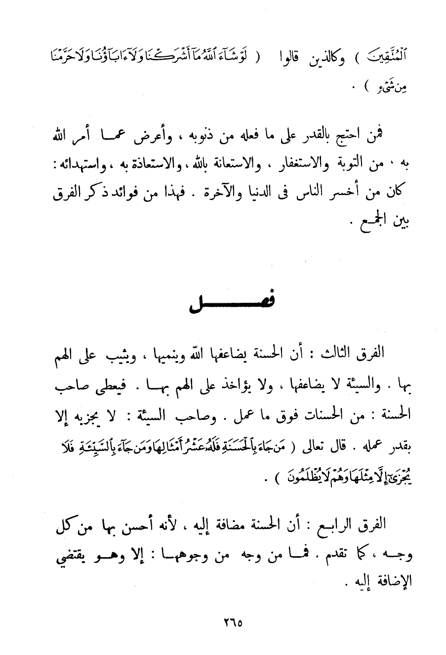 الْفَرْقُ الثَّالِثُ: أَنَّ الْحَسَنَةَ يُضَاعِفُهَا اللَّهُ وَيُنَمِّيهَا، وَيُثِيبُ عَلَى الْهَمِّ بِهَا. وَالسَّيِّئَةُ لَا يُضَاعِفُهَا، وَلَا يُؤَاخِذُ عَلَى الْهَمِّ بِهَا فَيُعْطِي صَاحِبَ الْحَسَنَةِ: مِنْ الْحَسَنَاتِ فَوْقَ مَا عَمِلَ. وَصَاحِبُ السَّيِّئَةِ: لَا يُجْزِيهِ إلَّا بِقَدْرِ عَمَلِهِ. قَالَ تَعَالَى {مَنْ جَاءَ بِالْحَسَنَةِ فَلَهُ عَشْرُ أَمْثَالِهَا وَمَنْ جَاءَ بِالسَّيِّئَةِ فَلَا يُجْزَى إلَّا مِثْلَهَا وَهُمْ لَا يُظْلَمُونَ} . الْفَرْقُ الرَّابِعُ: أَنَّ الْحَسَنَةَ مُضَافَةٌ إلَيْهِ، لِأَنَّهُ أَحَسَنَ بِهَا مِنْ كُلِّ وَجْهٍ، كَمَا تَقَدَّمَ. فَمَا مِنْ وَجْهٍ مِنْ وُجُوهِهَا: إلَّا وَهُوَ يَقْتَضِي الْإِضَافَةَ إلَيْهِ.