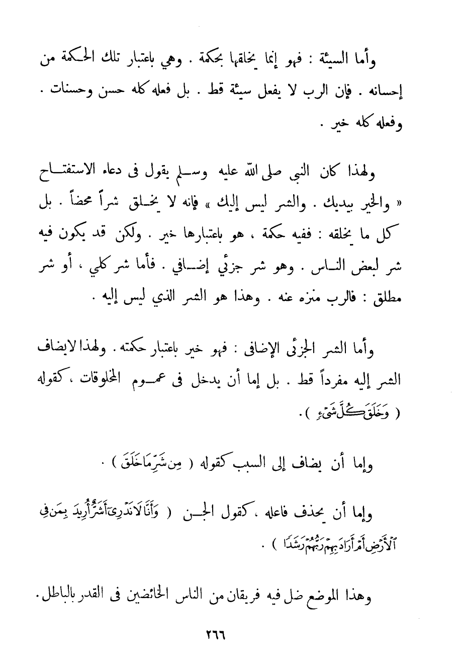 وَأَمَّا السَّيِّئَةُ: فَهُوَ إنَّمَا يَخْلُقُهَا بِحِكْمَةِ. وَهِيَ بِاعْتِبَارِ تِلْكَ الْحِكْمَةِ مِنْ إحْسَانِهِ. فَإِنَّ الرَّبَّ لَا يَفْعَلُ سَيِّئَةً قَطُّ. بَلْ فِعْلُهُ كُلُّهُ حَسَنٌ وَحَسَنَاتٌ. وَفِعْلُهُ كُلُّهُ خَيْرٌ. وَلِهَذَا {كَانَ النَّبِيُّ صَلَّى اللَّهُ عَلَيْهِ وَسَلَّمَ يَقُولُ فِي دُعَاءِ الِاسْتِفْتَاحِ وَالْخَيْرُ بِيَدَيْك. وَالشَّرُّ لَيْسَ إلَيْك} فَإِنَّهُ لَا يَخْلُق شَرًّا مَحْضًا. بَلْ كُلُّ مَا يَخْلُقُهُ: فَفِيهِ حِكْمَةٌ، هُوَ بِاعْتِبَارِهَا خَيْرٌ. وَلَكِنْ قَدْ يَكُونُ فِيهِ شَرٌّ لِبَعْضِ النَّاسِ. وَهُوَ شَرٌّ جُزْئِيٌّ إضَافِيٌّ. فَأَمَّا شَرٌّ كُلِّيٌّ، أَوْ شَرٌّ مُطْلَقٌ: فَالرَّبُّ مُنَزَّهٌ عَنْهُ. وَهَذَا هُوَ الشَّرُّ الَّذِي لَيْسَ إلَيْهِ. وَأَمَّا الشَّرُّ الْجُزْئِيُّ الْإِضَافِيُّ: فَهُوَ خَيْرٌ بِاعْتِبَارِ حِكْمَتِهِ. وَلِهَذَا لَا يُضَافُ الشَّرُّ إلَيْهِ مُفْرَدًا قَطُّ. بَلْ إمَّا أَنْ يَدْخُلَ فِي عُمُومِ الْمَخْلُوقَاتِ، كَقَوْلِهِ {وَخَلَقَ كُلَّ شَيْءٍ} . وَإِمَّا أَنْ يُضَافَ إلَى السَّبَبِ كَقَوْلِهِ {مِنْ شَرِّ مَا خَلَقَ} . وَإِمَّا أَنْ يُحْذَفَ فَاعِلُهُ، كَقَوْلِ الْجِنِّ {وَأَنَّا لَا نَدْرِي أَشَرٌّ أُرِيدَ بِمَنْ فِي الْأَرْضِ أَمْ أَرَادَ بِهِمْ رَبُّهُمْ رَشَدًا} . وَهَذَا الْمَوْضِعُ ضَلَّ فِيهِ فَرِيقَانِ مِنْ النَّاسِ الْخَائِضِينَ فِي الْقَدَرِ بِالْبَاطِلِ: