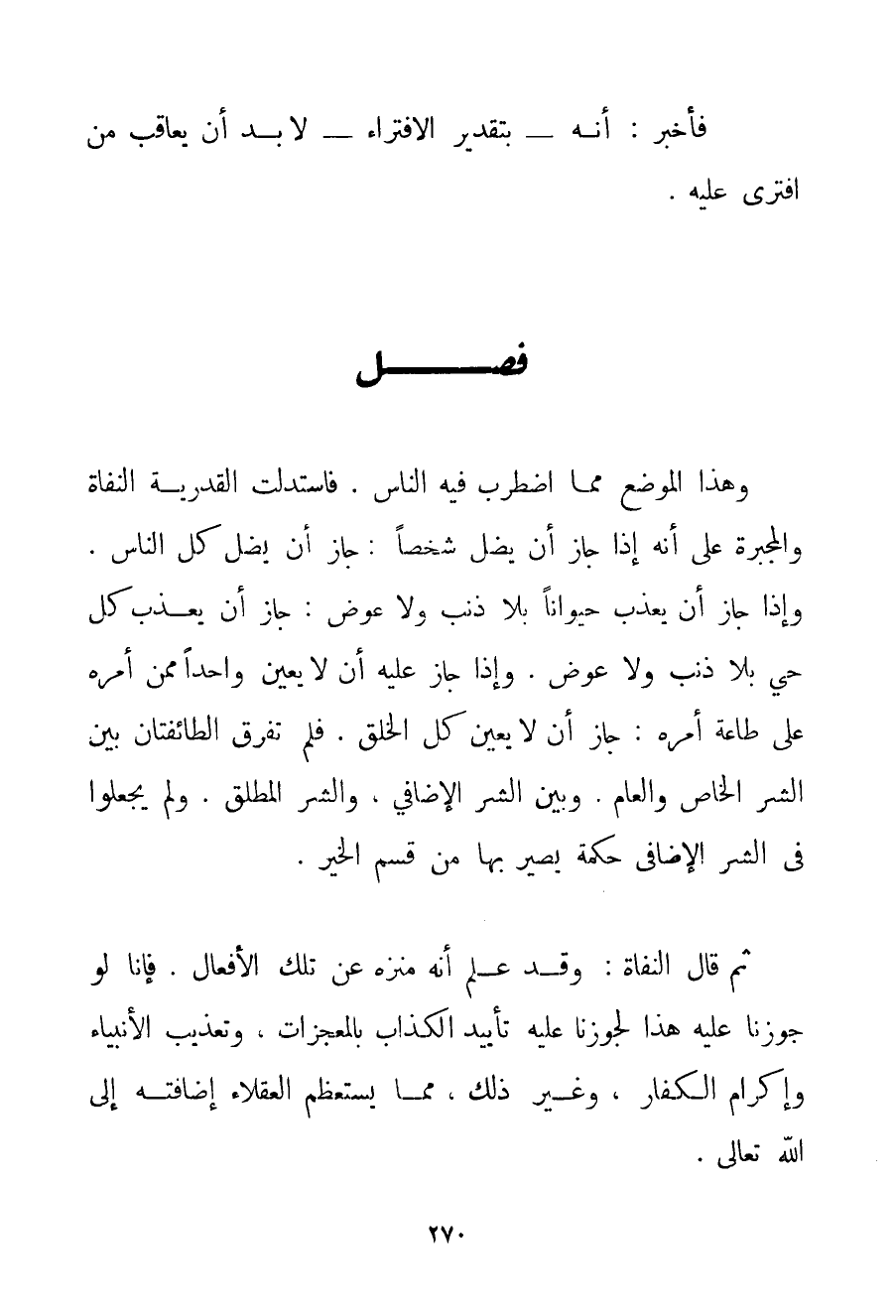 وَهَذَا الْمَوْضِعُ مِمَّا اضْطَرَبَ فِيهِ النَّاسُ، فَاسْتَدَلَّتْ الْقَدَرِيَّةُ الْنُّفَاةِ وَالْمُجْبِرَةُ عَلَى أَنَّهُ إذَا جَازَ أَنْ يُضِلَّ شَخْصًا: جَازَ أَنْ يُضِلَّ كُلَّ النَّاسِ. وَإِذَا جَازَ أَنْ يُعَذِّبَ حَيَوَانًا بِلَا ذَنْبٍ وَلَا عِوَضٍ: جَازَ أَنْ يُعَذِّبَ كُلَّ حَيٍّ بِلَا ذَنْبٍ وَلَا عِوَضٍ. وَإِذَا جَازَ عَلَيْهِ أَنْ لَا يُعِينَ وَاحِدًا مِمَّنْ أَمَرَهُ عَلَى طَاعَةِ أَمْرِهِ: جَازَ أَنْ لَا يُعِينَ كُلَّ الْخَلْقِ. فَلَمْ تُفَرِّقْ الطَّائِفَتَانِ بَيْنَ الشَّرِّ الْخَاصِّ وَالْعَامِّ. وَبَيْنَ الشَّرِّ الْإِضَافِيِّ، وَالشَّرِّ الْمُطْلَقِ. وَلَمْ يَجْعَلُوا فِي الشَّرِّ الْإِضَافِيِّ حِكْمَةً يَصِيرُ بِهَا مِنْ قِسْمِ الْخَيْرِ. ثُمَّ قَالَ الْنُّفَاةِ: وَقَدْ عَلِمَ أَنَّهُ مُنَزَّهٌ عَنْ تِلْكَ الْأَفْعَالِ. فَإِنَّا لَوْ جَوَّزْنَا عَلَيْهِ هَذَا لَجَوَّزْنَا عَلَيْهِ تَأْيِيدَ الْكَذَّابِ بِالْمُعْجِزَاتِ، وَتَعْذِيبَ الْأَنْبِيَاءِ وَإِكْرَامَ الْكُفَّارِ، وَغَيْرَ ذَلِك، مِمَّا يَسْتَعْظِمُ الْعُقَلَاءُ إضَافَتَهُ إلَى اللَّهِ تَعَالَى.