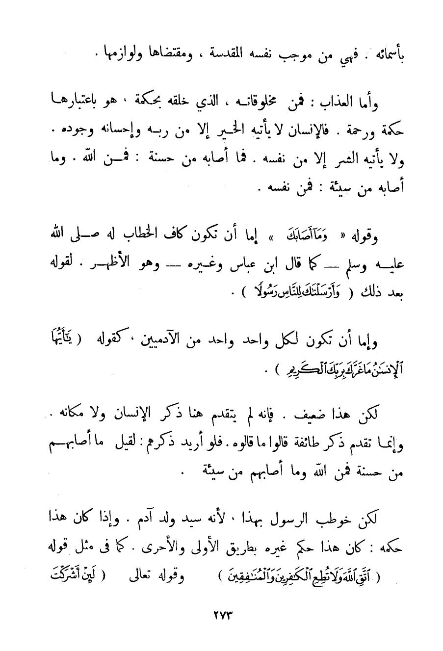 بِأَسْمَائِهِ. فَهِيَ مِنْ مُوجِبِ نَفْسِهِ الْمُقَدَّسَةِ، وَمُقْتَضَاهَا وَلَوَازِمِهَا. وَأَمَّا الْعَذَابُ: فَمِنْ مَخْلُوقَاتِهِ، الَّذِي خَلَقَهُ بِحِكْمَةِ، هُوَ بِاعْتِبَارِهَا حِكْمَةٌ وَرَحْمَةٌ. فَالْإِنْسَانُ لَا يَأْتِيهِ الْخَيْرُ إلَّا مِنْ رَبِّهِ وَإِحْسَانِهِ وَجُودِهِ. وَلَا يَأْتِيهِ الشَّرُّ إلَّا مِنْ نَفْسِهِ. فَمَا أَصَابَهُ مِنْ حَسَنَةٍ: فَمِنْ اللَّهِ. وَمَا أَصَابَهُ مِنْ سَيِّئَةٍ: فَمِنْ نَفْسِهِ. وَقَوْلُهُ {وَمَا أَصَابَكَ} إمَّا أَنْ تَكُونَ كَافُ الْخِطَابِ لَهُ صَلَّى اللَّهُ عَلَيْهِ وَسَلَّمَ - كَمَا قَالَ ابْنُ عَبَّاسٍ وَغَيْرُهُ - وَهُوَ الْأَظْهَرُ. لِقَوْلِهِ بَعْدَ ذَلِك {وَأَرْسَلْنَاكَ لِلنَّاسِ رَسُولًا} . وَإِمَّا أَنْ تَكُونَ لِكُلِّ وَاحِدٍ مِنْ الْآدَمِيِّينَ، كَقَوْلِهِ {يَا أَيُّهَا الْإِنْسَانُ مَا غَرَّكَ بِرَبِّكَ الْكَرِيمِ} . لَكِنَّ هَذَا ضَعِيفٌ. فَإِنَّهُ لَمْ يَتَقَدَّمُ هُنَا ذِكْرُ الْإِنْسَانِ وَلَا مَكَانُهُ. وَإِنَّمَا تَقَدَّمَ ذِكْرُ طَائِفَةٍ قَالُوا مَا قَالُوهُ. فَلَوْ أُرِيدَ ذِكْرُهُمْ: لَقِيلَ مَا أَصَابَهُمْ مِنْ حَسَنَةٍ فَمِنْ اللَّهِ وَمَا أَصَابَهُمْ مِنْ سَيِّئَةٍ. لَكِنْ خُوطِبَ الرَّسُولُ بِهَذَا، لِأَنَّهُ سَيِّدُ وَلَدِ آدَمَ. وَإِذَا كَانَ هَذَا حُكْمَهُ: كَانَ هَذَا حُكْمَ غَيْرِهِ بِطَرِيقِ الْأَوْلَى وَالْأَحْرَى. كَمَا فِي مِثْلِ قَوْلِهِ {اتَّقِ اللَّهَ وَلَا تُطِعِ الْكَافِرِينَ وَالْمُنَافِقِينَ} ، وَقَوِلِهِ تَعَالَى {لَئِنْ أَشْرَكْتَ