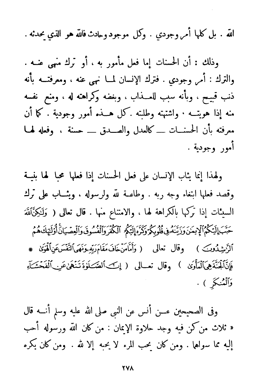 اللَّهِ. بَلْ كُلُّهَا أَمْرٌ وُجُودِيٌّ. وَكُلُّ مَوْجُودٍ وَحَادِثٍ فَاَللَّهُ هُوَ الَّذِي يُحْدِثُهُ. وَذَلِك: أَنَّ الْحَسَنَاتِ إمَّا فِعْلٌ مَأْمُورٌ بِهِ، أَوْ تَرْكٌ مَنْهِيٌّ عَنْهُ. وَالتَّرْكُ: أَمْرٌ وُجُودِيٌّ. فَتَرْكُ الْإِنْسَانِ لِمَا نُهِيَ عَنْهُ، وَمُعْرِفَتُهُ بِأَنَّهُ ذَنْبٌ قَبِيحٌ، وَبِأَنَّهُ سَبَبٌ لِلْعَذَابِ، وَبُغْضُهُ وَكَرَاهَتُهُ لَهُ، وَمَنْعُ نَفْسِهِ مِنْهُ إذَا هَوِيَتْهُ، وَاشْتَهَتْهُ وَطَلَبَتْهُ. كُلُّ هَذِهِ أُمُورٌ وُجُودِيَّةٌ. كَمَا أَنَّ مُعْرِفَتَهُ بِأَنَّ الْحَسَنَاتِ - كَالْعَدْلِ وَالصِّدْقِ - حَسَنَةٌ، وَفِعْلَهُ لَهَا أُمُورٌ وُجُودِيَّةٌ. وَلِهَذَا إنَّمَا يُثَابُ الْإِنْسَانُ عَلَى فِعْلِ الْحَسَنَاتِ إذَا فَعَلَهَا مُحِبًّا لَهَا بِنِيَّةِ وَقَصَدَ فِعْلَهَا ابْتِغَاءَ وَجْهِ رَبِّهِ. وَطَاعَةً لِلَّهِ وَلِرَسُولِهِ، وَيُثَابُ عَلَى تَرْكِ السَّيِّئَاتِ إذَا تَرَكَهَا بِالْكَرَاهَةِ لَهَا، وَالِامْتِنَاعِ مِنْهَا. قَالَ تَعَالَى {وَلَكِنَّ اللَّهَ حَبَّبَ إلَيْكُمُ الْإِيمَانَ وَزَيَّنَهُ فِي قُلُوبِكُمْ وَكَرَّهَ إلَيْكُمُ الْكُفْرَ وَالْفُسُوقَ وَالْعِصْيَانَ أُولَئِكَ هُمُ الرَّاشِدُونَ} وَقَالَ تَعَالَى {وَأَمَّا مَنْ خَافَ مَقَامَ رَبِّهِ وَنَهَى النَّفْسَ عَنِ الْهَوَى} {فَإِنَّ الْجَنَّةَ هِيَ الْمَأْوَى} وَقَالَ تَعَالَى {إنَّ الصَّلَاةَ تَنْهَى عَنِ الْفَحْشَاءِ وَالْمُنْكَرِ} . وَفِي الصَّحِيحَيْنِ عَنْ أَنَسٍ عَنْ النَّبِيِّ صَلَّى اللَّهُ عَلَيْهِ وَسَلَّمَ أَنَّهُ قَالَ {ثَلَاثٌ مَنْ كُنَّ فِيهِ وَجَدَ حَلَاوَةَ الْإِيمَانِ: مَنْ كَانَ اللَّهُ وَرَسُولُهُ أَحَبَّ إلَيْهِ مِمَّا سِوَاهُمَا. وَمَنْ كَانَ يُحِبُّ الْمَرْءَ لَا يُحِبُّهُ إلَّا لِلَّهِ. وَمَنْ كَانَ يَكْرَهُ