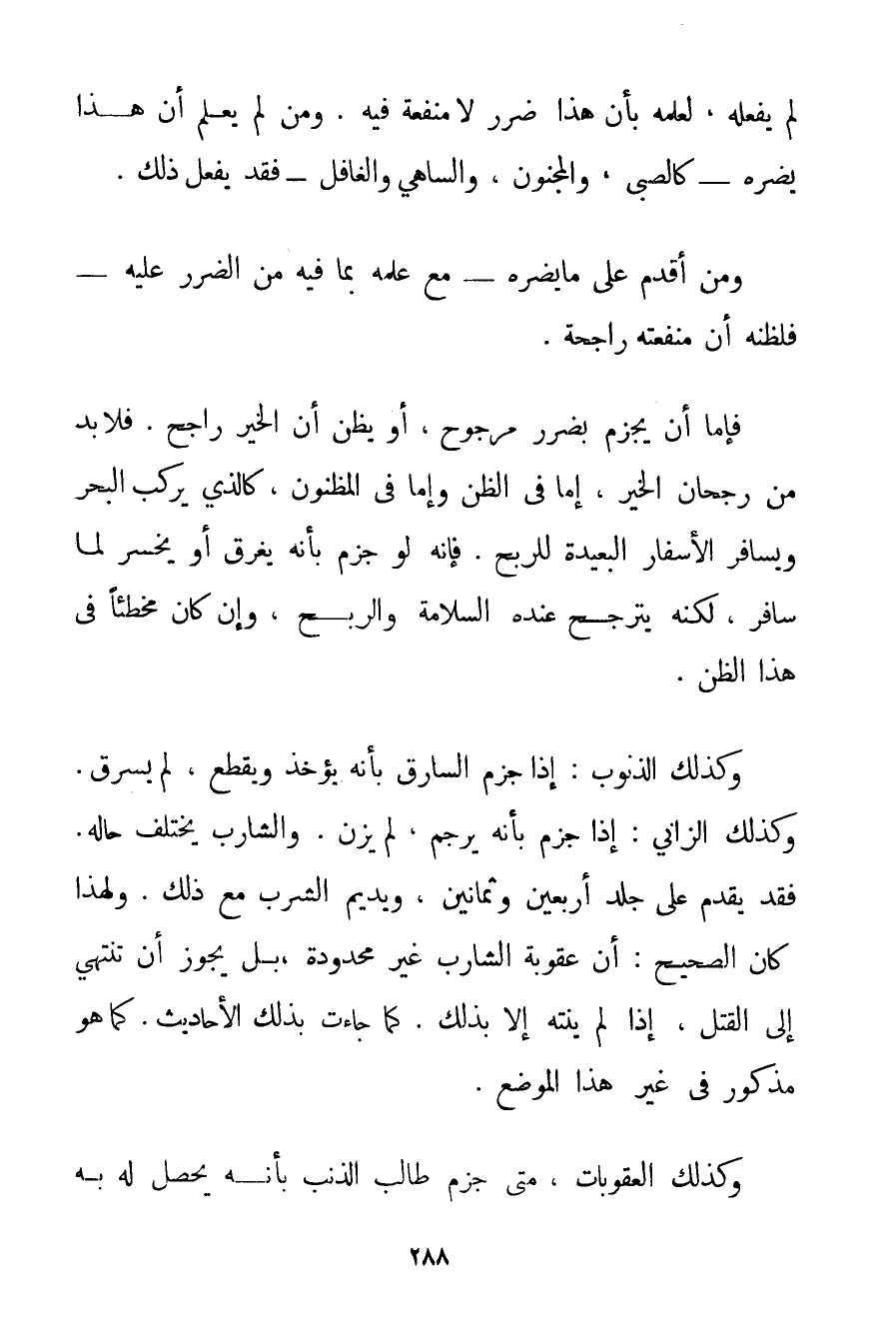 لَمْ يَفْعَلْهُ، لِعِلْمِهِ بِأَنَّ هَذَا ضَرَرٌ لَا مَنْفَعَةَ فِيهِ. وَمَنْ لَمْ يَعْلَمْ أَنَّ هَذَا يَضُرُّهُ - كَالصَّبِيِّ، وَالْمَجْنُونِ، وَالسَّاهِي وَالْغَافِلِ - فَقَدْ يَفْعَلُ ذَلِك. وَمَنْ أَقْدَمَ عَلَى مَا يَضُرُّهُ - مَعَ عِلْمِهِ بِمَا فِيهِ مِنْ الضَّرَرِ عَلَيْهِ - فَلِظَنِّهِ أَنَّ مَنْفَعَتَهُ رَاجِحَةٌ. فَإِمَّا أَنْ يَجْزِمَ بِضَرَرِ مَرْجُوحٍ، أَوْ يَظُنَّ أَنَّ الْخَيْرَ رَاجِحٌ. فَلَا بُدَّ مِنْ رُجْحَانِ الْخَيْرِ، إمَّا فِي الظَّنِّ وَإِمَّا فِي الْمَظْنُونِ، كَاَلَّذِي يَرْكَبُ الْبَحْرَ وَيُسَافِرُ الْأَسْفَارَ الْبَعِيدَةَ لِلرِّبْحِ. فَإِنَّهُ لَوْ جَزَمَ بِأَنَّهُ يَغْرَقُ أَوْ يَخْسِرُ لَمَا سَافَرَ، لَكِنَّهُ يَتَرَجَّحُ عِنْدَهُ السِّلَامَةُ وَالرِّبْحُ، وَإِنْ كَانَ مُخْطِئًا فِي هَذَا الظَّنِّ. وَكَذَلِك الذُّنُوبُ: إذَا جَزَمَ السَّارِقُ بِأَنَّهُ يُؤْخَذُ وَيُقْطَعُ، لَمْ يَسْرِقْ. وَكَذَلِك الزَّانِي: إذَا جَزَمَ بِأَنَّهُ يُرْجَمُ، لَمْ يَزْنِ. وَالشَّارِبُ يَخْتَلِفُ حَالُهُ. فَقَدْ يُقَدَّمُ عَلَى جَلْدِ أَرْبَعِينَ وَثَمَانِينَ، وَيُدِيمُ الشُّرْبَ مَعَ ذَلِك. وَلِهَذَا كَانَ الصَّحِيحُ: أَنَّ عُقُوبَةَ الشَّارِبِ غَيْرُ مَحْدُودَةٍ، بَلْ يَجُوزُ أَنْ تَنْتَهِي إلَى الْقَتْلِ، إذَا لَمْ يَنْتَهِ إلَّا بِذَلِك. كَمَا جَاءَتْ بِذَلِك الْأَحَادِيثُ. كَمَا هُوَ مَذْكُورٌ فِي غَيْرِ هَذَا الْمَوْضِعِ. وَكَذَلِك الْعُقُوبَاتُ، مَتَى جَزَمَ طَالِبُ الذَّنْبِ بِأَنَّهُ يَحْصُلُ لَهُ بِهِ