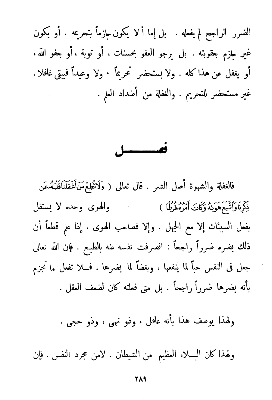 فَالْغَفْلَةُ وَالشَّهْوَةُ أَصْلُ الشَّرِّ. قَالَ تَعَالَى {وَلَا تُطِعْ مَنْ أَغْفَلْنَا قَلْبَهُ عَنْ ذِكْرِنَا وَاتَّبَعَ هَوَاهُ وَكَانَ أَمْرُهُ فُرُطًا} وَالْهَوَى وَحْدَهُ لَا يَسْتَقِلُّ بِفِعْلِ السَّيِّئَاتِ إلَّا مَعَ الْجَهْلِ. وَإِلَّا فَصَاحِبُ الْهَوَى، إذَا عَلِمَ قَطْعًا أَنَّ ذَلِك يَضُرُّهُ ضَرَرًا رَاجِحًا: انْصَرَفَتْ نَفْسُهُ عَنْهُ بِالطَّبْعِ. فَإِنَّ اللَّهَ تَعَالَى جَعَلَ فِي النَّفْسِ حُبًّا لِمَا يَنْفَعُهَا، وَبُغْضًا لِمَا يَضُرُّهَا. فَلَا تَفْعَلُ مَا تَجْزِمُ بِأَنَّهُ يَضُرُّهَا ضَرَرًا رَاجِحًا. بَلْ مَتَى فَعَلَتْهُ كَانَ لِضَعْفِ الْعَقْلِ. وَلِهَذَا يُوصَفُ هَذَا بِأَنَّهُ عَاقِلٌ، وَذُو نُهًى، وَذُو حِجًا. وَلِهَذَا كَانَ الْبَلَاءُ الْعَظِيمُ مِنْ الشَّيْطَانِ. لَا مِنْ مُجَرَّدِ النَّفْسِ. فَإِنَّ