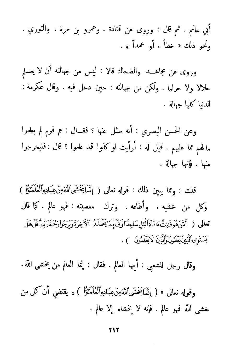 أَبِي حَاتِمٍ. ثُمَّ قَالَ: وَرُوِيَ عَنْ قتادة، وَعَمْرِو بْنِ مُرَّةَ، وَالثَّوْرِيِّ، وَنَحْوِ ذَلِك " خَطَأٌ، أَوْ عَمْدًا ". وَرُوِيَ عَنْ مُجَاهَدٍ وَالضَّحَّاكِ قَالَا: لَيْسَ مِنْ جَهَالَتِهِ أَنْ لَا يَعْلَمَ حَلَالًا وَلَا حَرَامًا. وَلَكِنْ مِنْ جَهَالَتِهِ: حِينَ دَخَلَ فِيهِ. وَقَالَ عِكْرِمَةُ: الدُّنْيَا كُلُّهَا جَهَالَةٌ وَعَنْ الْحَسَنِ الْبَصْرِيِّ: أَنَّهُ سُئِلَ عَنْهَا؟ فَقَالَ: هُمْ قَوْمٌ لَمْ يَعْلَمُوا مَا لَهُمْ مِمَّا عَلَيْهِمْ. قِيلَ لَهُ: أَرَأَيْت لَوْ كَانُوا قَدْ عَلِمُوا؟ قَالَ: فَلْيَخْرُجُوا مِنْهَا. فَإِنَّهَا جَهَالَةٌ. قُلْت: وَمِمَّا يُبَيِّنُ ذَلِك: قَوْله تَعَالَى {إنَّمَا يَخْشَى اللَّهَ مِنْ عِبَادِهِ الْعُلَمَاءُ} وَكُلُّ مَنْ خَشِيَهُ، وَأَطَاعَهُ، وَتَرَكَ مَعْصِيَتَهُ: فَهُوَ عَالِمٌ. كَمَا قَالَ تَعَالَى {أَمْ مَنْ هُوَ قَانِتٌ آنَاءَ اللَّيْلِ سَاجِدًا وَقَائِمًا يَحْذَرُ الْآخِرَةَ وَيَرْجُو رَحْمَةَ رَبِّهِ قُلْ هَلْ يَسْتَوِي الَّذِينَ يَعْلَمُونَ وَالَّذِينَ لَا يَعْلَمُونَ} . وَقَالَ رَجُلٌ لِلشَّعْبِيِّ: أَيُّهَا الْعَالِمُ. فَقَالَ: إنَّمَا الْعَالِمُ مَنْ يَخْشَى اللَّهَ. قَوْله تَعَالَى {إنَّمَا يَخْشَى اللَّهَ مِنْ عِبَادِهِ الْعُلَمَاءُ} يَقْتَضِي أَنَّ كُلَّ مَنْ خَشِيَ اللَّهَ فَهُوَ عَالِمٌ. فَإِنَّهُ لَا يَخْشَاهُ إلَّا عَالِمٌ.
