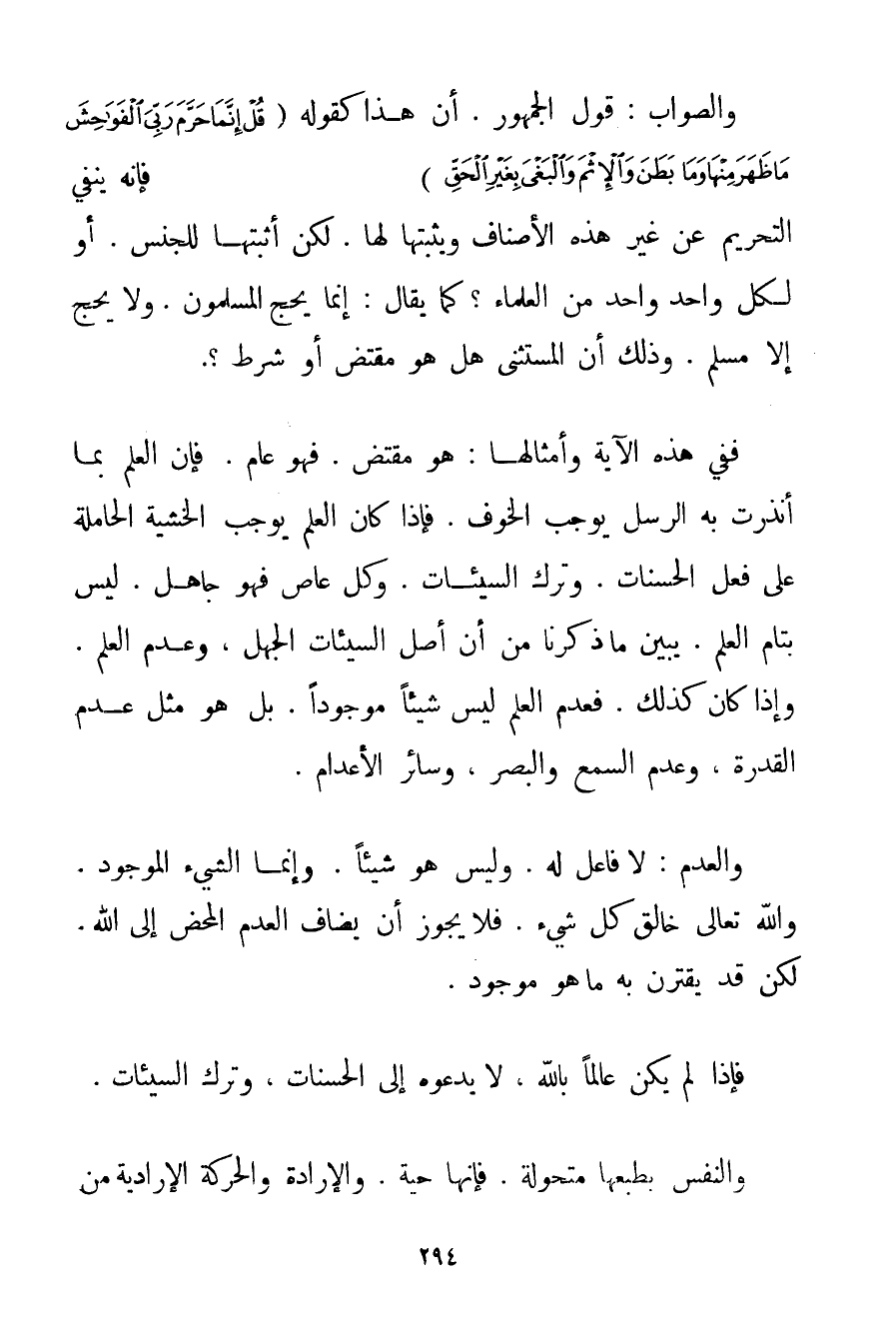 وَالصَّوَابُ: قَوْلُ الْجُمْهُورِ. أَنَّ هَذَا كَقَوْلِهِ {قُلْ إنَّمَا حَرَّمَ رَبِّيَ الْفَوَاحِشَ مَا ظَهَرَ مِنْهَا وَمَا بَطَنَ وَالْإِثْمَ وَالْبَغْيَ بِغَيْرِ الْحَقِّ} فَإِنَّهُ يَنْفِي التَّحْرِيمَ عَنْ غَيْرِ هَذِهِ الْأَصْنَافِ وَيُثْبِتُهَا لَهَا. لَكِنْ أَثَبَتَهَا لِلْجِنْسِ. أَوْ لِكُلِّ وَاحِدٍ مِنْ الْعُلَمَاءِ؟ كَمَا يُقَالُ: إنَّمَا يَحُجُّ الْمُسْلِمُونَ. وَلَا يَحُجُّ إلَّا مُسْلِمٌ. وَذَلِك أَنَّ الْمُسْتَثْنَى هَلْ هُوَ مُقْتَضٍ أَوْ شَرْطٌ؟ . فَفِي هَذِهِ الْآيَةِ وَأَمْثَالِهَا: هُوَ مُقْتَضٍ. فَهُوَ عَامٌّ. فَإِنَّ الْعِلْمَ بِمَا أَنَذَرَتْ بِهِ الرُّسُلُ يُوجِبُ الْخَوْفَ. فَإِذَا كَانَ الْعِلْمُ يُوجِبُ الْخَشْيَةَ الْحَامِلَةَ عَلَى فِعْلِ الْحَسَنَاتِ. وِتْرِك السَّيِّئَاتِ. وَكُلُّ عَاصٍ فَهُوَ جَاهِلٌ. لَيْسَ بِتَامِّ الْعِلْمِ. يُبَيِّنُ مَا ذَكَرْنَا مِنْ أَنَّ أَصْلَ السَّيِّئَاتِ الْجَهْلُ، وَعَدَمُ الْعِلْمِ. وَإِذَا كَانَ كَذَلِكَ. فَعَدَمُ الْعِلْمِ لَيْسَ شَيْئًا مَوْجُودًا. بَلْ هُوَ مِثْلُ عَدَمِ الْقُدْرَةِ، وَعَدَمِ السَّمْعِ وَالْبَصَرِ، وَسَائِرِ الأعدام. وَالْعَدَمُ: لَا فَاعِلَ لَهُ. وَلَيْسَ هُوَ شَيْئًا. وَإِنَّمَا الشَّيْءُ الْمَوْجُودُ. وَاَللَّهُ تَعَالَى خَالِقُ كُلِّ شَيْءٍ. فَلَا يَجُوز أَنْ يُضَافَ الْعَدَمُ الْمَحْضُ إلَى اللَّهِ. لَكِنْ قَدْ يَقْتَرِنُ بِهِ مَا هُوَ مَوْجُودٌ. فَإِذَا لَمْ يَكُنْ عَالِمًا بِاَللَّهِ، لَا يَدْعُوهُ إلَى الْحَسَنَاتِ، وَتَرْكِ السَّيِّئَاتِ. وَالنَّفْسُ بِطَبْعِهَا مُتَحَوِّلَةٌ. فَإِنَّهَا حَيَّةٌ. وَالْإِرَادَةُ وَالْحَرَكَةُ الْإِرَادِيَّةُ مِنْ