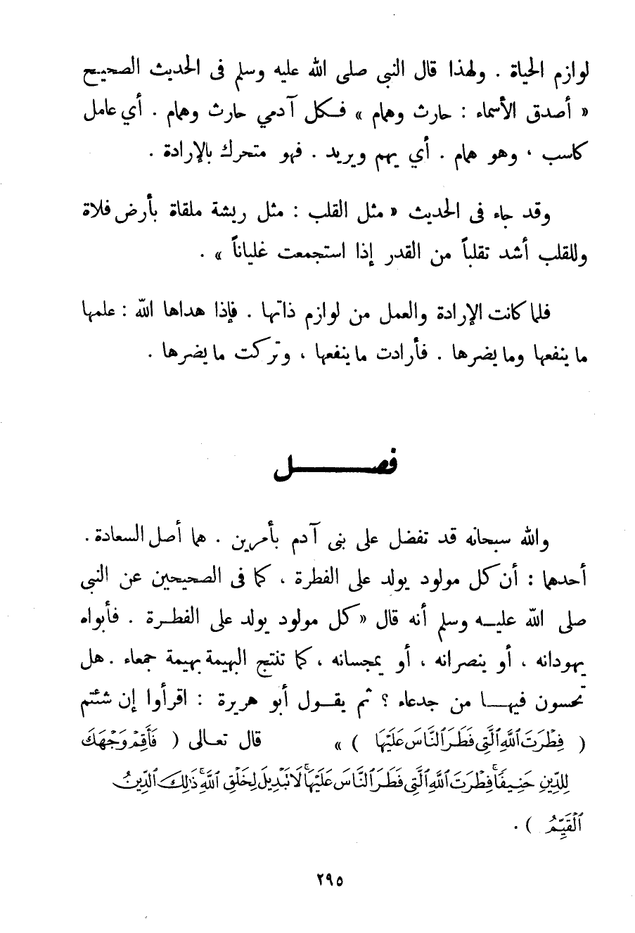 لَوَازِمِ الْحَيَاةِ. وَلِهَذَا قَالَ النَّبِيُّ صَلَّى اللَّهُ عَلَيْهِ وَسَلَّمَ فِي الْحَدِيثِ الصَّحِيحِ {أَصْدَقُ الْأَسْمَاءِ: حَارِثٌ وَهَمَّامٌ} فَكُلُّ آدَمِيٍّ حَارِثٌ وَهَمَّامٌ. أَيْ عَامِلٌ كَاسِبٌ، وَهُوَ هَمَّامٌ. أَيْ يَهِمُّ وَيُرِيدُ. فَهُوَ مُتَحَرِّكٌ بِالْإِرَادَةِ. وَقَدْ جَاءَ فِي الْحَدِيثِ {مَثَلُ الْقَلْبِ: مَثَلُ رِيشَةٍ مُلْقَاةٍ بِأَرْضِ فَلَاةٍ وَلَلْقَلْبُ أَشَدُّ تَقَلُّبًا مِنْ الْقِدْرِ إذَا اُسْتُجْمِعَتْ غَلَيَانًا} . فَلَمَّا كَانَتْ الْإِرَادَةُ وَالْعَمَلُ مِنْ لَوَازِمِ ذَاتِهَا. فَإِذَا هَدَاهَا اللَّهُ: عَلَّمَهَا مَا يَنْفَعُهَا وَمَا يَضُرُّهَا. فَأَرَادَتْ مَا يَنْفَعُهَا، وَتَرَكَتْ مَا يَضُرُّهَا.