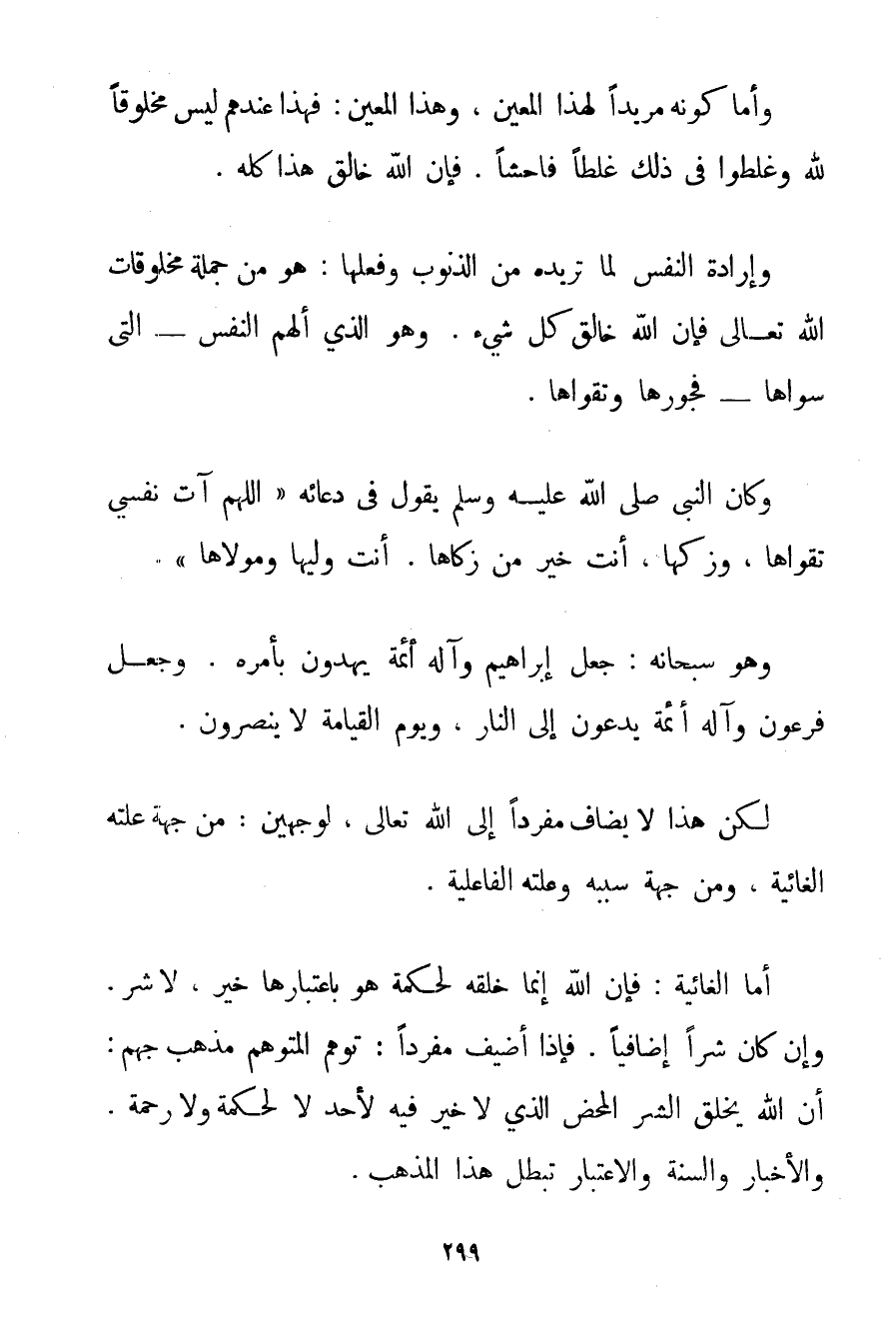 وَأَمَّا كَوْنُهُ مُرِيدًا لِهَذَا الْمُعَيَّنِ وَهَذَا الْمُعَيَّنُ: فَهَذَا عِنْدَهُمْ لَيْسَ مَخْلُوقًا لِلَّهِ وَغَلِطُوا فِي ذَلِكَ غَلَطًا فَاحِشًا. فَإِنَّ اللَّهَ خَالِقُ هَذَا كُلِّهِ. وَإِرَادَةُ النَّفْسِ لِمَا تُرِيدُهُ مِنْ الذُّنُوبِ وَفِعْلِهَا: هُوَ مِنْ جُمْلَةِ مَخْلُوقَاتِ اللَّهِ تَعَالَى فَإِنَّ اللَّهَ خَالِقُ كُلِّ شَيْءٍ. وَهُوَ الَّذِي أَلْهَمَ النَّفْسَ - الَّتِي سَوَّاهَا - فُجُورَهَا وَتَقْوَاهَا. {وَكَانَ النَّبِيُّ صَلَّى اللَّهُ عَلَيْهِ وَسَلَّمَ يَقُولُ فِي دُعَائِهِ اللَّهُمَّ آتِ نَفْسِي تَقْوَاهَا وَزَكِّهَا أَنْتَ خَيْرُ مَنْ زَكَّاهَا. أَنْتَ وَلِيُّهَا وَمَوْلَاهَا} . وَهُوَ سُبْحَانَهُ: جَعَلَ إبْرَاهِيمَ وَآلَهُ أَئِمَّةً يَهْدُونَ بِأَمْرِهِ. وَجَعَلَ فِرْعَوْنَ وَآلَهُ أَئِمَّةً يَدْعُونَ إلَى النَّارِ وَيَوْمَ الْقِيَامَةِ لَا يُنْصَرُونَ. لَكِنَّ هَذَا لَا يُضَافُ مُفْرَدًا إلَى اللَّهِ تَعَالَى لِوَجْهَيْنِ: مِنْ جِهَةِ عِلَّتِهِ الغائية وَمِنْ جِهَةِ سَبَبِهِ وَعِلَّتِهِ الْفَاعِلِيَّةِ. أَمَّا الغائية: فَإِنَّ اللَّهَ إنَّمَا خَلَقَهُ لِحِكْمَةِ هُوَ بِاعْتِبَارِهَا خَيْرٌ لَا شَرٌّ. وَإِنْ كَانَ شَرًّا إضَافِيًّا. فَإِذَا أُضِيفَ مُفْرَدًا: تَوَهَّمَ الْمُتَوَهِّمُ مَذْهَبَ جَهْمٍ: أَنَّ اللَّهَ يَخْلُقُ الشَّرَّ الْمَحْضَ الَّذِي لَا خَيْرَ فِيهِ لِأَحَدِ لَا لِحِكْمَةِ وَلَا رَحْمَةٍ. وَالْأَخْبَارُ وَالسُّنَّةُ وَالِاعْتِبَارُ تُبْطِلُ هَذَا الْمَذْهَبَ.