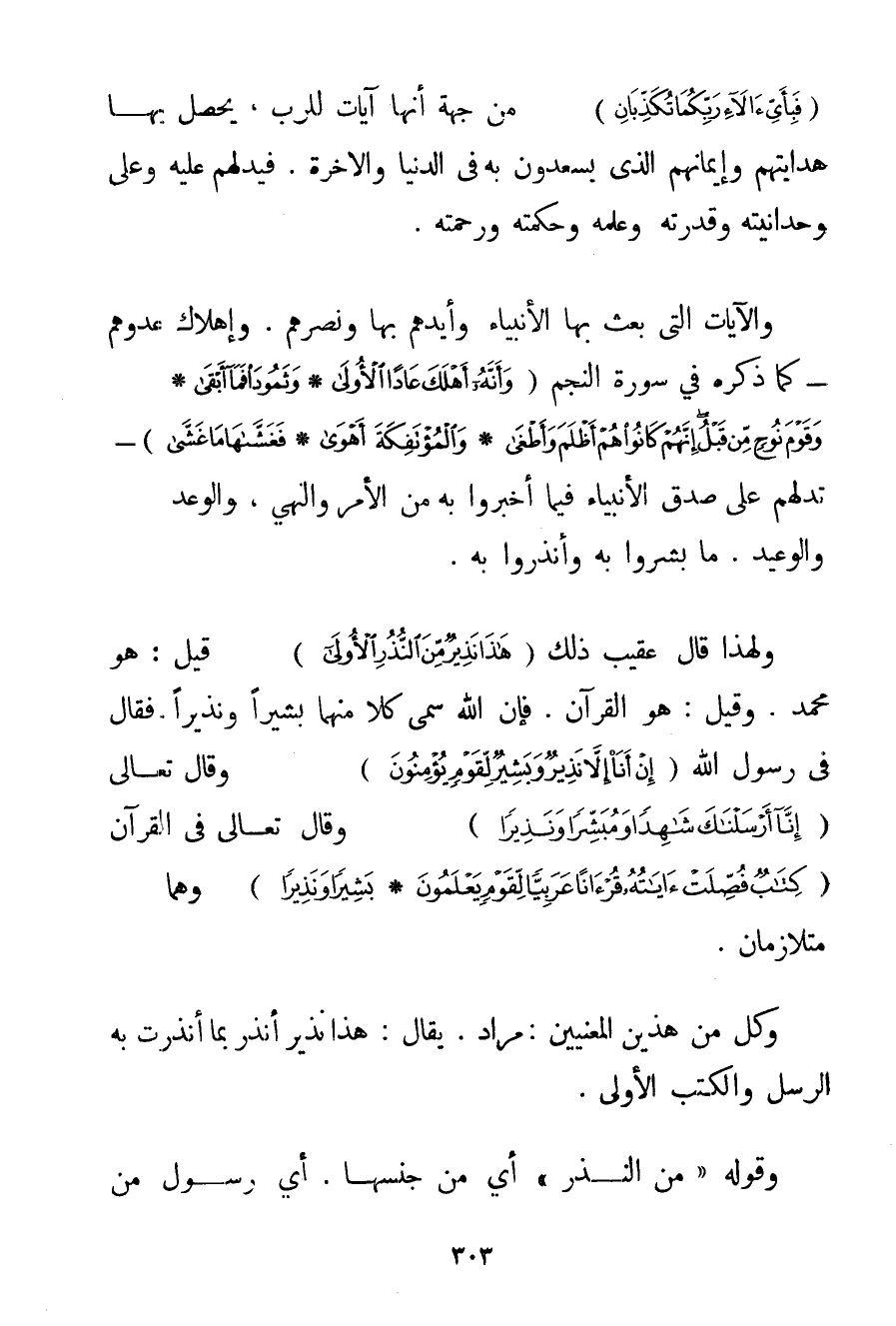 {فَبِأَيِّ آلَاءِ رَبِّكُمَا تُكَذِّبَانِ} مِنْ جِهَةِ أَنَّهَا آيَاتٌ لِلرَّبِّ يَحْصُلُ بِهَا هِدَايَتُهُمْ وَإِيمَانُهُمْ الَّذِي يَسْعَدُونَ بِهِ فِي الدُّنْيَا وَالْآخِرَةِ. فَيَدُلُّهُمْ عَلَيْهِ وَعَلَى وَحْدَانِيِّتِهِ وَقُدْرَتِهِ وَعِلْمِهِ وَحِكْمَتِهِ وَرَحْمَتِهِ. وَالْآيَاتُ الَّتِي بَعَثَ بِهَا الْأَنْبِيَاءَ وَأَيَّدَهُمْ بِهَا وَنَصَرَهُمْ. وَإِهْلَاكُ عَدُوِّهِمْ - كَمَا ذَكَرَهُ فِي سُورَةِ النَّجْمِ {وَأَنَّهُ أَهْلَكَ عَادًا الْأُولَى} {وَثَمُودَ فَمَا أَبْقَى} {وَقَوْمَ نُوحٍ مِنْ قَبْلُ إنَّهُمْ كَانُوا هُمْ أَظْلَمَ وَأَطْغَى} {وَالْمُؤْتَفِكَةَ أَهْوَى} {فَغَشَّاهَا مَا غَشَّى} - تَدُلُّهُمْ عَلَى صِدْقِ الْأَنْبِيَاءِ فِيمَا أَخْبَرُوا بِهِ مِنْ الْأَمْرِ وَالنَّهْيِ وَالْوَعْدِ وَالْوَعِيدِ. مَا بَشَّرُوا بِهِ وَأَنْذَرُوا بِهِ. وَلِهَذَا قَالَ عَقِيبَ ذَلِكَ {هَذَا نَذِيرٌ مِنَ النُّذُرِ الْأُولَى} قِيلَ: هُوَ مُحَمَّدٌ. وَقِيلَ: هُوَ الْقُرْآنُ. فَإِنَّ اللَّهَ سَمَّى كُلًّا مِنْهُمَا بَشِيرًا وَنَذِيرًا. فَقَالَ فِي رَسُولِ اللَّهِ {إنْ أَنَا إلَّا نَذِيرٌ وَبَشِيرٌ لِقَوْمٍ يُؤْمِنُونَ} وَقَالَ تَعَالَى {إنَّا أَرْسَلْنَاكَ شَاهِدًا وَمُبَشِّرًا وَنَذِيرًا} وَقَالَ تَعَالَى فِي الْقُرْآنِ {كِتَابٌ فُصِّلَتْ آيَاتُهُ قُرْآنًا عَرَبِيًّا لِقَوْمٍ يَعْلَمُونَ} {بَشِيرًا وَنَذِيرًا} وَهُمَا مُتَلَازِمَانِ. وَكُلٌّ مِنْ هَذَيْنِ الْمَعْنَيَيْنِ: مُرَادٌ. يُقَالُ: هَذَا نَذِيرٌ أَنْذَرَ بِمَا أَنْذَرَتْ بِهِ الرُّسُلُ وَالْكُتُبُ الْأُولَى. وَقَوْلُهُ " مِنْ النُّذُرِ " أَيْ مِنْ جِنْسِهَا. أَيْ رَسُولٍ مِنْ