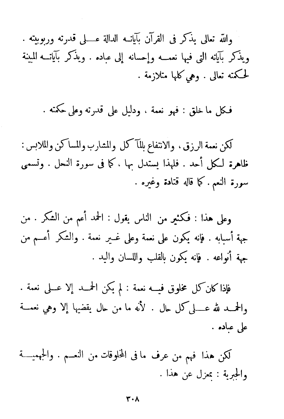 وَاَللَّهُ تَعَالَى يُذَكِّرُ فِي الْقُرْآنِ بِآيَاتِهِ الدَّالَّةِ عَلَى قُدْرَتِهِ وَرُبُوبِيَّتِهِ. وَيُذَكِّرُ بِآيَاتِهِ الَّتِي فِيهَا نِعَمُهُ وَإِحْسَانُهُ إلَى عِبَادِهِ. وَيُذَكِّرُ بِآيَاتِهِ الْمُبَيِّنَةِ لِحِكْمَتِهِ تَعَالَى. وَهِيَ كُلُّهَا مُتَلَازِمَةٌ. فَكُلُّ مَا خَلَقَ: فَهُوَ نِعْمَةٌ وَدَلِيلٌ عَلَى قُدْرَتِهِ وَعَلَى حِكْمَتِهِ. لَكِنْ نِعْمَةُ الرِّزْقِ وَالِانْتِفَاعِ بِالْمَآكِلِ وَالْمَشَارِبِ وَالْمَسَاكِنِ وَالْمَلَابِسِ: ظَاهِرَةٌ لِكُلِّ أَحَدٍ. فَلِهَذَا يُسْتَدَلُّ بِهَا كَمَا فِي سُورَةِ النَّحْلِ. وَتُسَمَّى سُورَةَ النِّعَمِ. كَمَا قَالَهُ قتادة وَغَيْرُهُ. وَعَلَى هَذَا: فَكَثِيرٌ مِنْ النَّاسِ يَقُولُ: الْحَمْدُ أَعَمُّ مِنْ الشُّكْرِ. مِنْ جِهَةِ أَسْبَابِهِ. فَإِنَّهُ يَكُونُ عَلَى نِعْمَةٍ وَعَلَى غَيْرِ نِعْمَةٍ. وَالشُّكْرُ أَعَمُّ مِنْ جِهَةِ أَنْوَاعِهِ. فَإِنَّهُ يَكُونُ بِالْقَلْبِ وَاللِّسَانِ وَالْيَدِ. فَإِذَا كَانَ كُلُّ مَخْلُوقٍ فِيهِ نِعْمَةٌ: لَمْ يَكُنْ الْحَمْدُ إلَّا عَلَى نِعْمَةٍ. وَالْحَمْدُ لِلَّهِ عَلَى كُلِّ حَال. لِأَنَّهُ مَا مِنْ حَالٍ يَقْضِيهَا إلَّا وَهِيَ نِعْمَةٌ عَلَى عِبَادِهِ. لَكِنْ هَذَا فَهْمُ مَنْ عَرَفَ مَا فِي الْمَخْلُوقَاتِ مِنْ النِّعَمِ. وَالْجَهْمِيَّة وَالْجَبْرِيَّةُ: بِمَعْزِلِ عَنْ هَذَا.